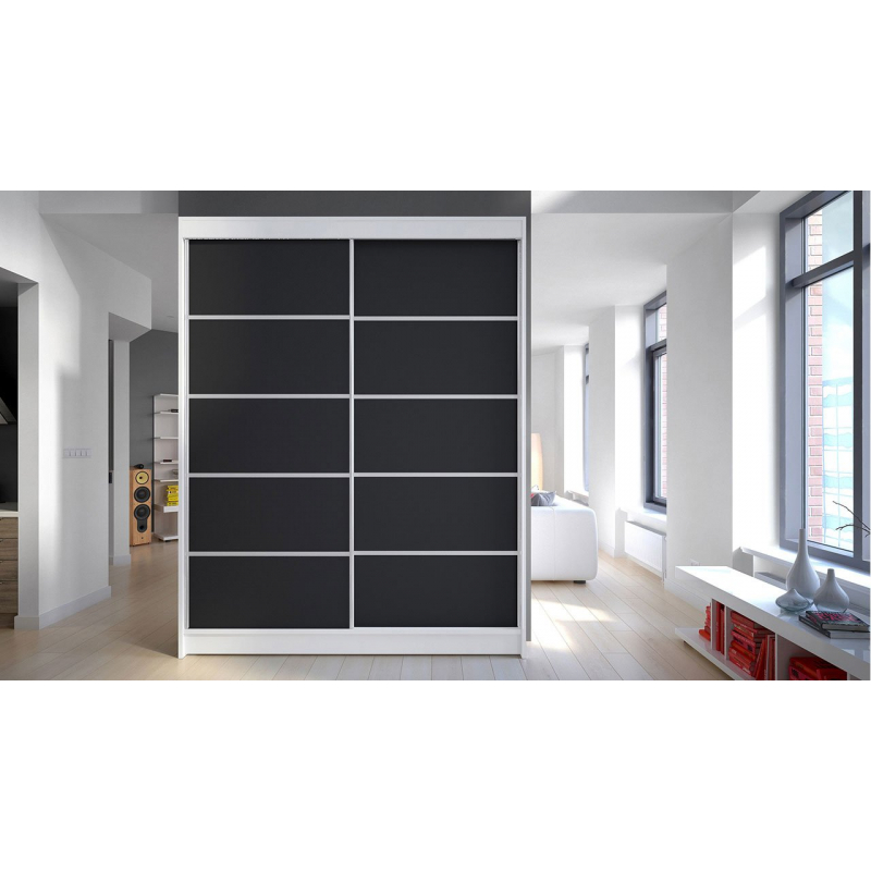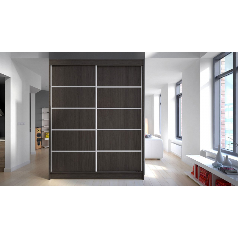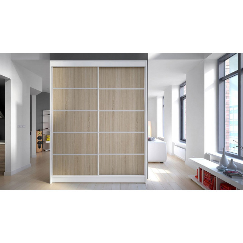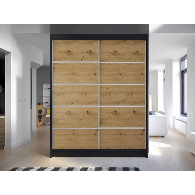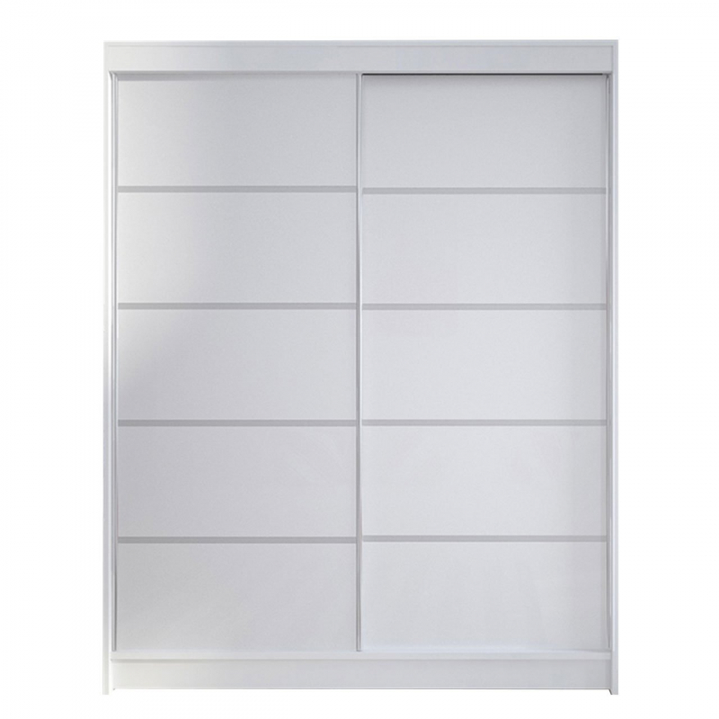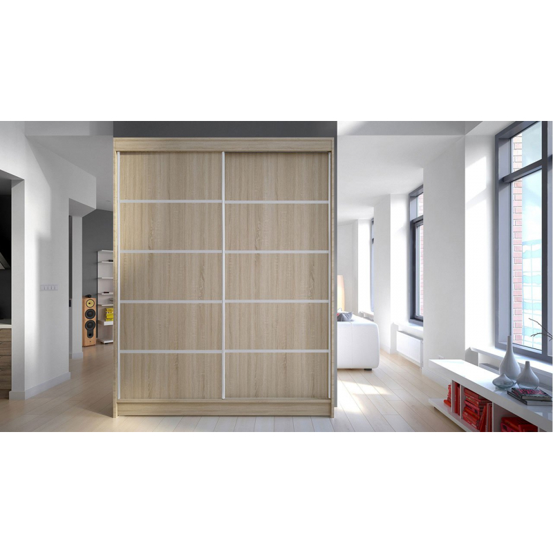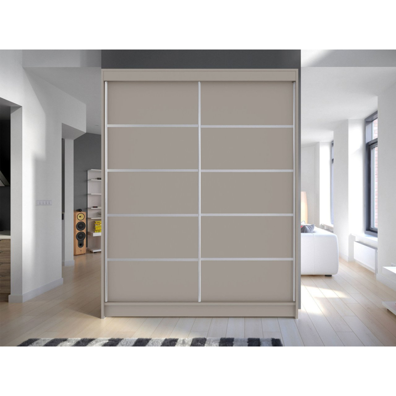 Posuvná skříň Belgium IV nabízí praktické uspořádání polic a závěsnou tyč. Posuvné dveře pracují zlehka a jejich otevírání usnadňuje rukojeť ve formě hliníkového pruhu, který vede podél dveří. Kliky dodávají šatníku moderní vzhled a brání v ohýbání dveří. Celková výška skříně je 200 cm a šířka 150 cm. Posuvné dveře mají kromě toho matný povrch, který je ozdoben dekorem tvořícím několik obdélníků. Vysoká kvalita šatníku je zajištěna použitím laminátové desky o tloušťce 16 mm.