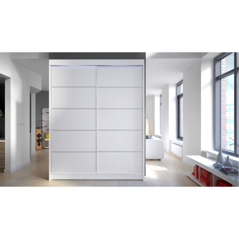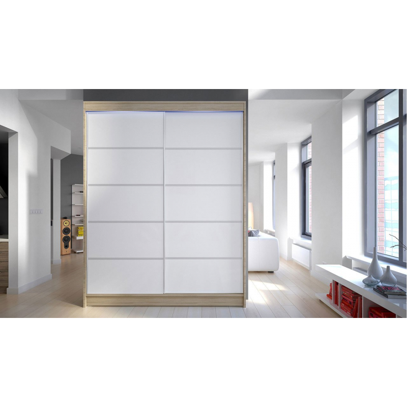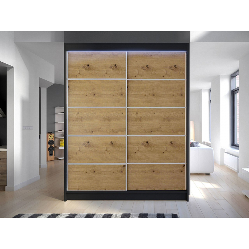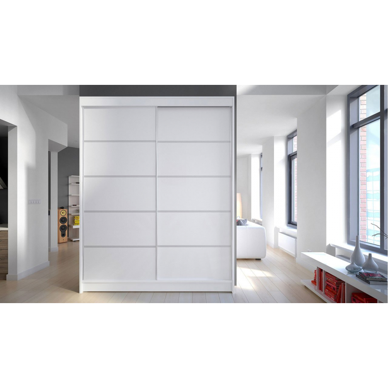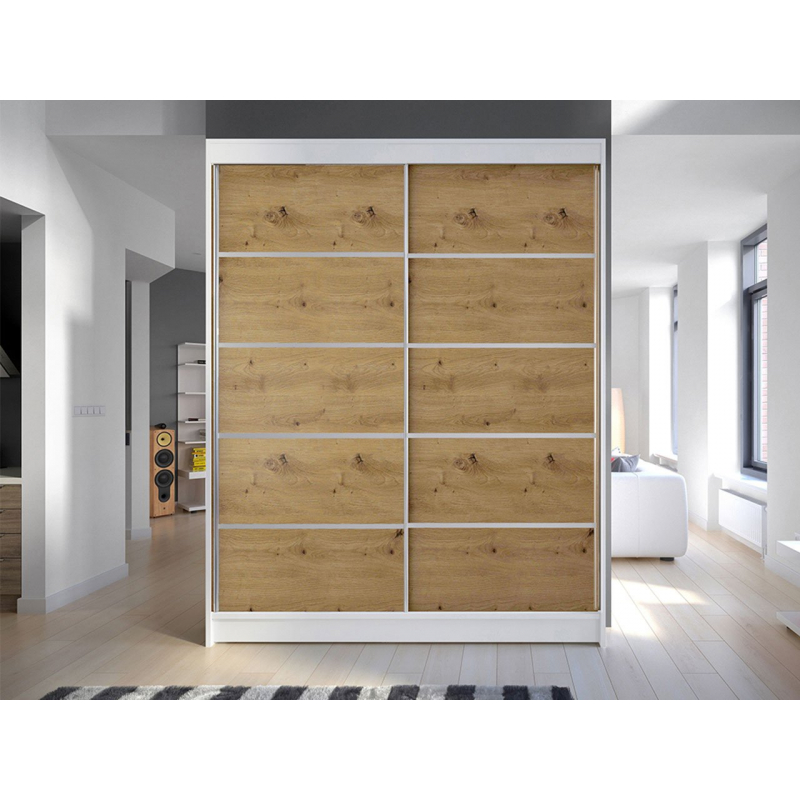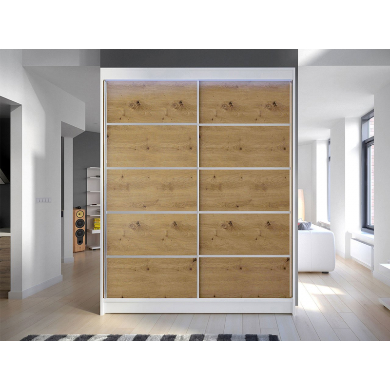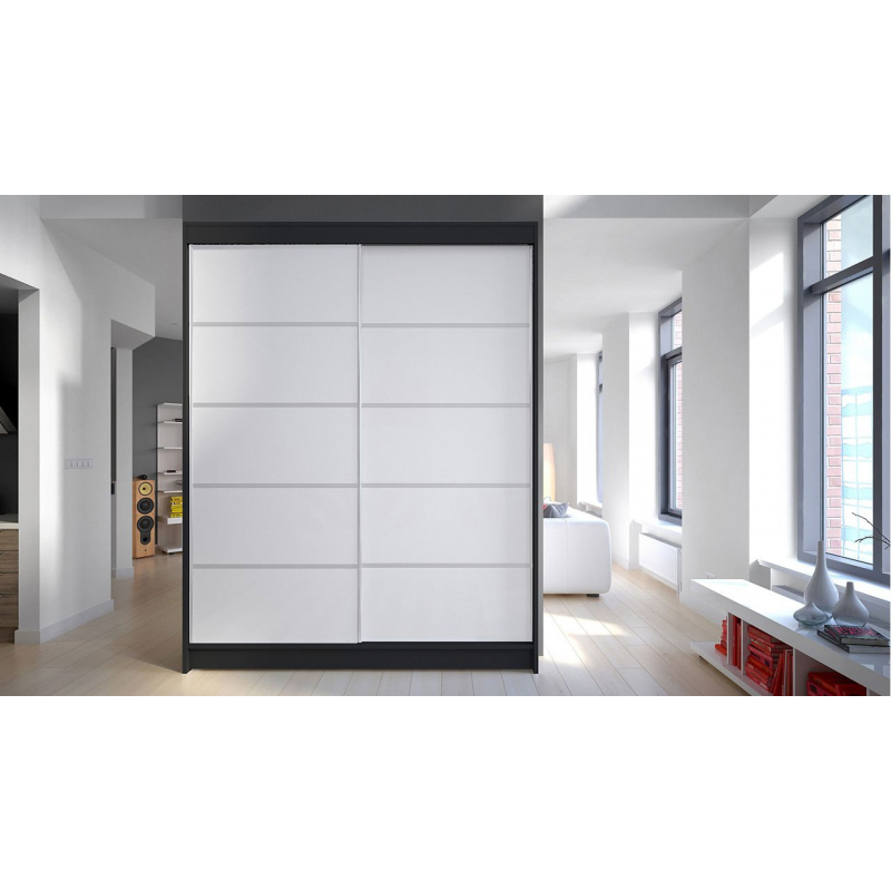 Posuvná skříň Belgium IV nabízí praktické uspořádání polic a závěsnou tyč. Posuvné dveře pracují zlehka a jejich otevírání usnadňuje rukojeť ve formě hliníkového pruhu, který vede podél dveří. Kliky dodávají šatníku moderní vzhled a brání v ohýbání dveří. Celková výška skříně je 200 cm a šířka 150 cm. Posuvné dveře mají kromě toho matný povrch, který je ozdoben dekorem tvořícím několik obdélníků. Vysoká kvalita šatníku je zajištěna použitím laminátové desky o tloušťce 16 mm.