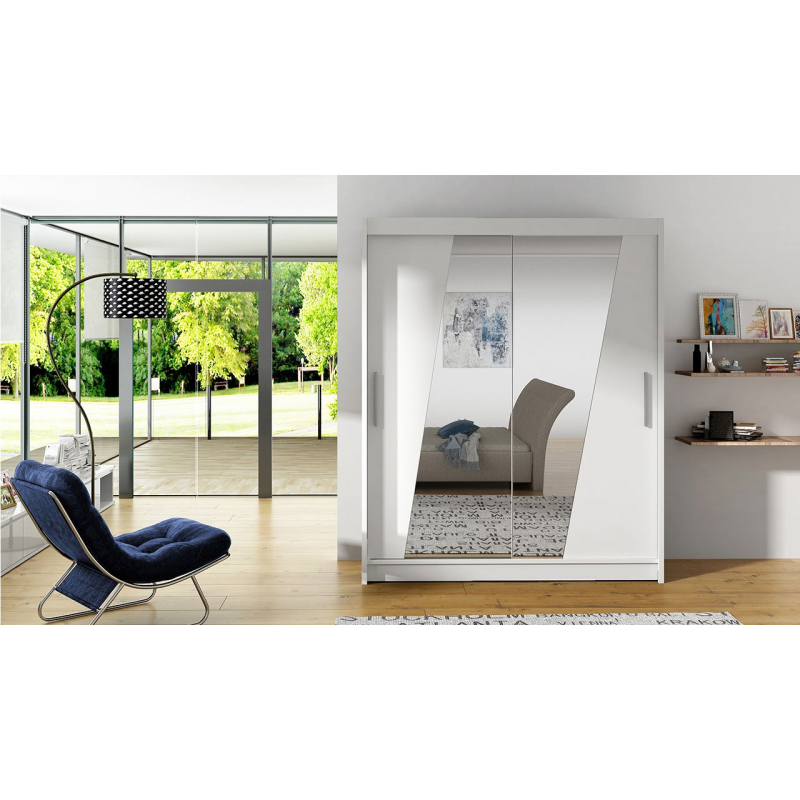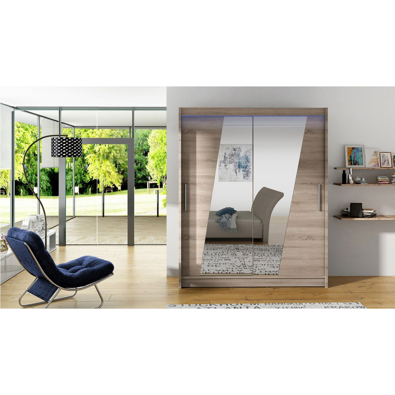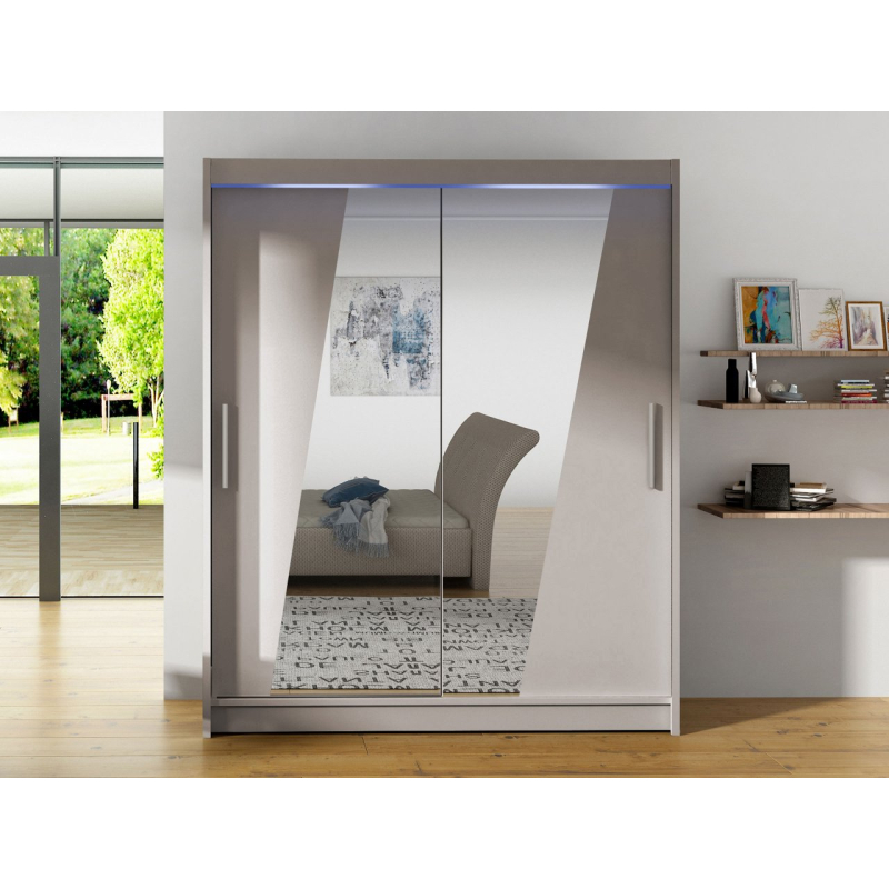 Možností zvýšení počtu věšáků je dlouhá lišta na šaty. Na druhé straně, středně velká zrcadla zdobící posuvné přední skříňky vám umožní vidět se před odjezdem a také příznivě zlepší optické rozměry místnosti. Posuvná skříň, jako další možnost, má také možnost nainstalovat vícebarevné LED osvětlení.
