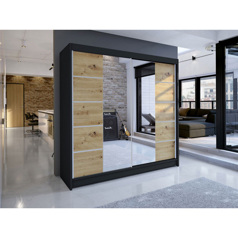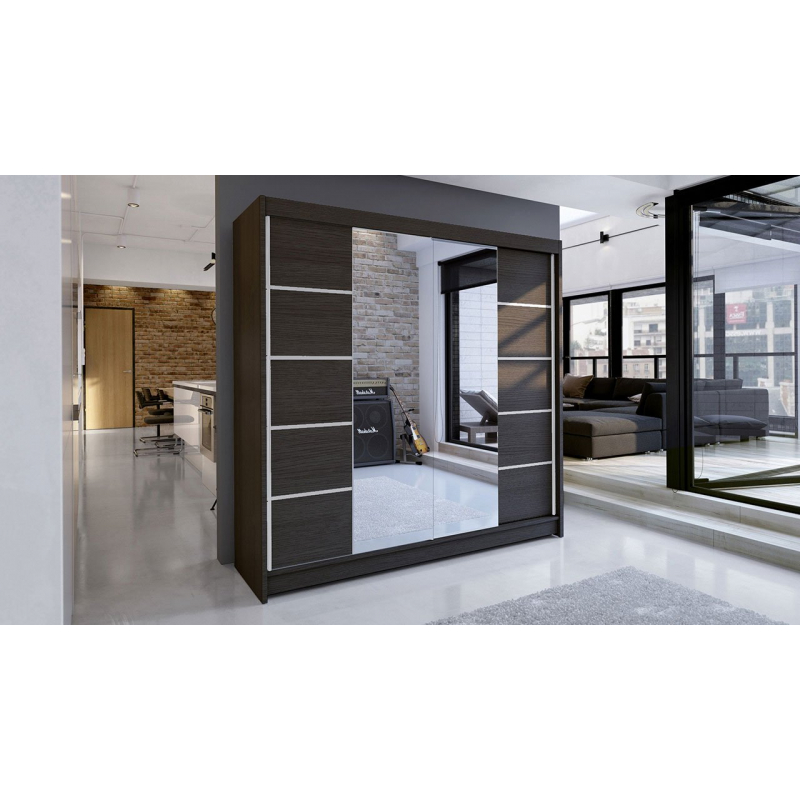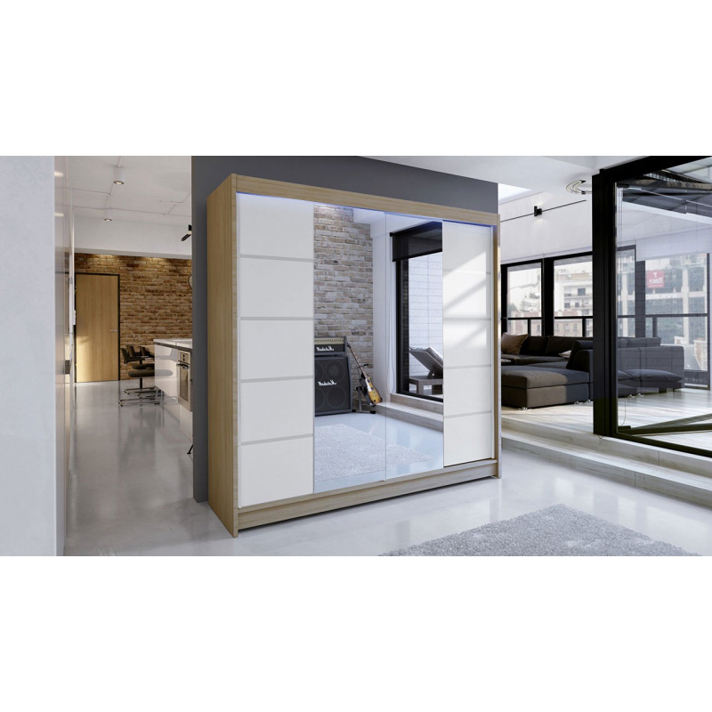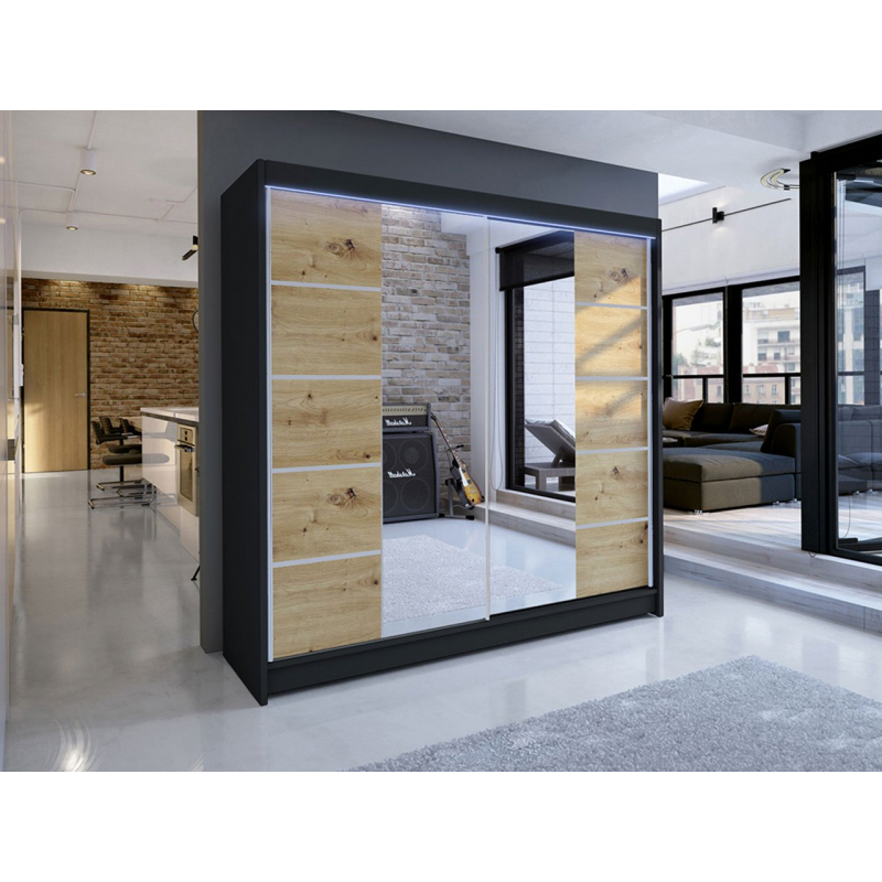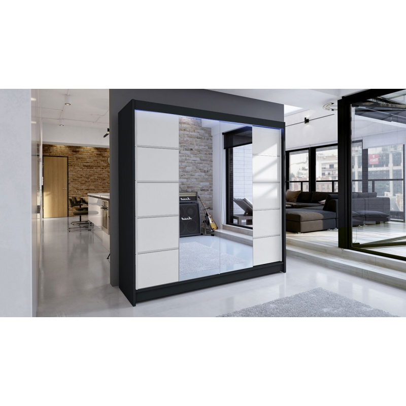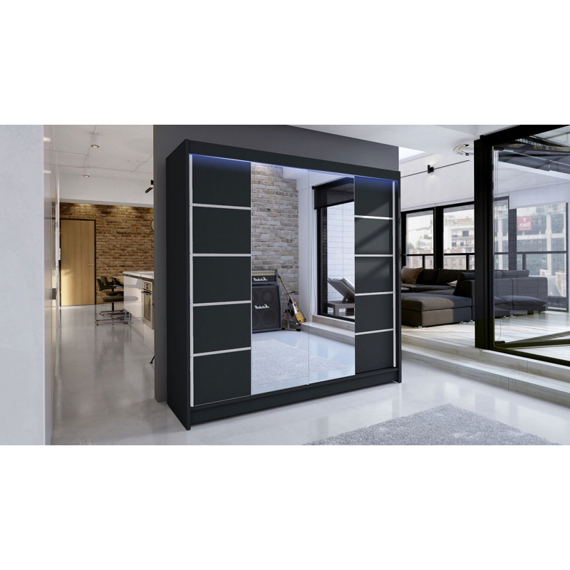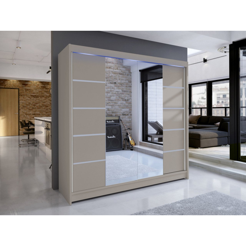 Přední část skříně je kombinací velkého zrcadla, matné povrchové úpravy a ozdobných lamel. Kromě toho může být šatník osvětlen LED diodami.