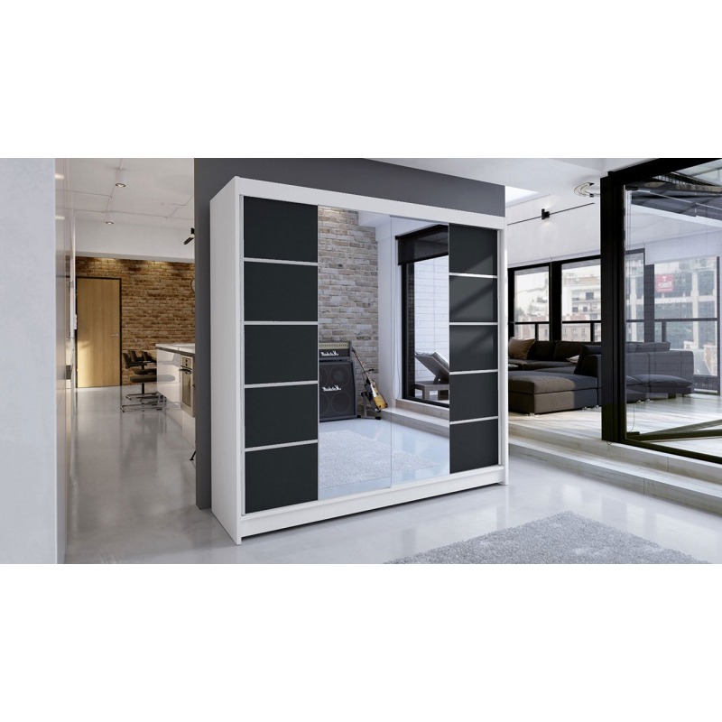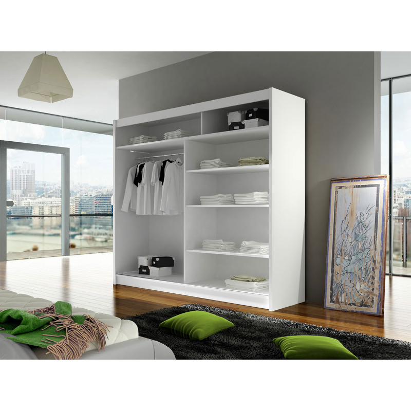 Potřebujete velkou šatní skříň, která bude nabízet police a tyč pro ramínka? Náš návrh je posuvná skříň Bar V! Šířka šatníku je 180 cm a výška 215 cm. Příčky a police jsou vyrobeny ze stejné desky jako tělo, díky čemuž jsou odolné a stabilní. Posuvné dveře pracují zlehka a jejich otevírání usnadňuje rukojeť ve formě hliníkového pruhu, který vede podél dveří. Rukojeti dodávají šatníku moderní vzhled a zabraňují jejímu ohnutí.