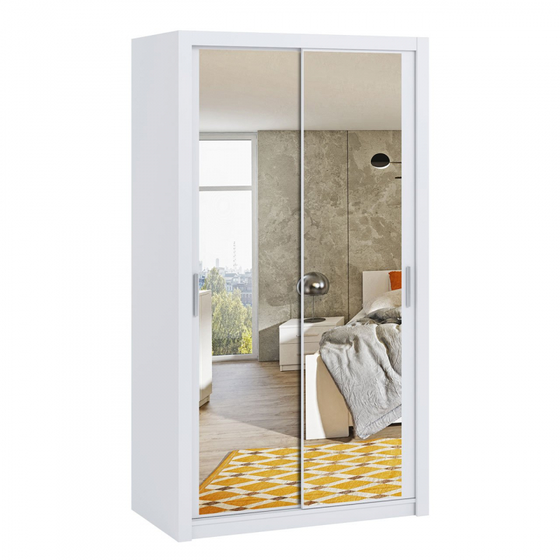 Šatní skříň s posuvnými dveřmi a se zrcadlem Kler SZ120 KE05 dokonale zdůrazní uspořádání ložnice, obývacího pokoje nebo haly. Zrcadlová přední část šatníku opticky zvětší interiér a také příznivě odráží sluneční paprsky, osvětlí místnost. Interiér šatníku se zrcadlem je vyplněn prostornými policemi a tyčemi na prádlo. Do takto navrženého úložného prostoru snadno odložíte oblečení, ale i boxy s botami nebo čepicemi. Skříň je vyrobena z pevných komponentů, díky čemuž si můžete být jisti spolehlivostí a dlouholetou spokojeností s používáním.