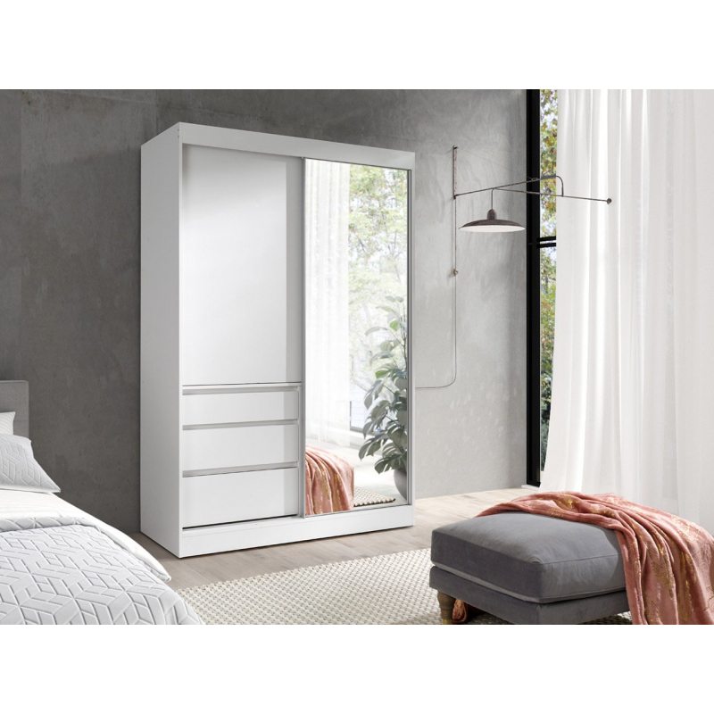 Posuvná skříň Etotti se zrcadlem je ideální do vaší ložnice. Tento kus nábytku je vyroben z masivní laminované desky s matnou povrchovou úpravou. Velké zrcadlo je ideální pro prohlížení před odchodem ven. V souladu s moderním designem jsou úchytky chytře zakomponované a neviditelné a skříň má systém posuvných dveří.