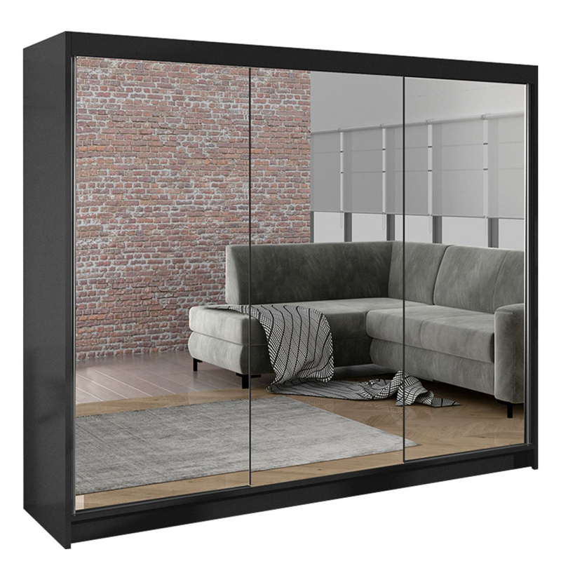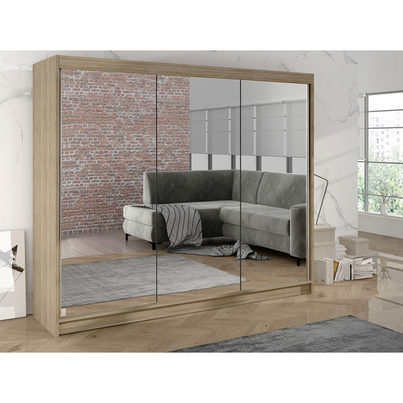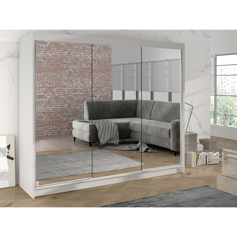 Šatní skříň Geneva III se zrcadlem je moderní forma, která se zdařile hodí do loftového interiéru. Vyrobeno z odolné laminované desky. Posuvné dveře jsou namontovány na hliníkových kolejničkách - usnadňují přístup do šatní skříně. Zrcadlo pokrývající celou přední část místnost opticky zvětší a prosvětlí.