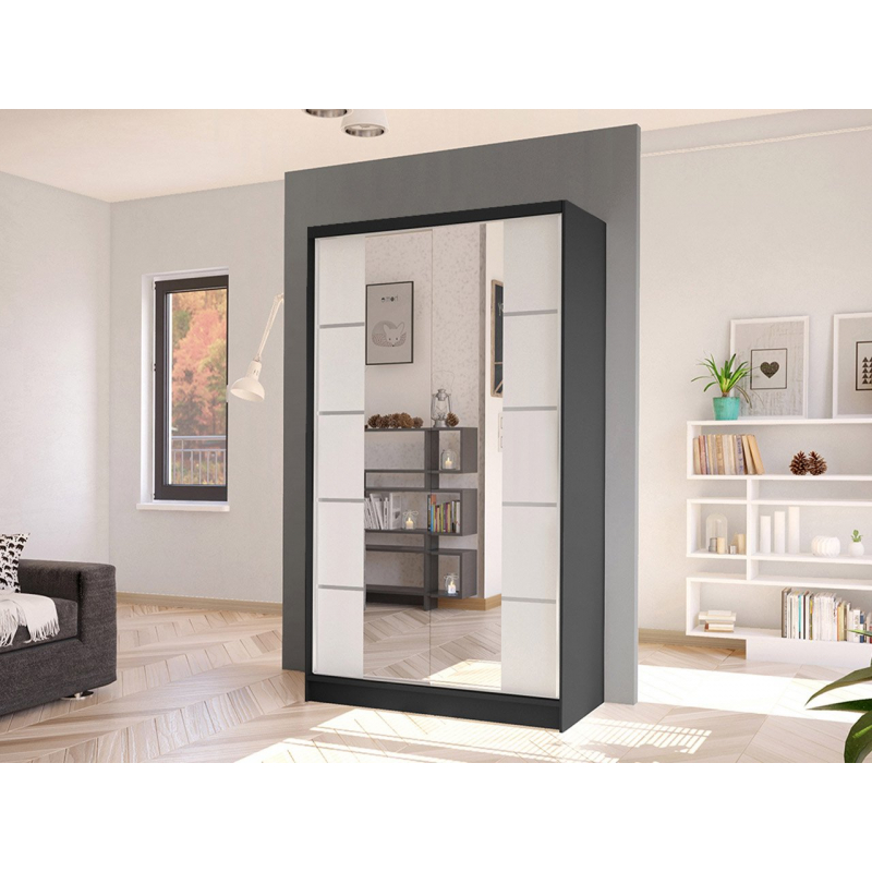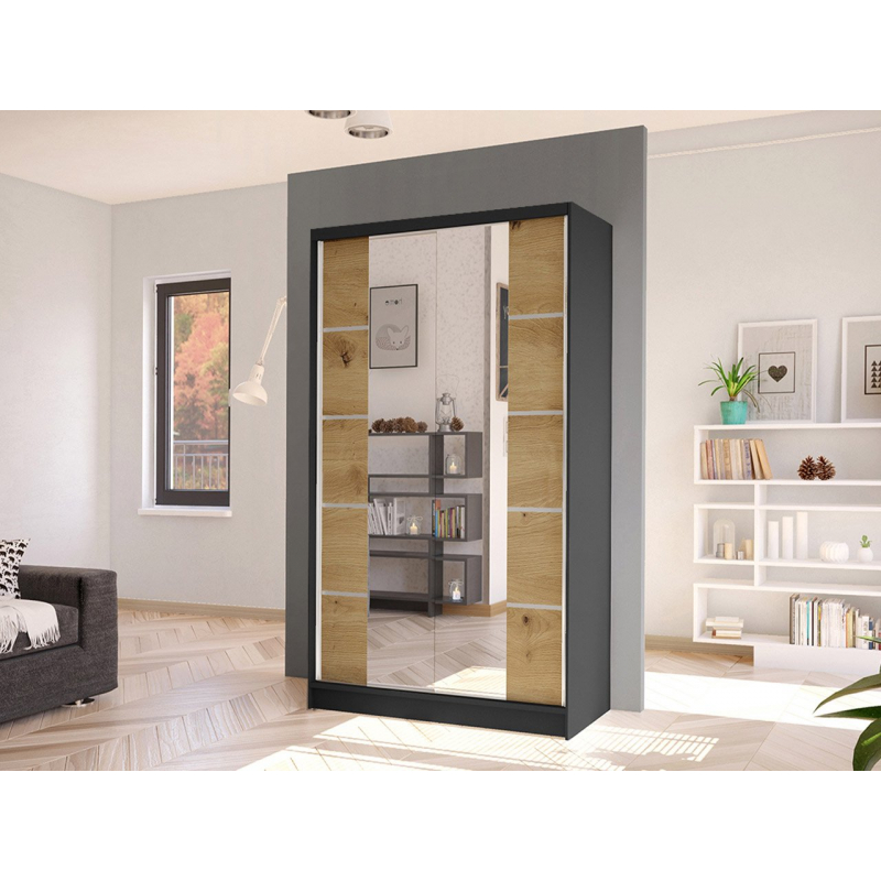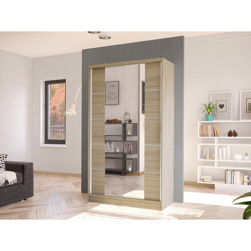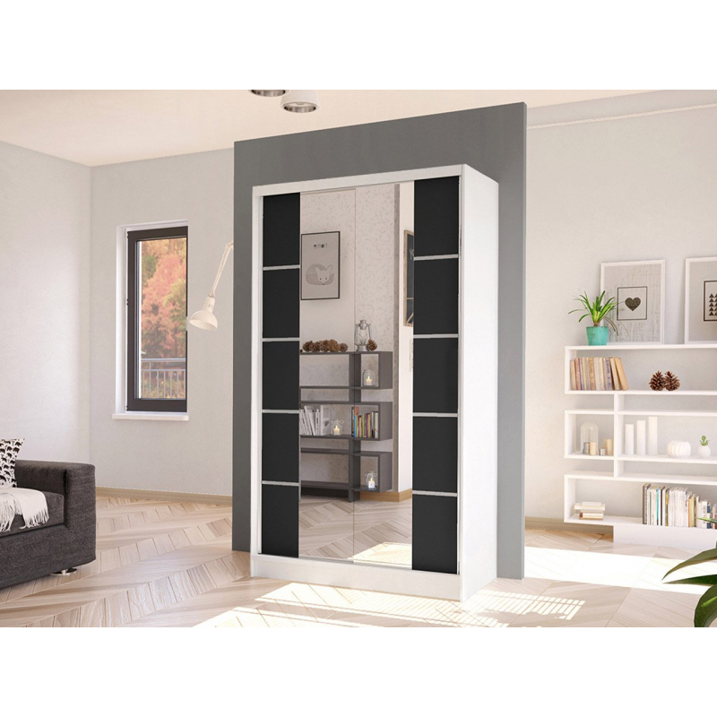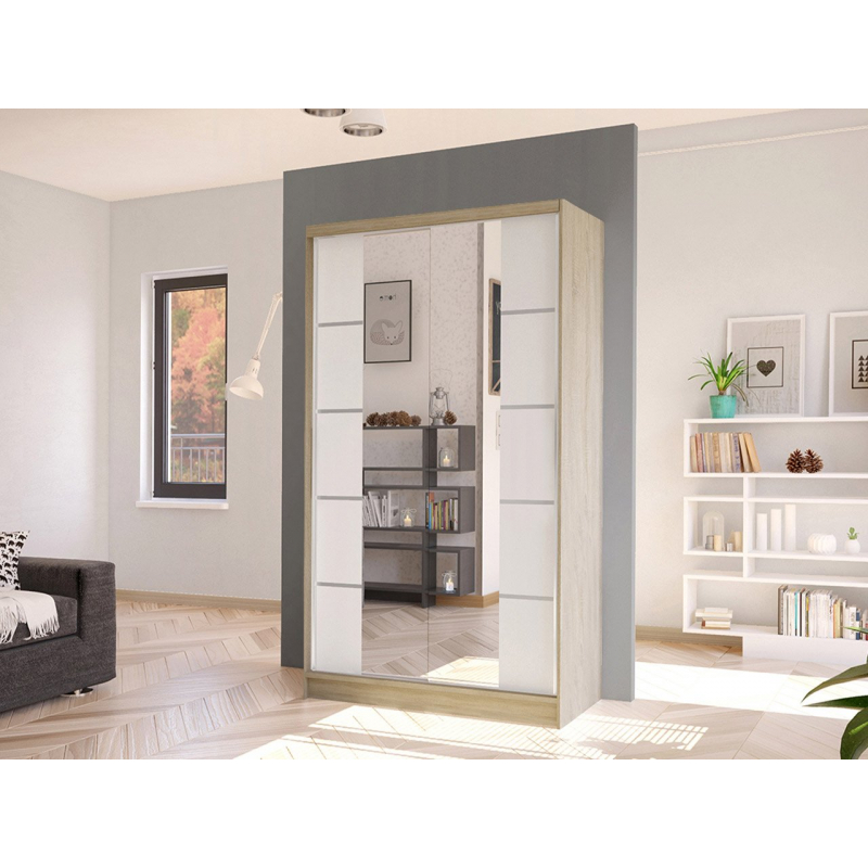Další výhodou prezentované posuvné skříně je velké zrcadlo, které je umístěno na přední straně. Umožňuje nejen prohlížení, ale také opticky zvětšuje prostor místnosti a při vhodném umístění ji prosvětluje. Další ozdobou skříně jsou však vložky na přední straně a velké podlouhlé úchyty.