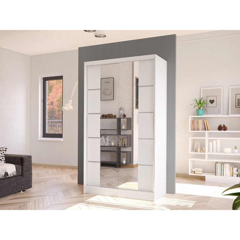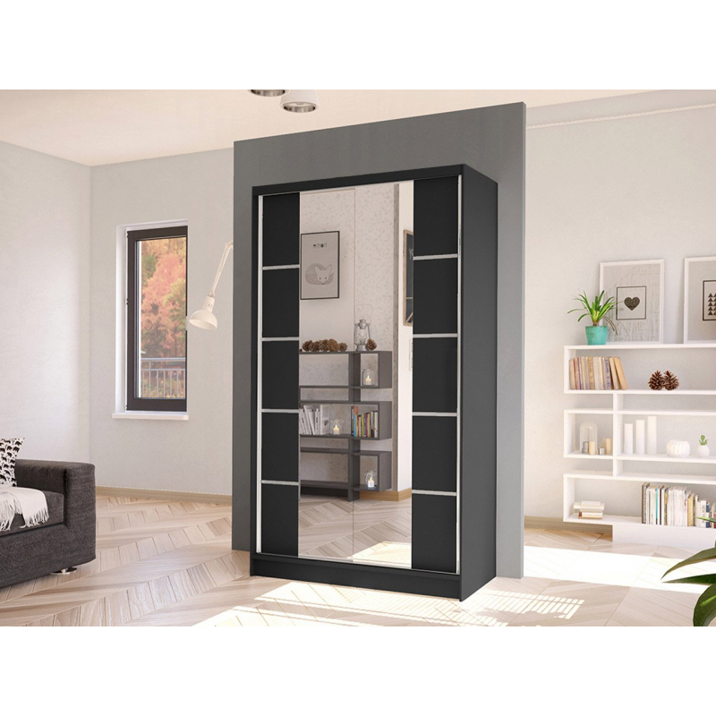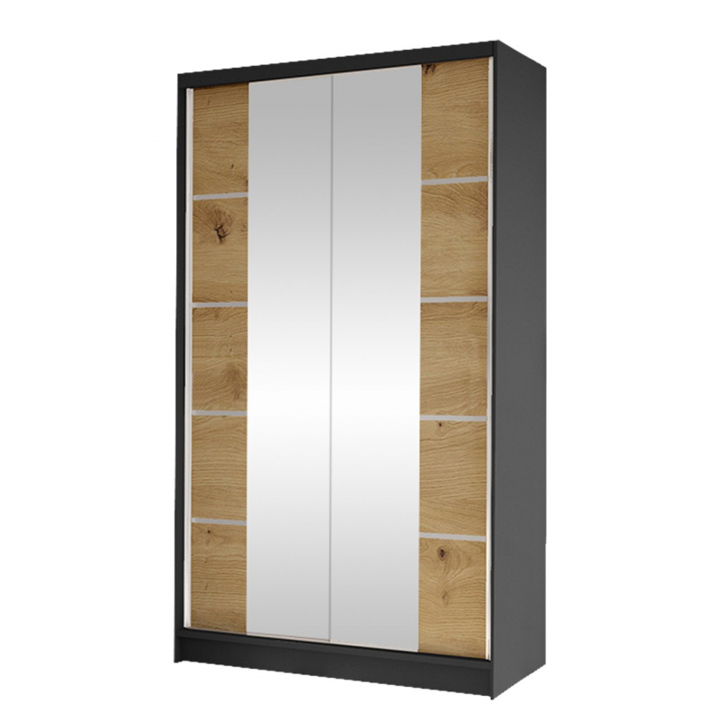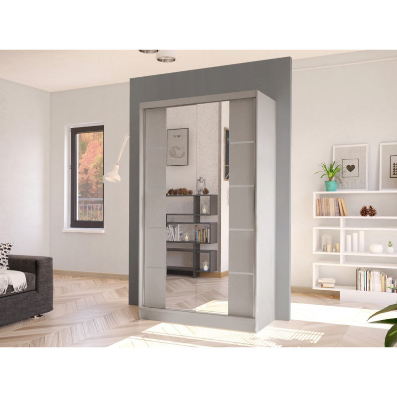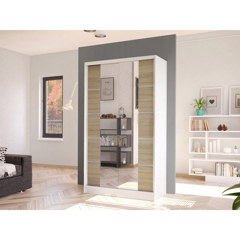 Další výhodou prezentované posuvné skříně je velké zrcadlo, které je umístěno na přední straně. Umožňuje nejen prohlížení, ale také opticky zvětšuje prostor místnosti a při vhodném umístění ji prosvětluje. Další ozdobou skříně jsou však vložky na přední straně a velké podlouhlé úchyty.