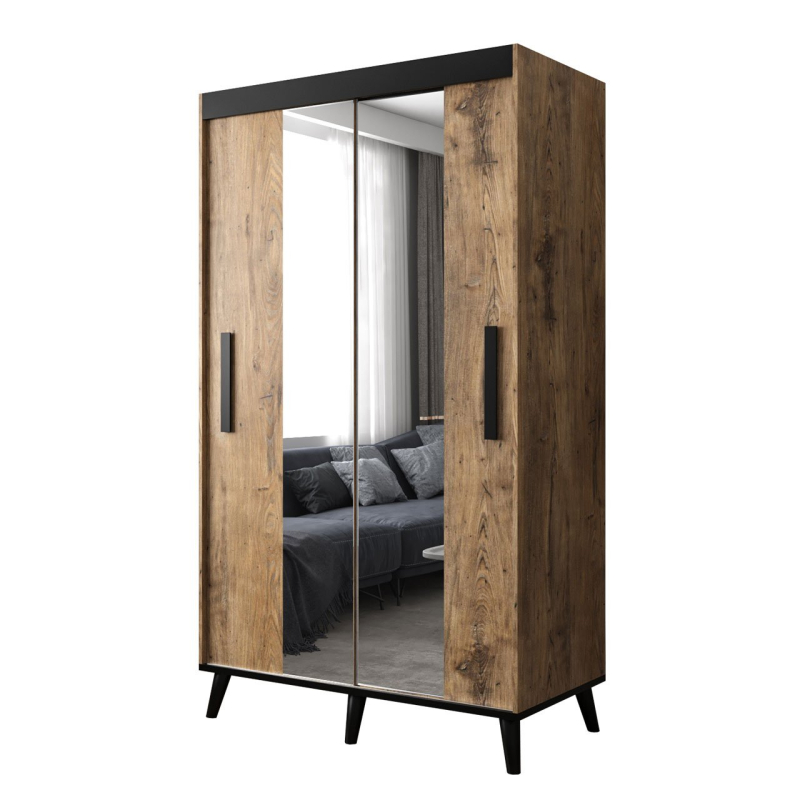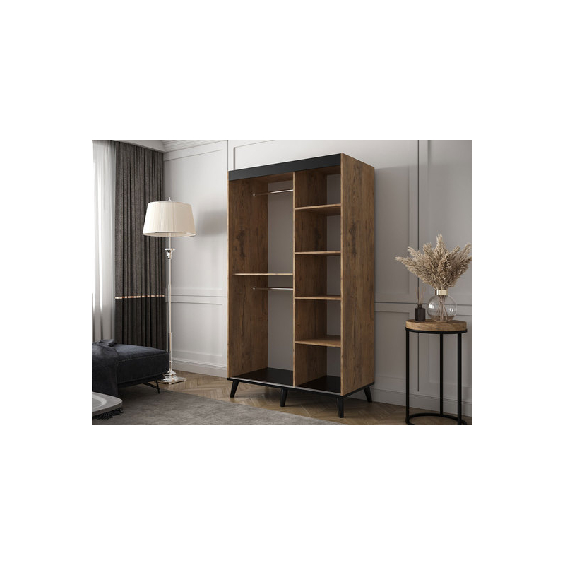 Výrazným prvkem skříně s posuvnými dveřmi jsou vysoké dřevěné nohy, které jí dodávají neobvyklý charakter. Módní barevná kombinace je vhodná do moderních i podkrovních interiérů.