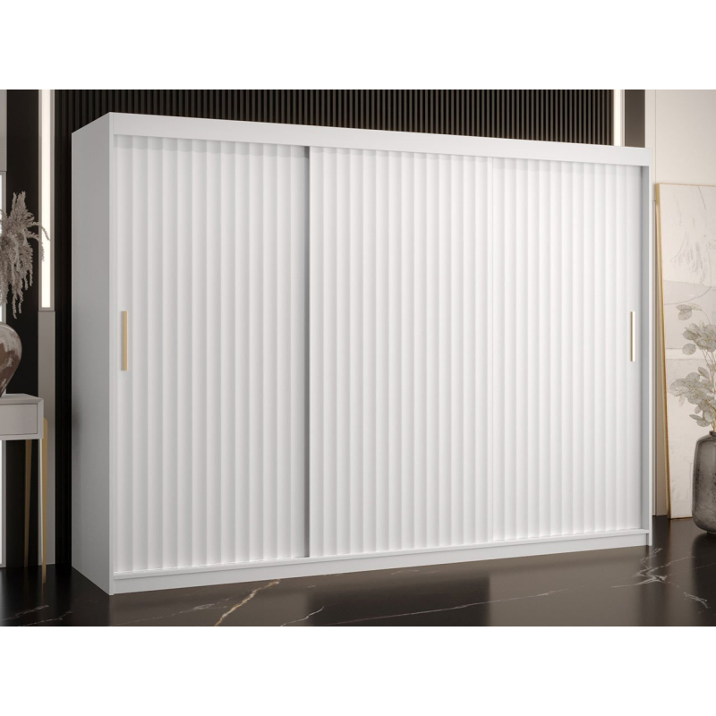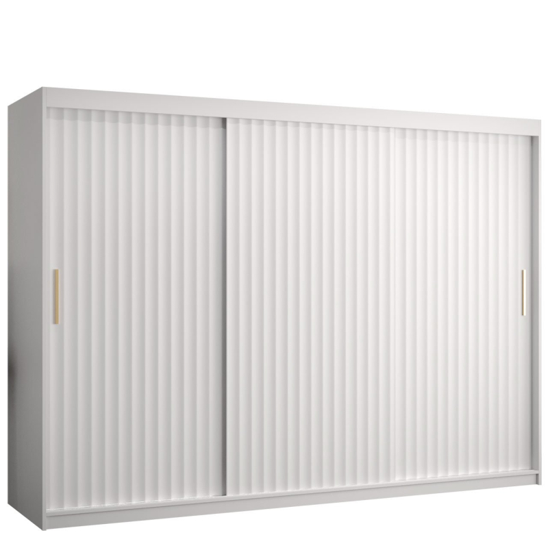 Kromě prostorného středu v podobě polic a dvou tyčí skříň nabízí také dekorativní prvky. Frézovaná čela jsou prvkem, který zaujme na první pohled. K tomu přispívají i praktické zlaté úchytky. Další výhodou tohoto modelu jsou posuvné dveře, které jsou praktické a nevyžadují další prostor pro otevírání.