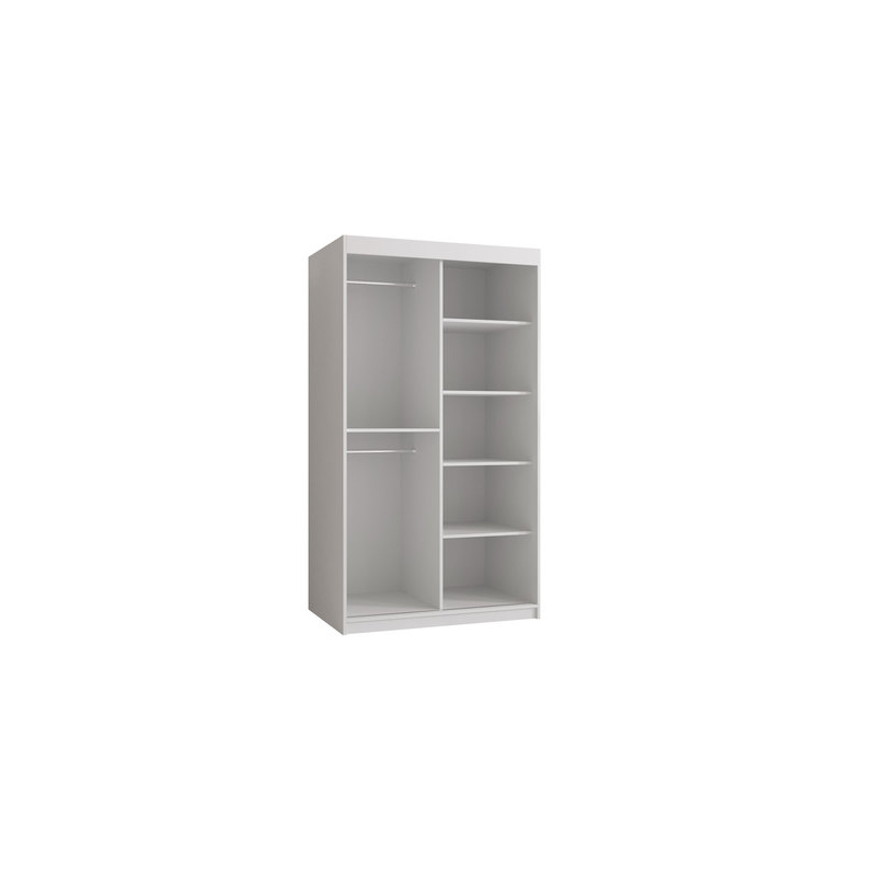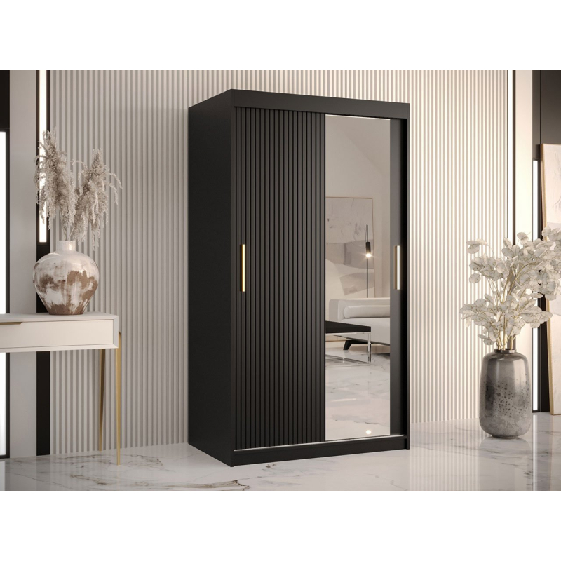 Posuvná skříň se zrcadlem Towiro Slim 2 100 je návrhem do malého pokoje, protože její celková šířka je 100 cm. Představený model nabízí i přes své menší rozměry praktická řešení: řadu polic a dvě šatní tyče.