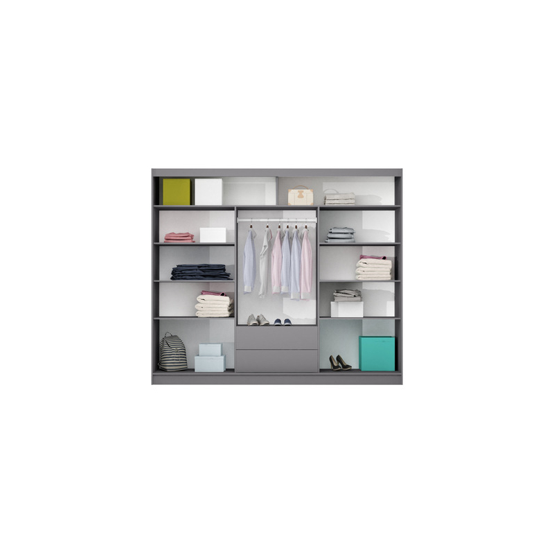 V centrální části skříně je pevná tyč na šaty, která je ideální pro uložení svrchního oblečení, šatů, obleků nebo košil. Vedle tyče je množství polic, které poskytují prostor pro uspořádání menších předmětů, jako jsou svetry, halenky nebo doplňky.