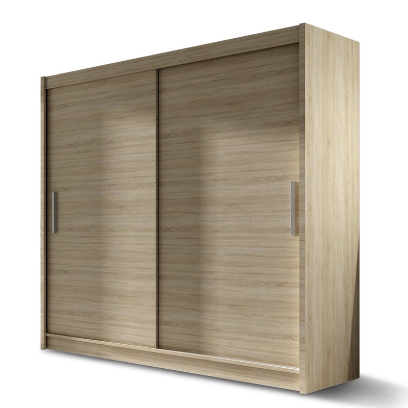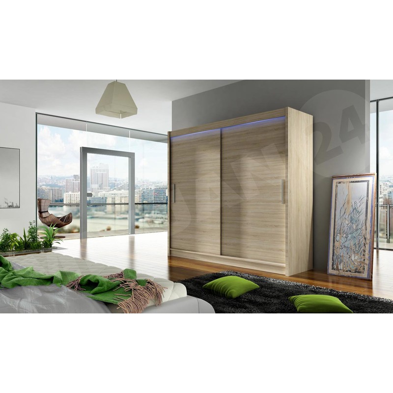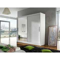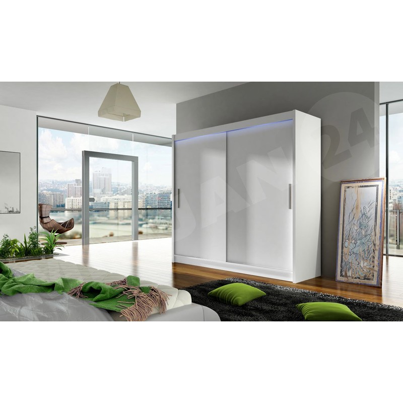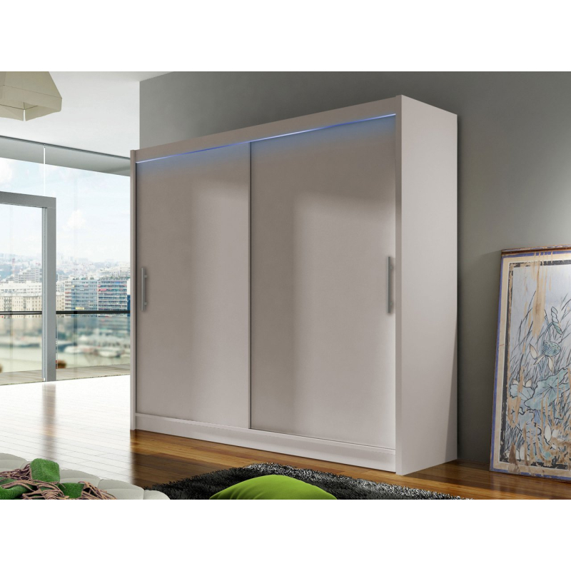 Šatní skříň je vybavena systémem posuvných dveří na hliníkových kolejničkách. Má spoustu polic, které vám umožňují oddělit oblečení, což je užitečné, když máte v šatníku spoustu oblečení. Vyrobeno z laminované desky. Dodatečně si můžete zvolit LED osvětlení šatníku za příplatek.