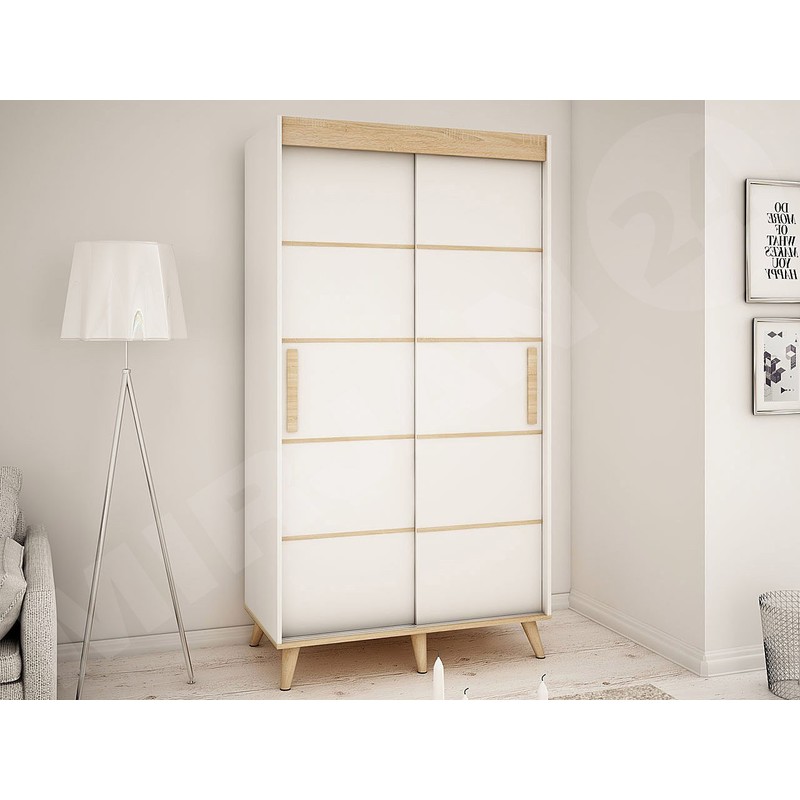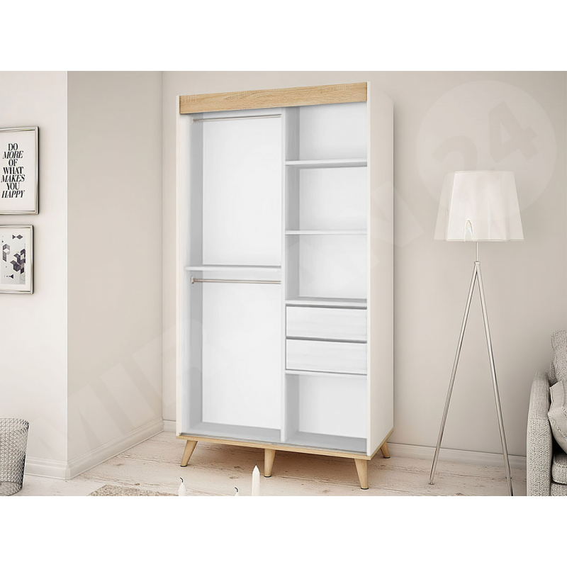 Posuvná skříň Bravo V1 120 cm je model, který vypadá jako módní skandinávský styl. Je ovlivněna vysokými bukovými dřevěnými nohami a perfektní kombinací bílé s texturou dřeva použitou na přední straně skříně.
