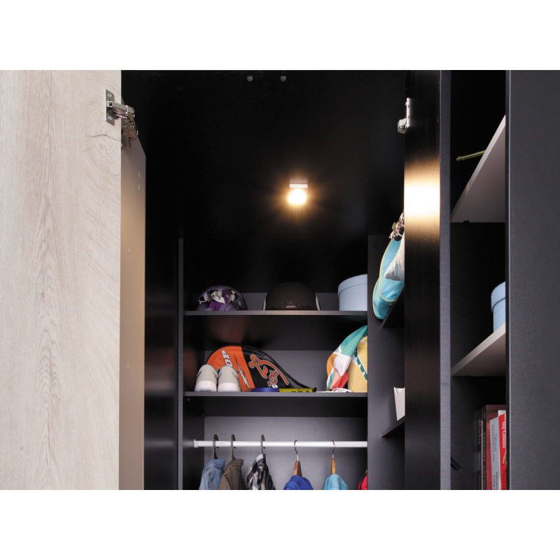 Velká rohová šatní skříň Legimi je pokladnicí úložného prostoru. Jeho interiér pozitivně překvapuje obrovskou kapacitou. Najdete zde zásuvky na spodní prádlo, prostorné police na oblečení a šatní tyč. Vstup do interiéru šatníku zajišťují dveře..