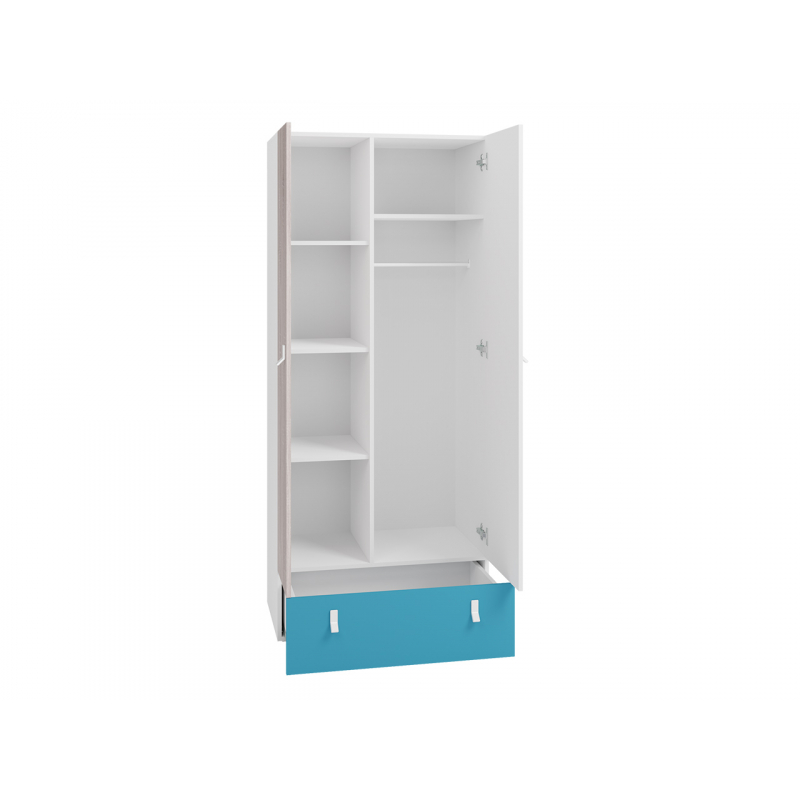 Úzká, a zároveň velmi prostorná, mládežnická skříň Legimi se vyznačuje důmyslně naplánovaným úložným prostorem. K malým rozměrům patří řada polic na oblečení a prostorný prostor na zavěšení oblečení na věšáky.