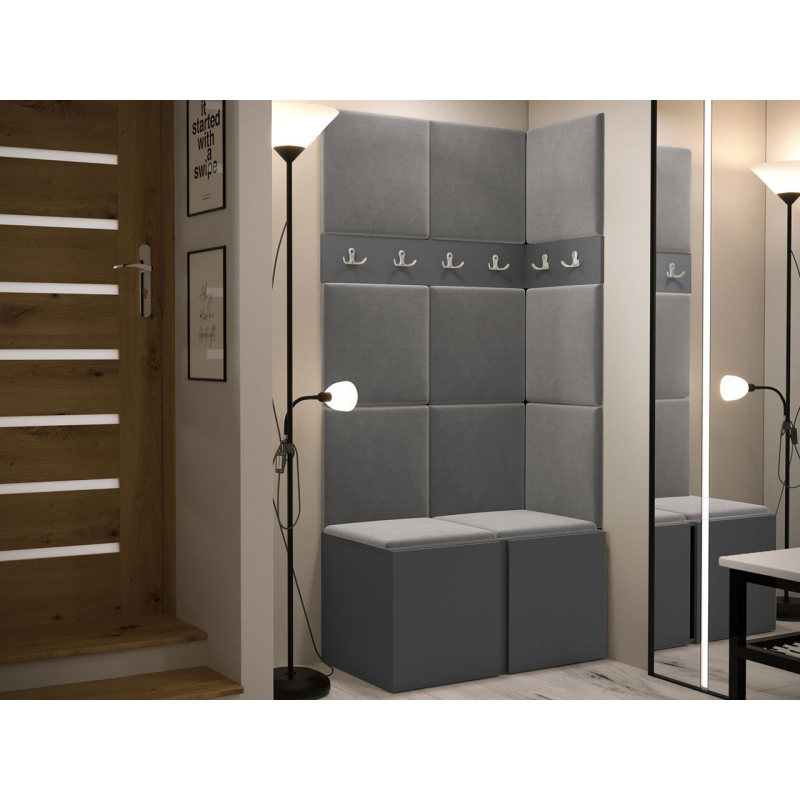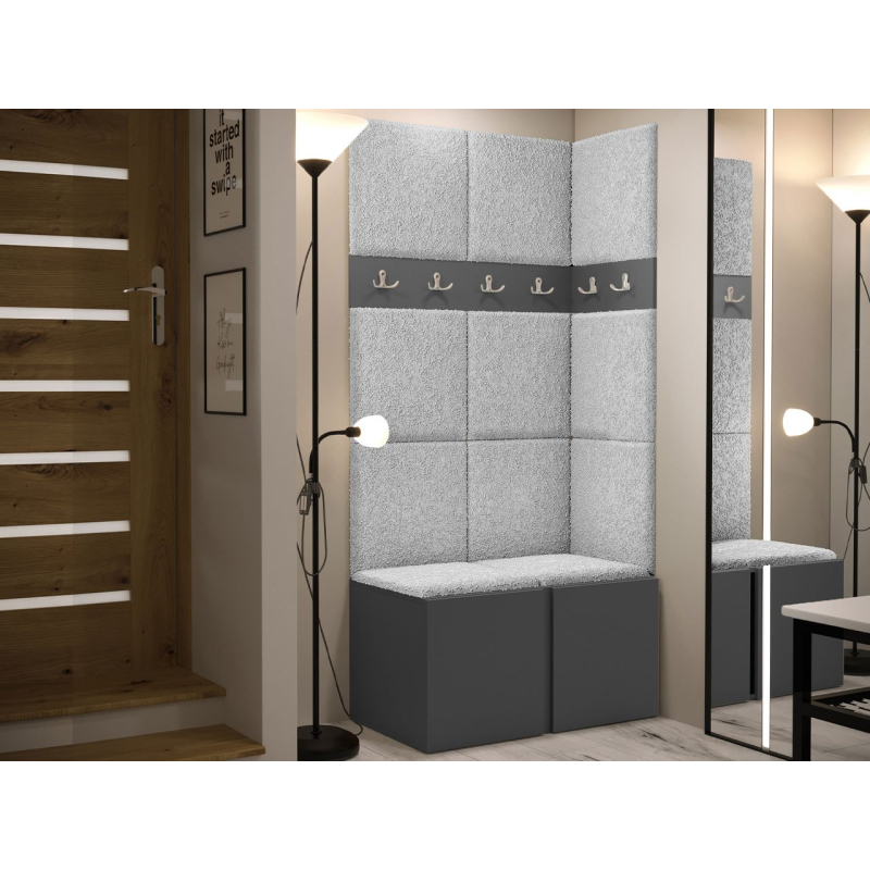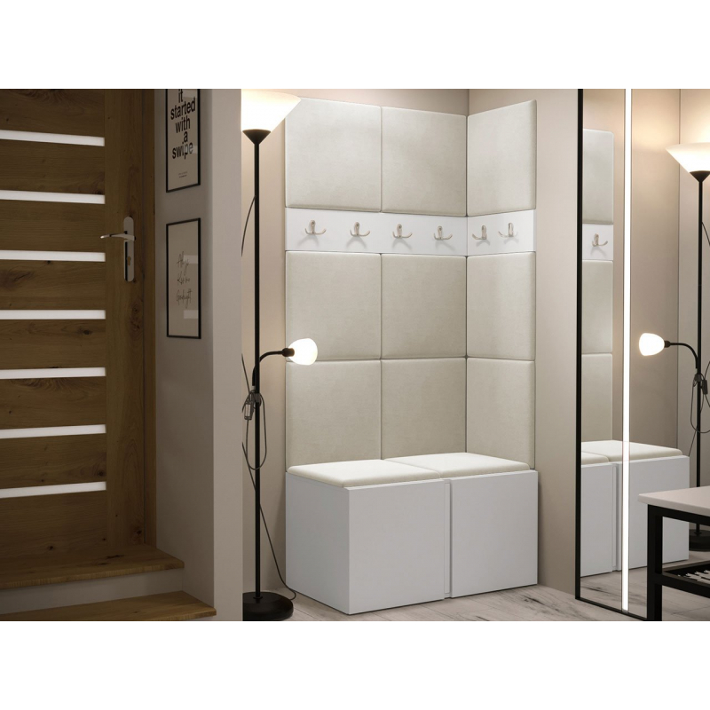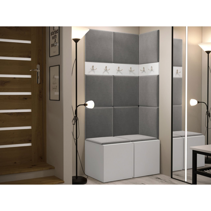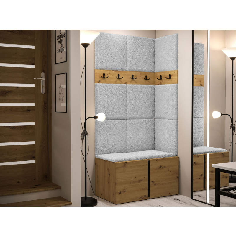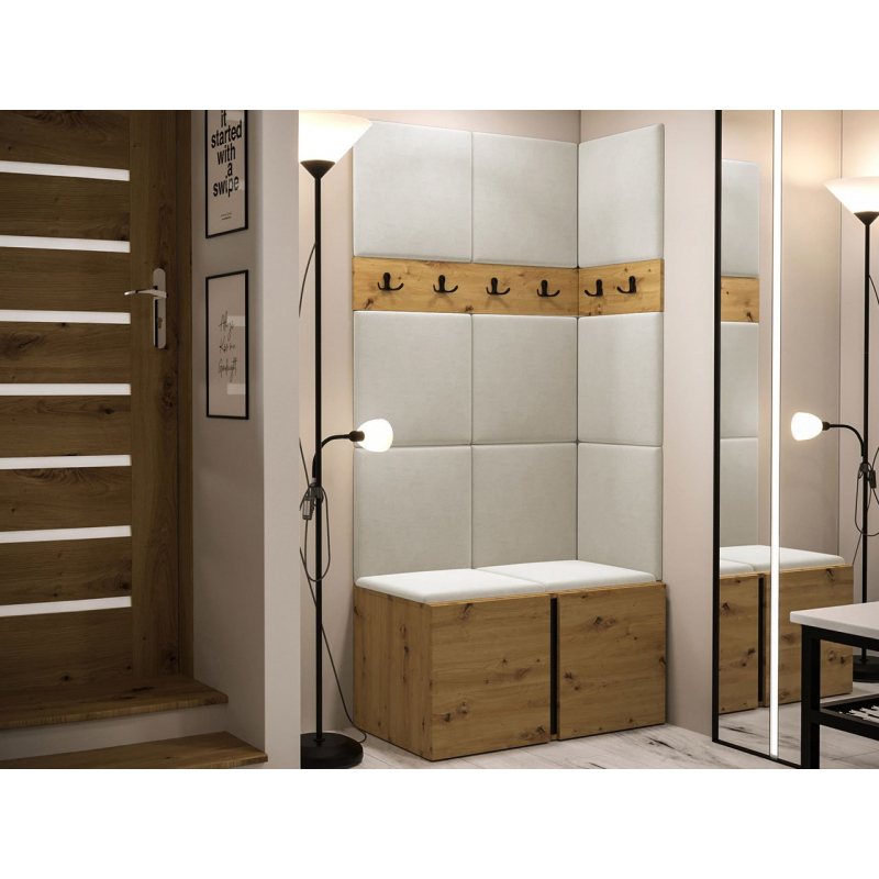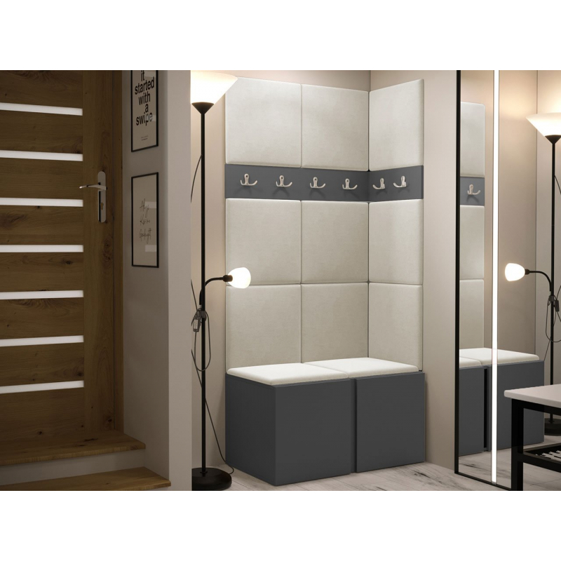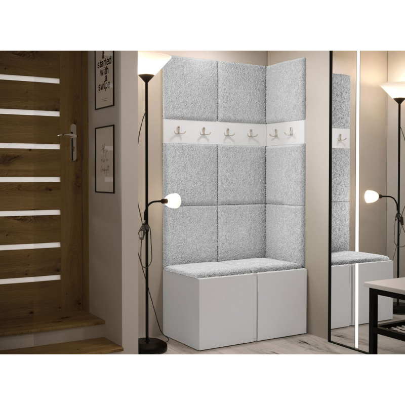 Předsíňová sestava Tavasz I je model, který bude díky sadě čalouněných panelů vypadat skvěle v rohu místnosti. Panely o rozměrech 42 cm x 42 cm jsou dostupné v módních barevných variantách a jsou vyrobeny z látky příjemné na dotek. Kromě estetické hodnoty budou panely pohodlnou oporou při obouvání bot. Součástí sestavy je také botník s četnými policemi. Na sedadle botníku jsou také čalouněné panely zvyšující estetickou hodnotu a komfort sestavy. Posledním prvkem sestavy je panel se šesti dvojitými ramínky na šaty.