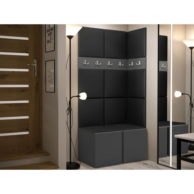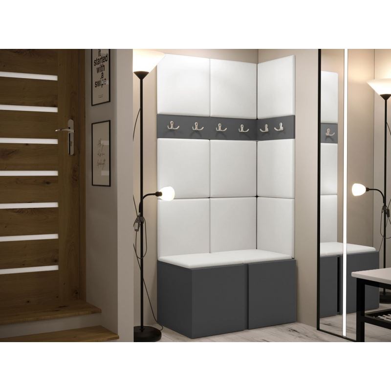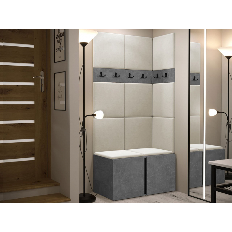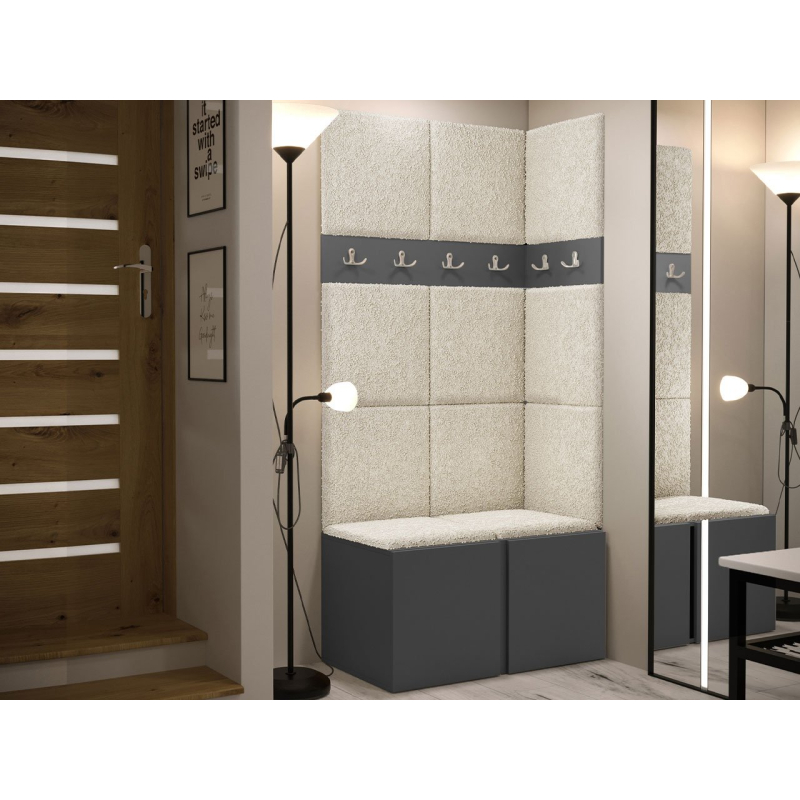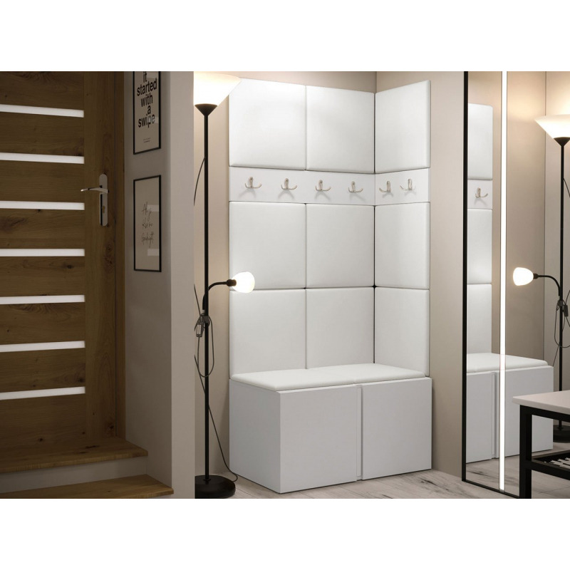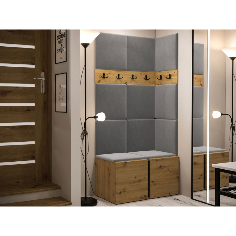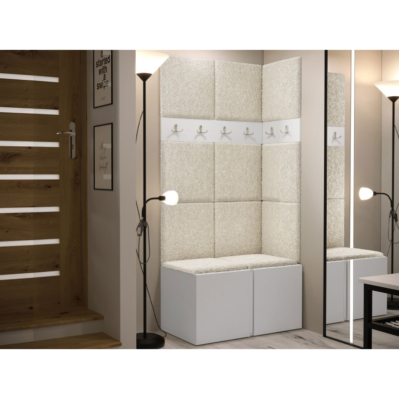 Předsíňová sestava Tavasz I je model, který bude díky sadě čalouněných panelů vypadat skvěle v rohu místnosti. Panely o rozměrech 42 cm x 42 cm jsou dostupné v módních barevných variantách a jsou vyrobeny z látky příjemné na dotek. Kromě estetické hodnoty budou panely pohodlnou oporou při obouvání bot. Součástí sestavy je také botník s četnými policemi. Na sedadle botníku jsou také čalouněné panely zvyšující estetickou hodnotu a komfort sestavy. Posledním prvkem sestavy je panel se šesti dvojitými ramínky na šaty.