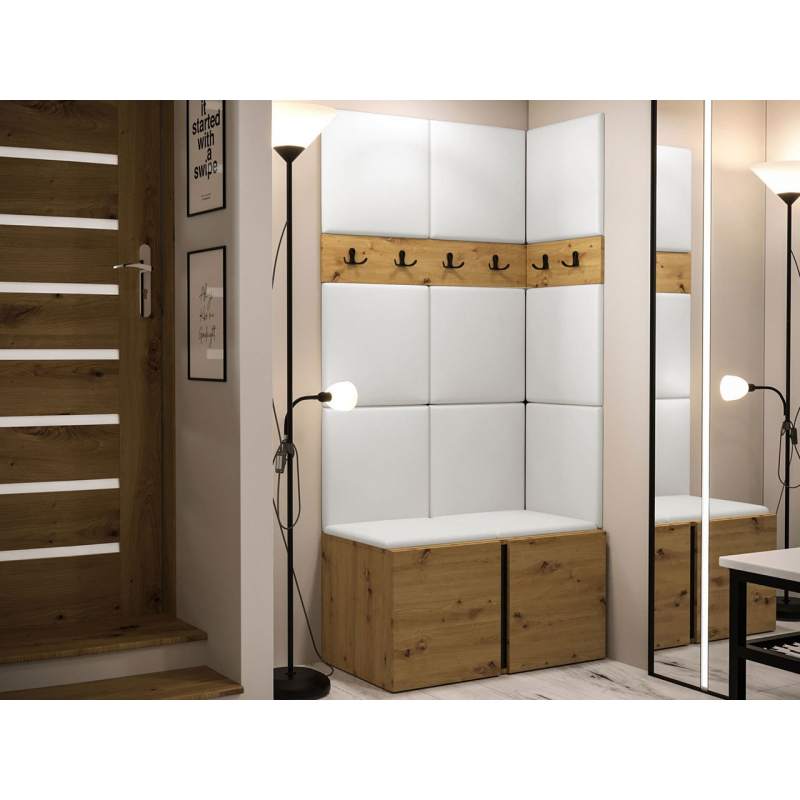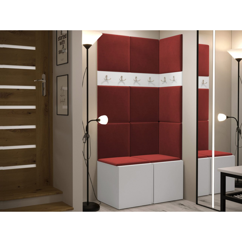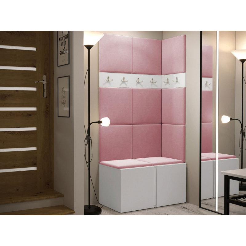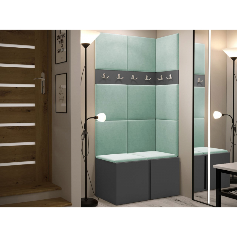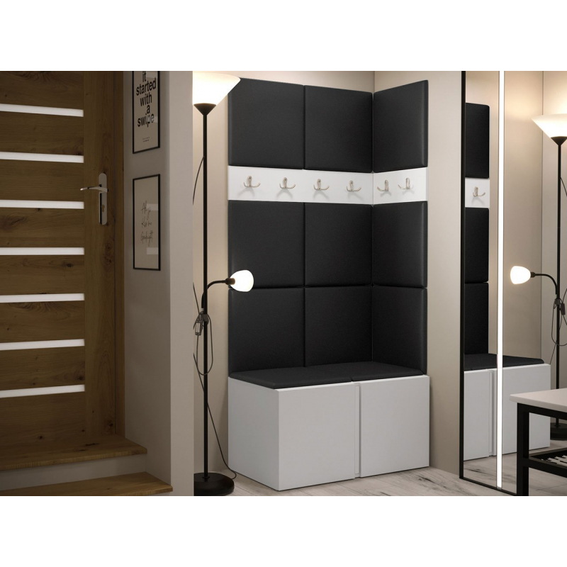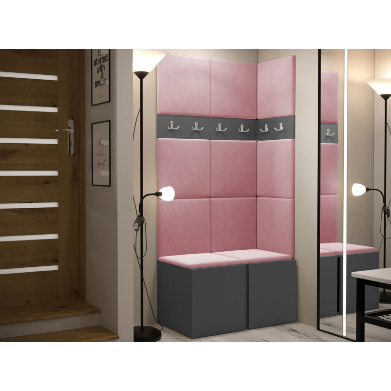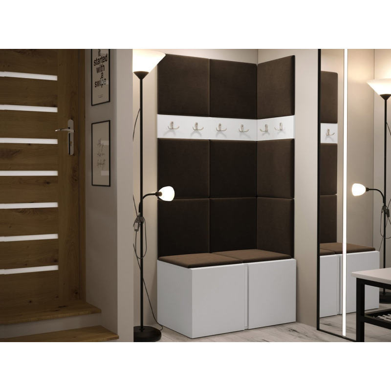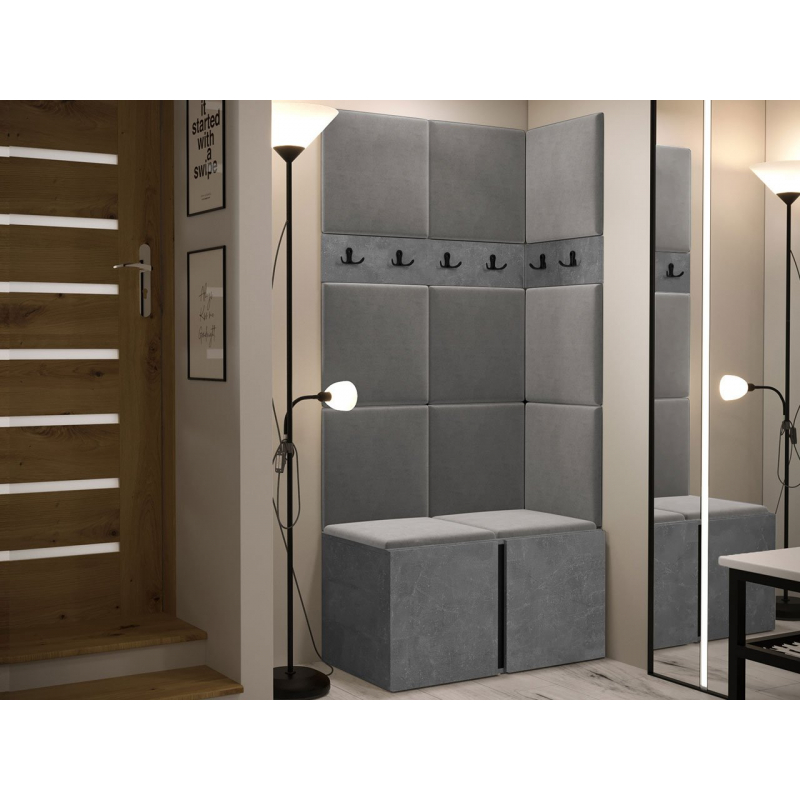 Předsíňová sestava Tavasz I je model, který bude díky sadě čalouněných panelů vypadat skvěle v rohu místnosti. Panely o rozměrech 42 cm x 42 cm jsou dostupné v módních barevných variantách a jsou vyrobeny z látky příjemné na dotek. Kromě estetické hodnoty budou panely pohodlnou oporou při obouvání bot. Součástí sestavy je také botník s četnými policemi. Na sedadle botníku jsou také čalouněné panely zvyšující estetickou hodnotu a komfort sestavy. Posledním prvkem sestavy je panel se šesti dvojitými ramínky na šaty.