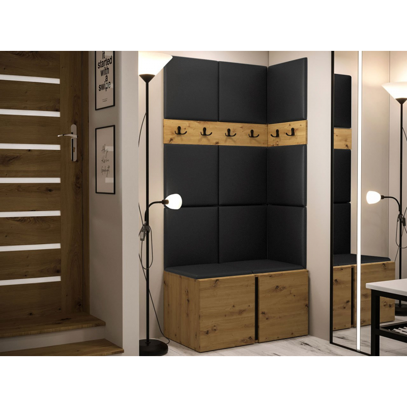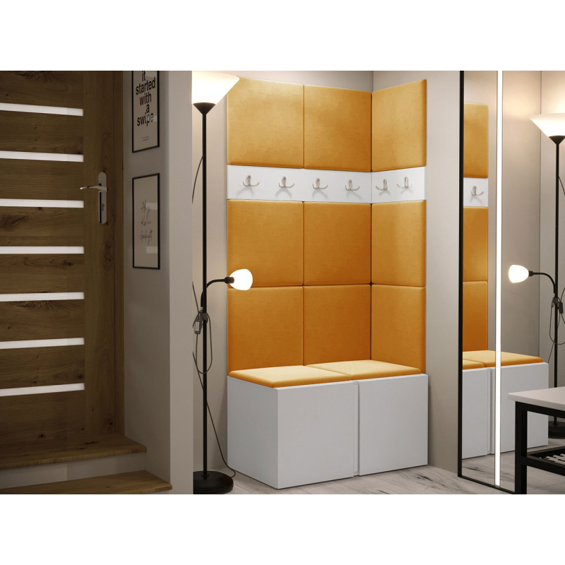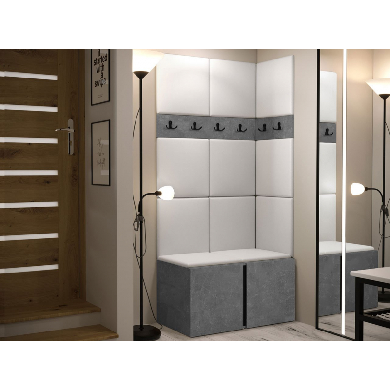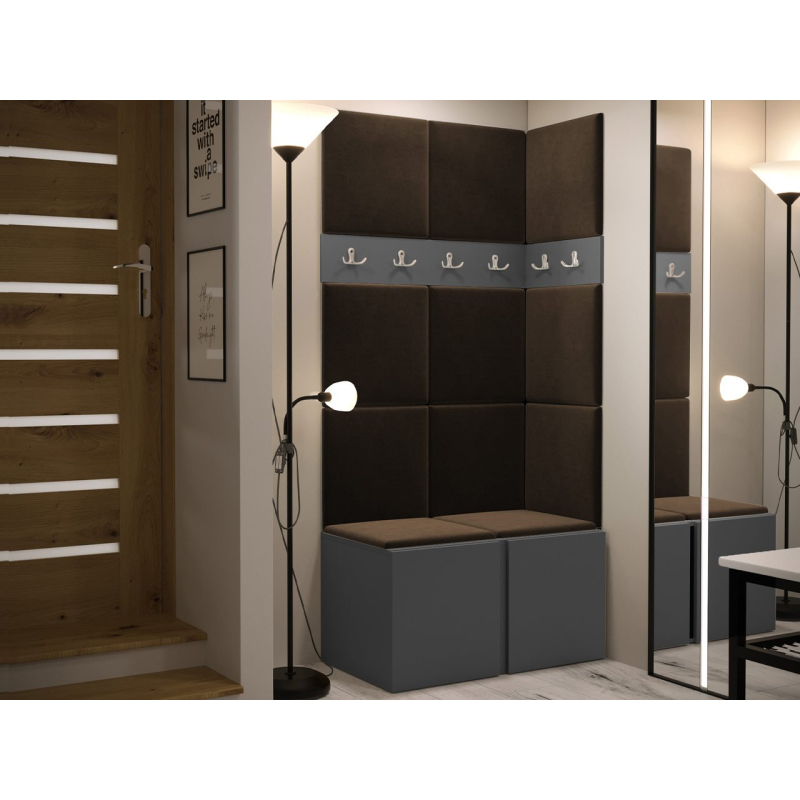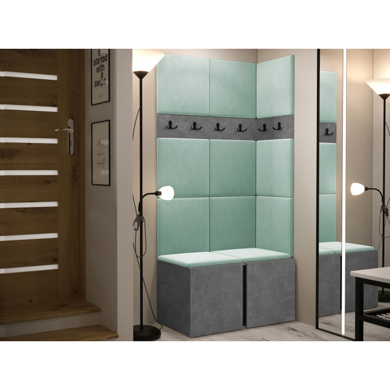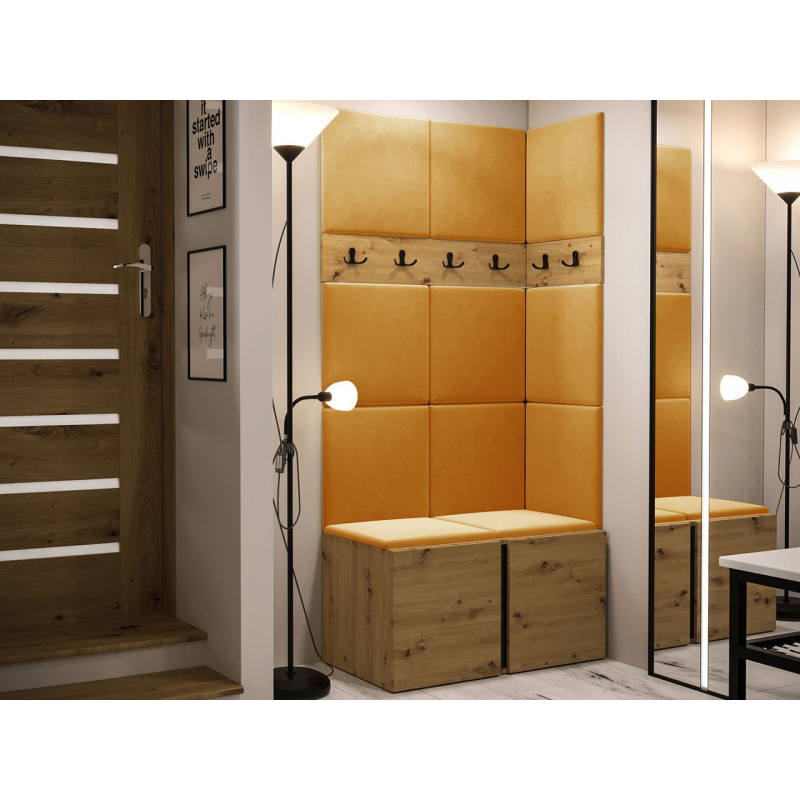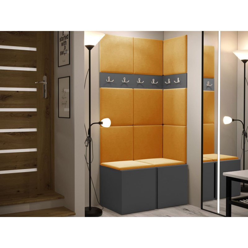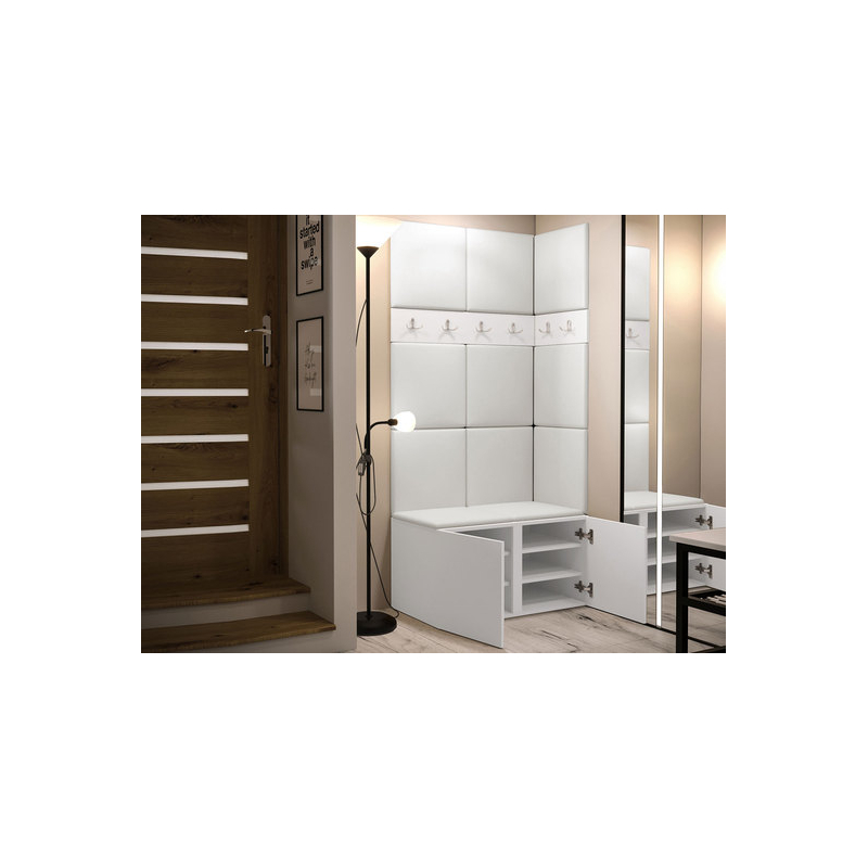Předsíňová sestava Tavasz I je model, který bude díky sadě čalouněných panelů vypadat skvěle v rohu místnosti. Panely o rozměrech 42 cm x 42 cm jsou dostupné v módních barevných variantách a jsou vyrobeny z látky příjemné na dotek. Kromě estetické hodnoty budou panely pohodlnou oporou při obouvání bot. Součástí sestavy je také botník s četnými policemi. Na sedadle botníku jsou také čalouněné panely zvyšující estetickou hodnotu a komfort sestavy. Posledním prvkem sestavy je panel se šesti dvojitými ramínky na šaty.