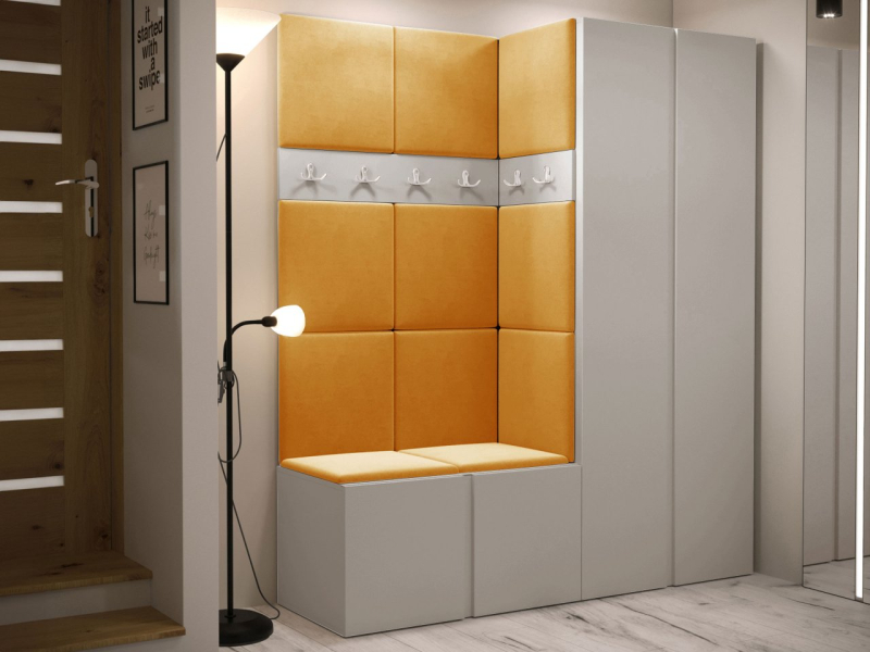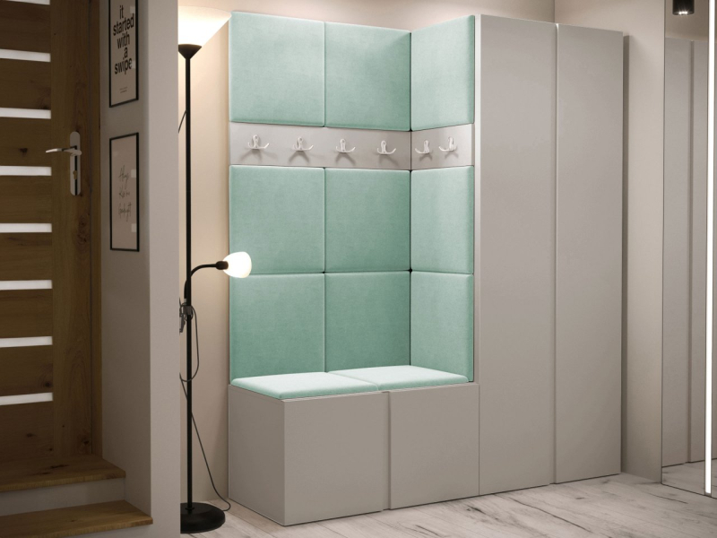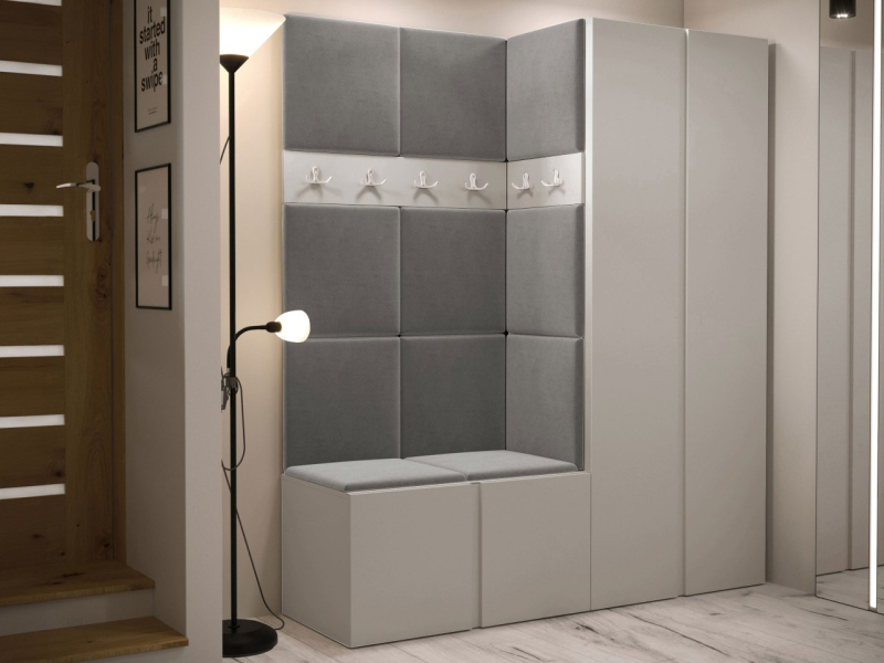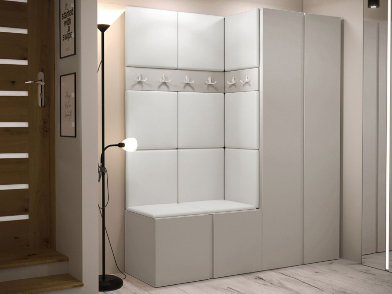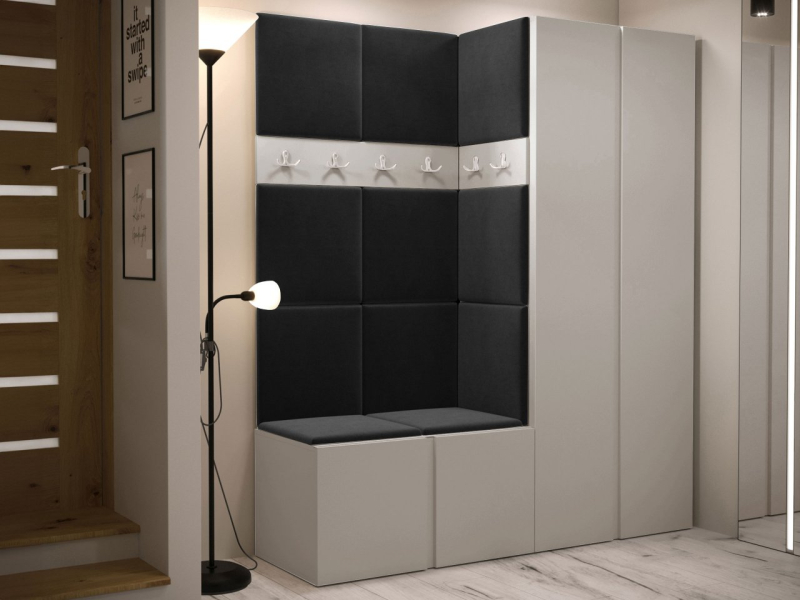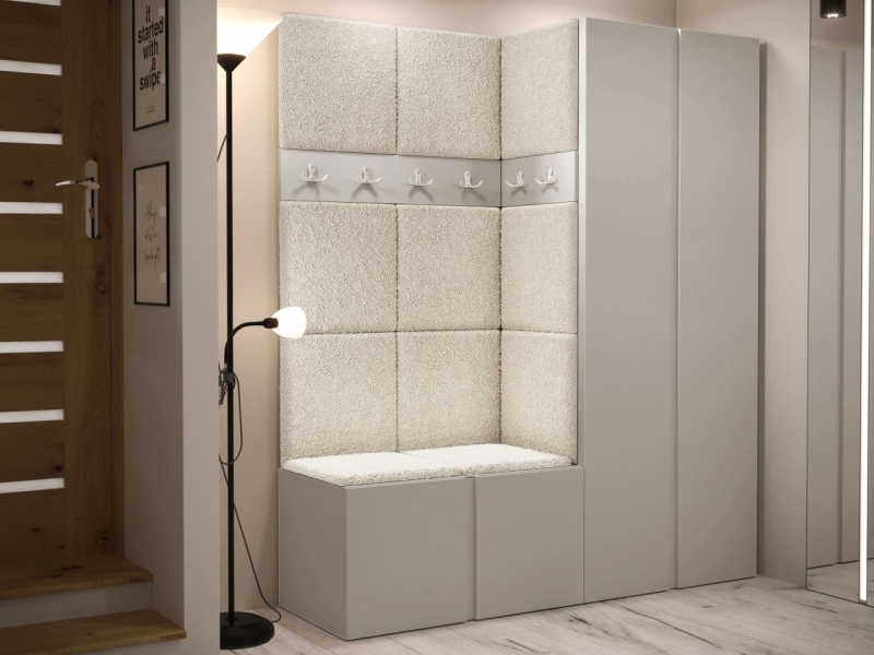Moderní šatní skříň Tavasz III je základem pro módní design chodby a předsíně. Jeji umístěním hned vedle dveří si můžete být jisti, že po příchodu domů vás vždy přivítá efektně a prakticky vyzdobená místnost. Maximální funkčnost těchto kusů nábytku zvýhodňuje kombinace šatní skříně s botníkem. Taková kombinace poskytuje optimální prostor pro oblečení i boty a sportovní vybavení. Čalouněné panely dodávají nábytku předsíně zajímavý vzhled. K dispozici v několika barvách, lemují stěny a také vytvářejí oporu, která usnadňuje obouvání bot. Celek doplňuje panel s věšáky - chytré místo k zavěšení bund a kabátů hostů. Šatní skříň je univerzální, lze při montáži zvolit stranu.