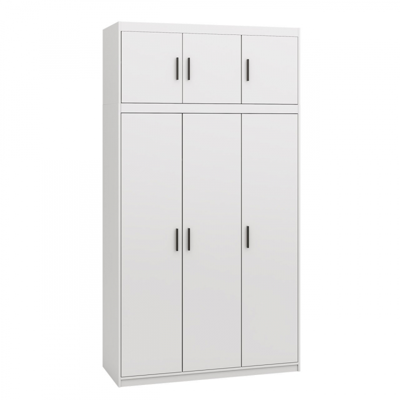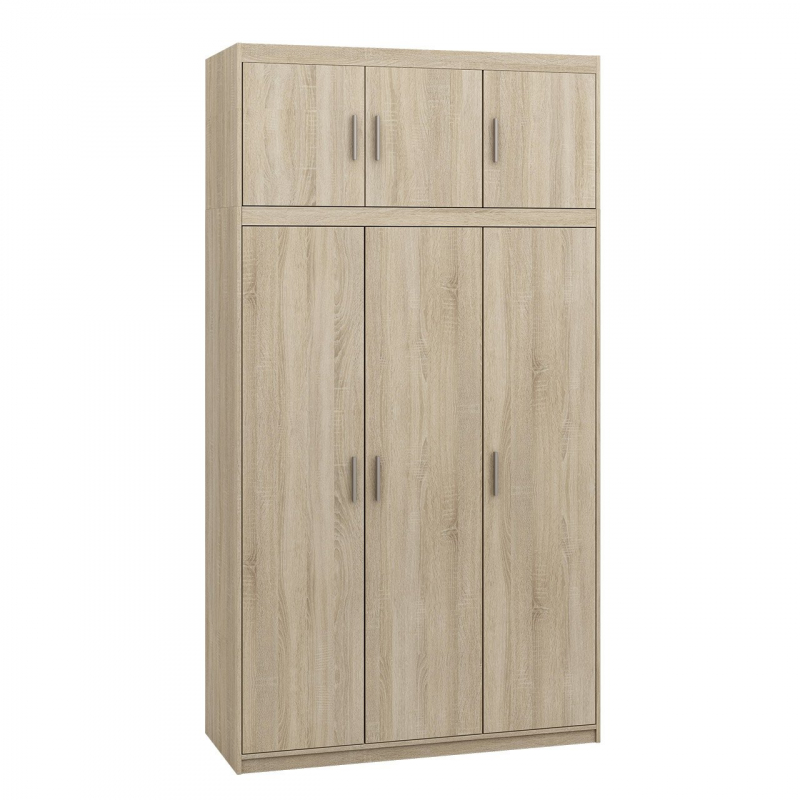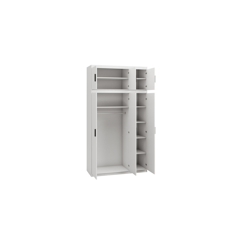 Prostorná šatní skříň Melen 3D s nástavcem chytře uspořádá úložný prostor v každé domácnosti. Její vnitřní prostor je vybaven prostornou plochou pro zavěšení oděvů na ramínka, díky čemuž se skříň skvěle hodí do ložnic a předsíní. Tím, že tento kus nábytku nabízí také řadu polic, zvyšuje také funkčnost skříně.