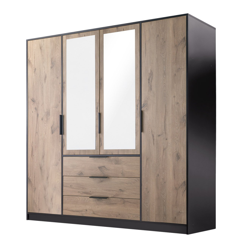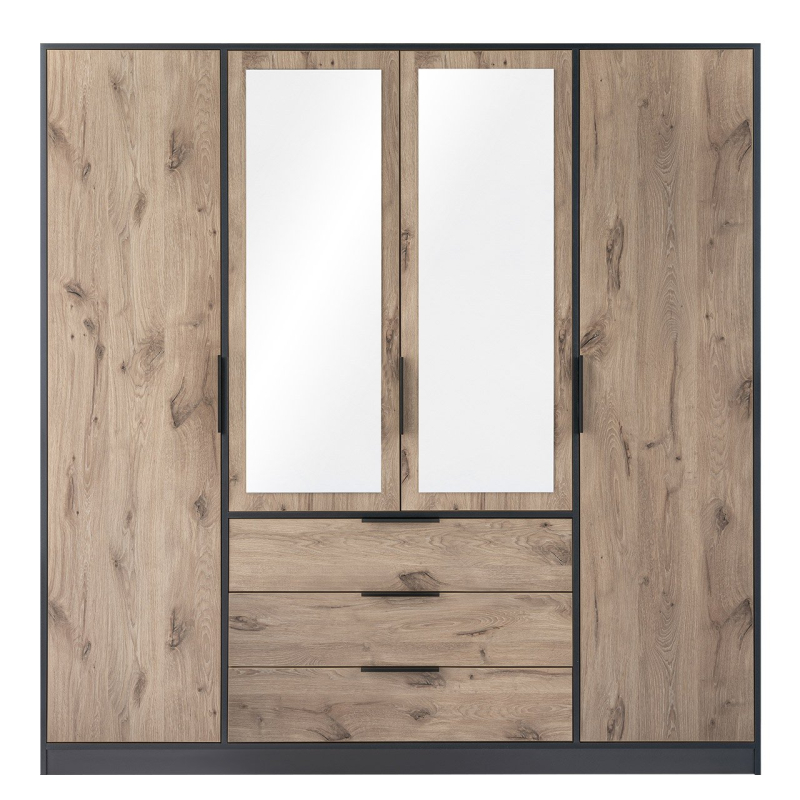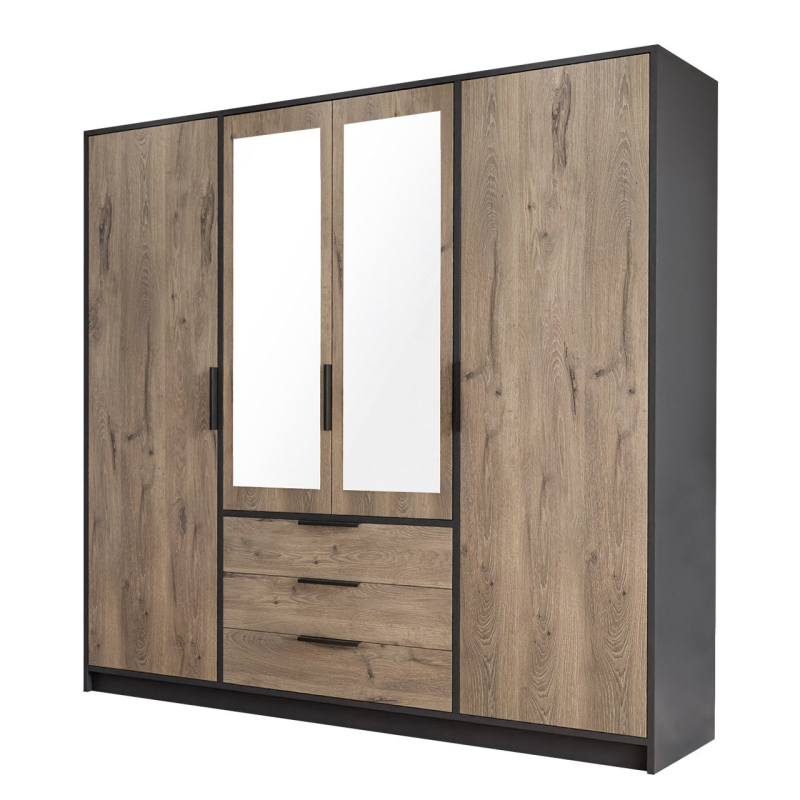 Kromě mnoha funkčních řešení nelze zapomenout ani na krásný vzhled prezentované šatní skříně. Stylové barevné kombinace a praktické zrcadlo na přední straně tvoří harmonický celek. Varianta je navíc vybavena šikovnými kovovými úchyty, díky kterým se snadno dostanete do útrob nábytku.