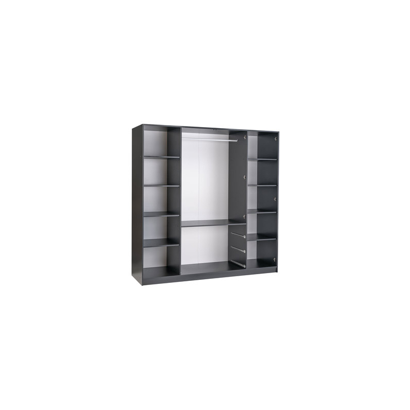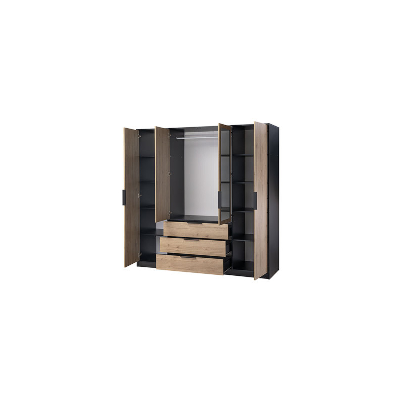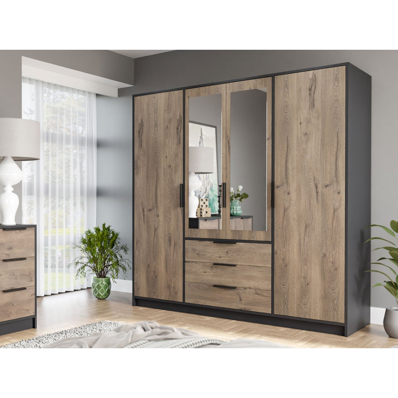 Šatní skříň Pangaz D4 se zrcadlem je skvělým základem pro oblečení a doplňky. Dovnitř se vám úspěšně vejde oblečení a další doplňky až pro dvě osoby. Četné zásuvky a kolejnice vám umožní snadno třídit košile, halenky, šaty a spodní prádlo. Model je ideální do ložnice nebo předsíně.