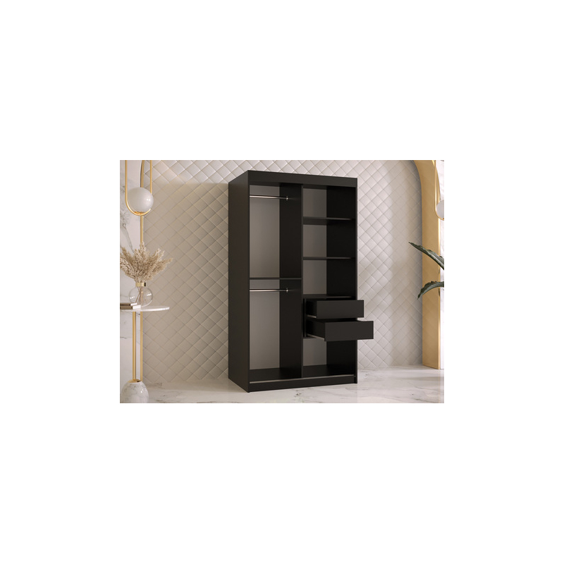 Vnitřek šatní skříně je dobře organizovaný. Tam najdete řadu polic - pomocí doplňkové možnosti ji můžete obohatit o zásuvky. Druhá část nábytku zase slouží na šatní tyče pro zavěšení oblečení na ramínkách.