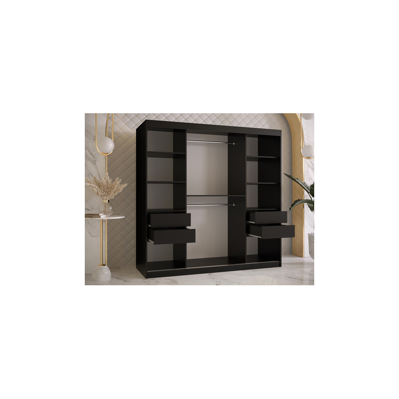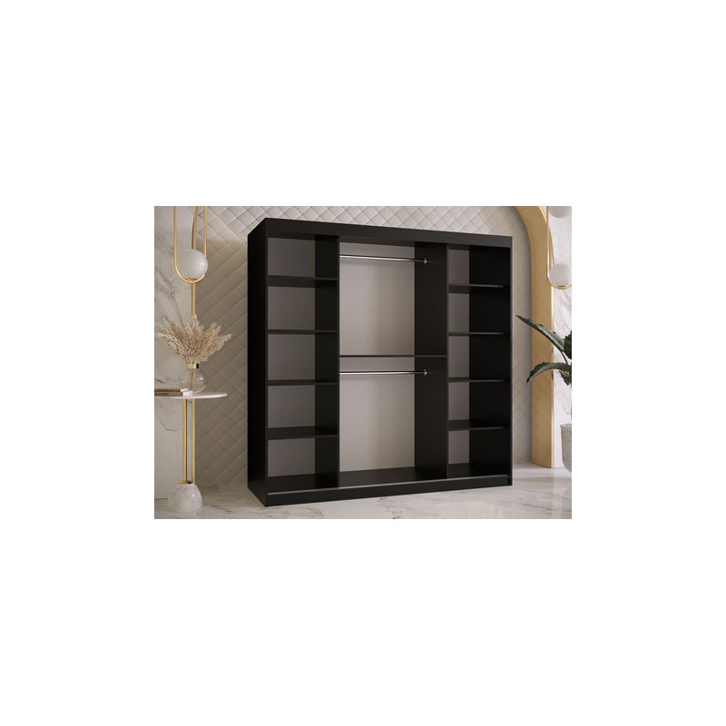 Uvnitř šatní skříně naleznete police a šatní tyče. Tato kombinace umožňuje přizpůsobit prostor vašim potřebám. Otevřením posuvných dveří získáte snadný přístup ke všem svým věcem a zároveň ušetříte místo v místnosti.