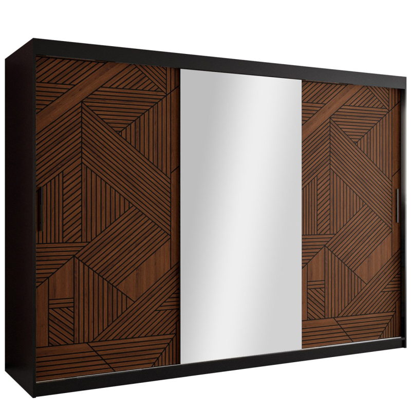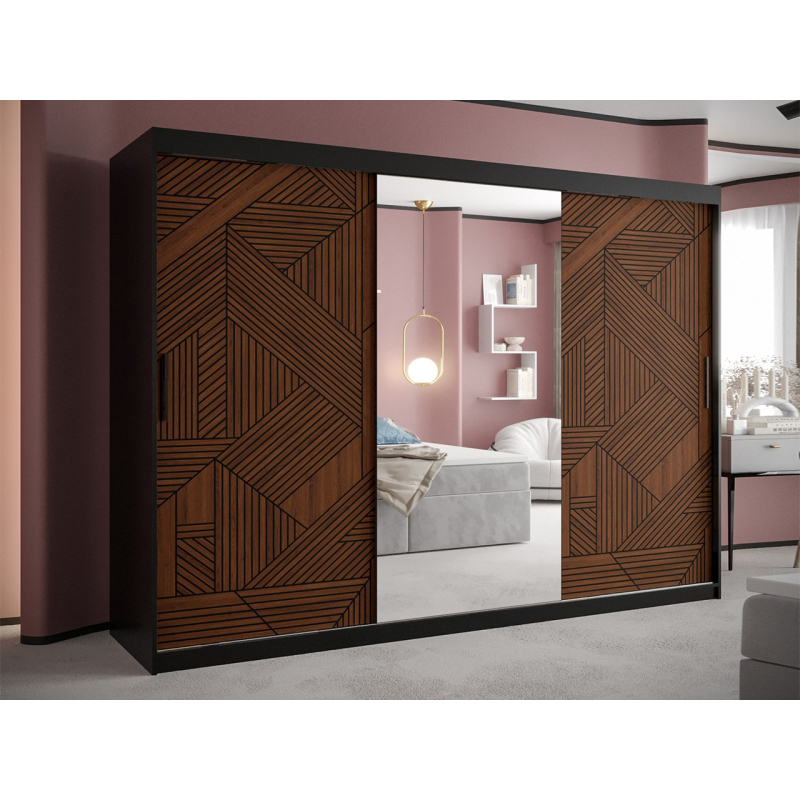 Co potěší moderní šatní skříň, je rozhodně její unikátní zdobení. Geometrické čáry uspořádané v různých směrech. Model se perfektně hodí do klasických i rustikálních aranžmá. Podívejte se hluboko do skříně a najdete mnoho organizačních možností. Velké množství prostorných polic a dva velké úložné prostory s šatními tyčemi. Navíc má varianta i zrcadlo, kde se na sebe můžete podívat před odchodem do práce.