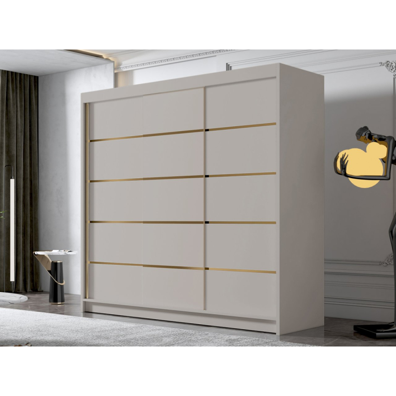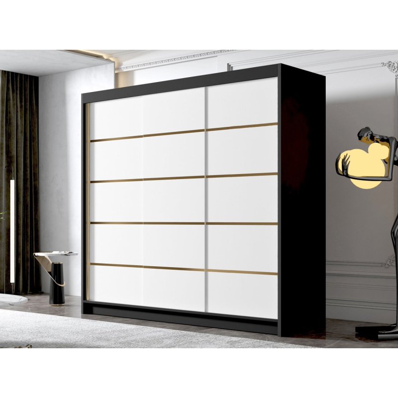 Originální design posuvné šatní skříně Fezzart VII 200 cm dokonale ladí s moderním interiérem. Módní barvy, elegantní detaily a jednoduchost, s níž byl nábytek navržen, se také dokonale hodí do stylu glamour. Avantgardu zde dodávají ozdobné lišty připevněné na čelech skříně.