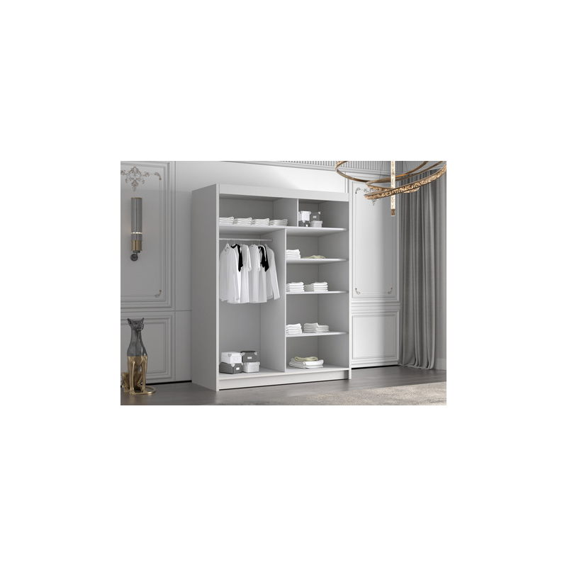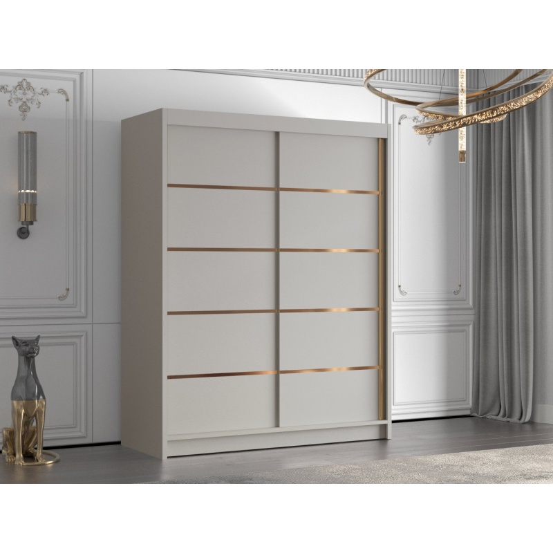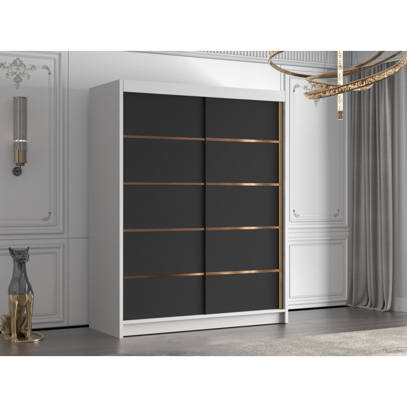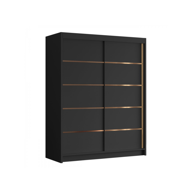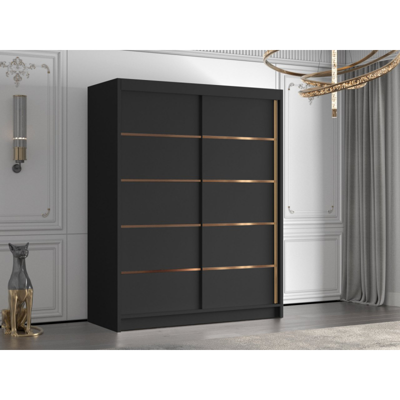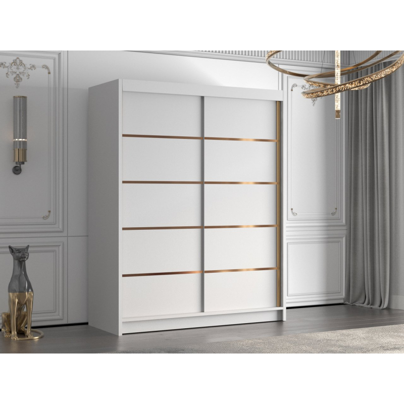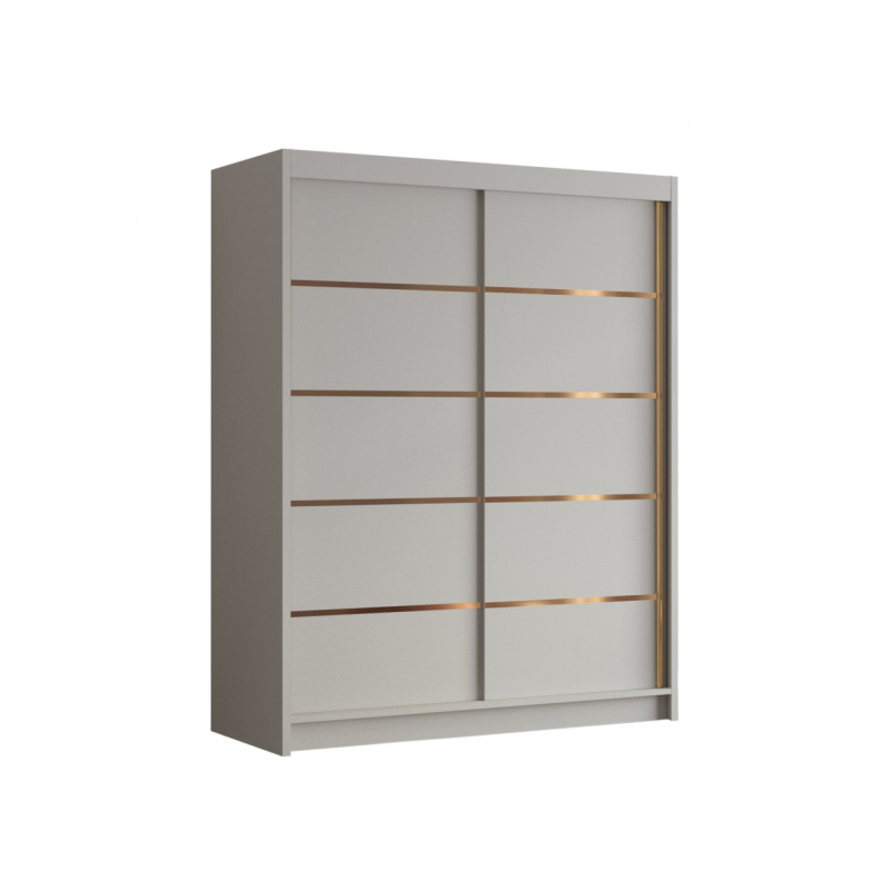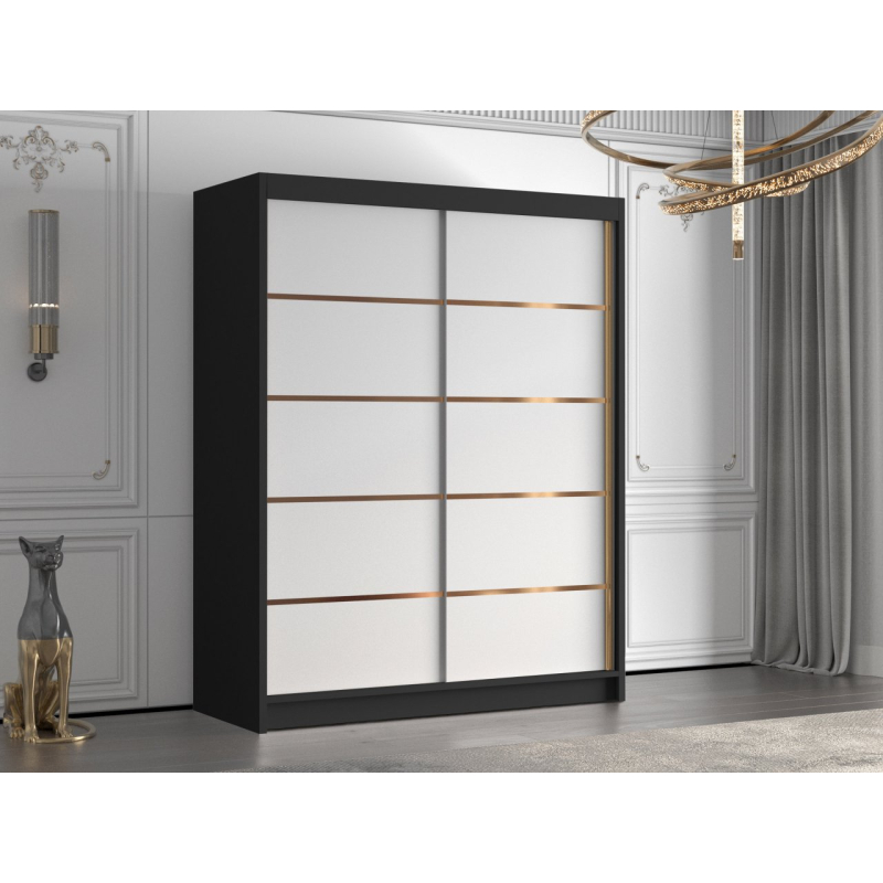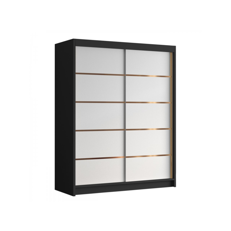 Posuvná šatní skříň Hazren IV 150 se skvěle hodí do menších i větších místností. Její přehledný interiér vám usnadní organizaci oblečení. Sportovní halenky a doplňky můžete uložit na police, zatímco prostor s tyčí vám umožní zavěsit šaty, bundy nebo svrchní oblečení. Jedinečný celek podtrhuje matný povrch a ozdobné vložky ve zlaté barvě. Výhodou skříně jsou také posuvné dveře, které jsou ideální pro malé prostory.