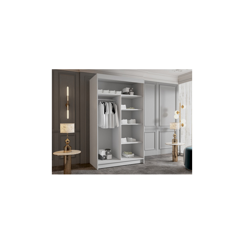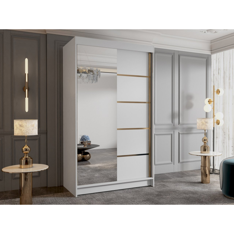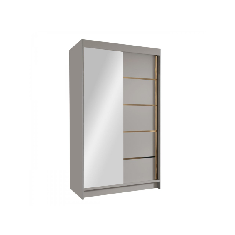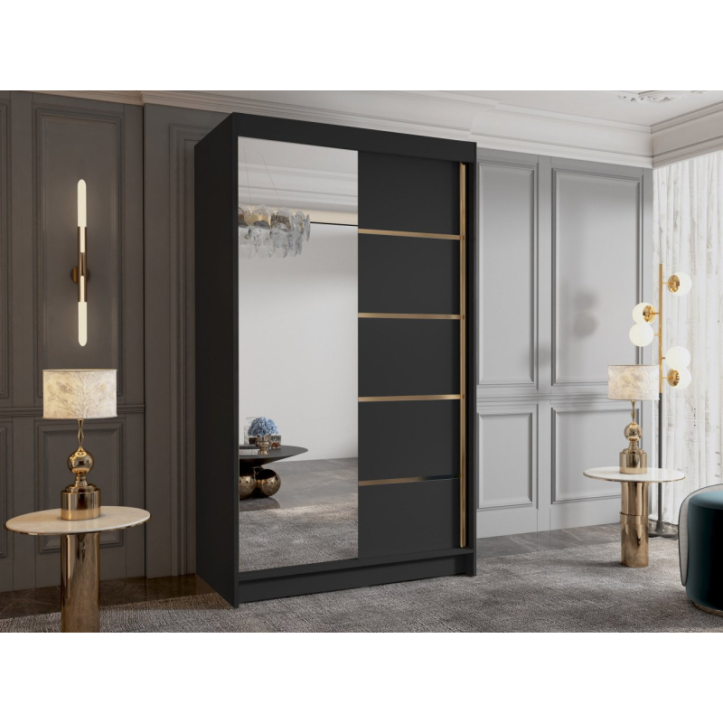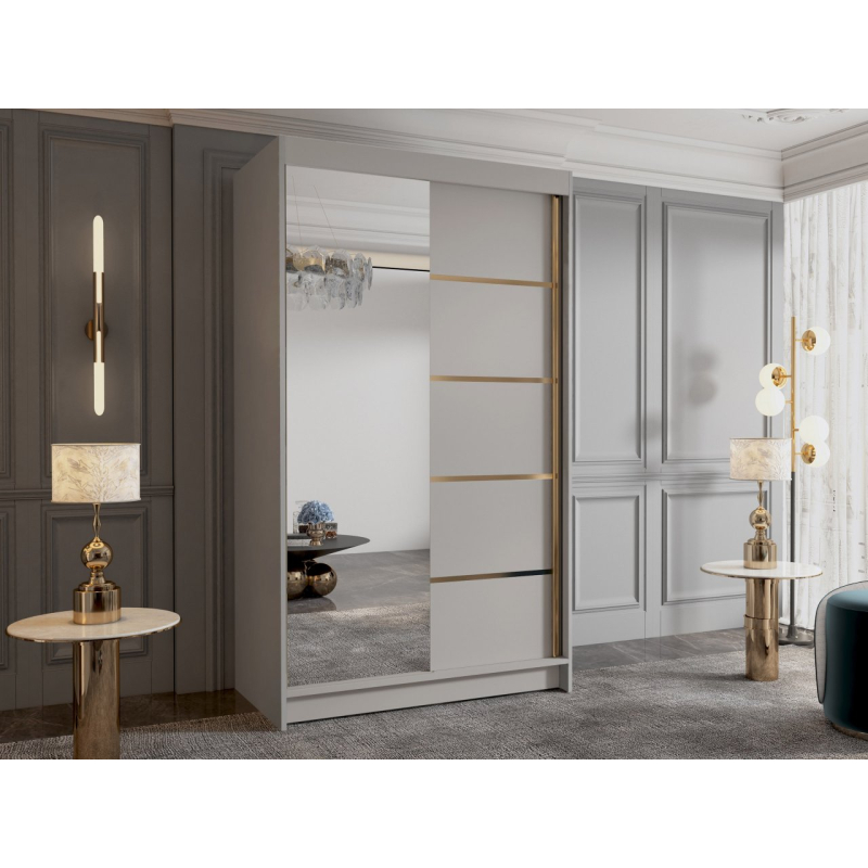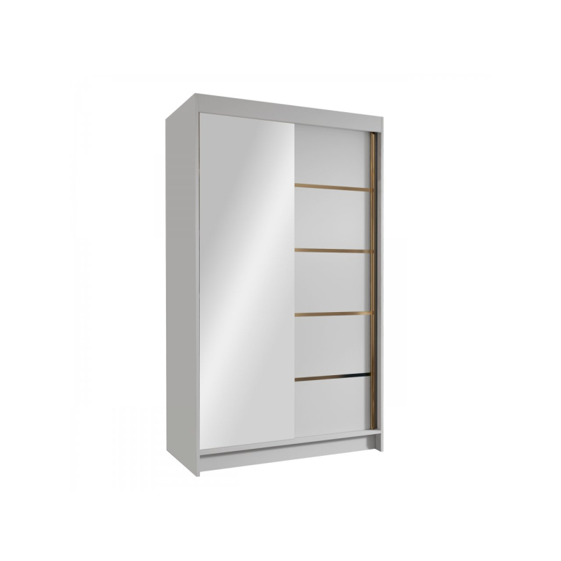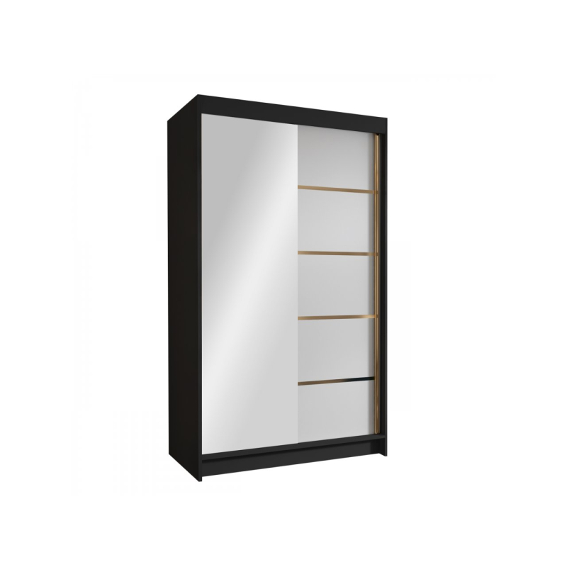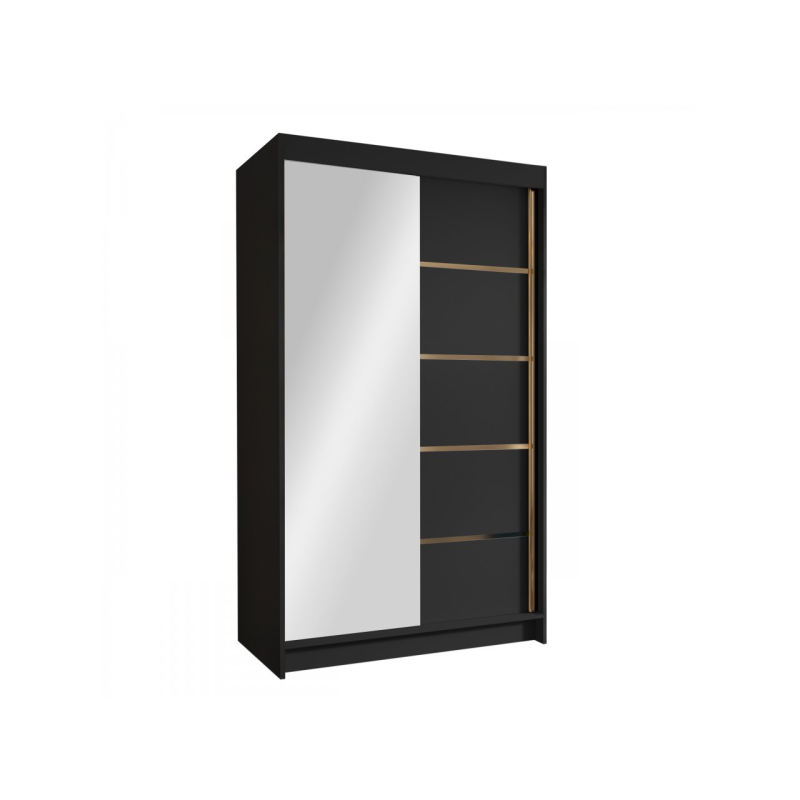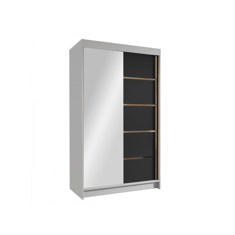 Zrcadlová šatní skříň Menny III 100 se bude skvěle vyjímat v moderních interiérech. Její matné prvky dokonale ladí se skleněnou plochou na přední straně. Je vybavena posuvnými dveřmi, takže se bude skvěle vyjímat i v malém prostoru. Zrcadlo umístěné v přední části navíc opticky zvětší malý prostor. Interiér šatní skříně s posuvnými dveřmi nabízí mnoho polic a tyč. Tato organizace umožňuje třídit oblečení podle ročních období nebo barev. Celek podtrhují vložky ve zlaté barvě.