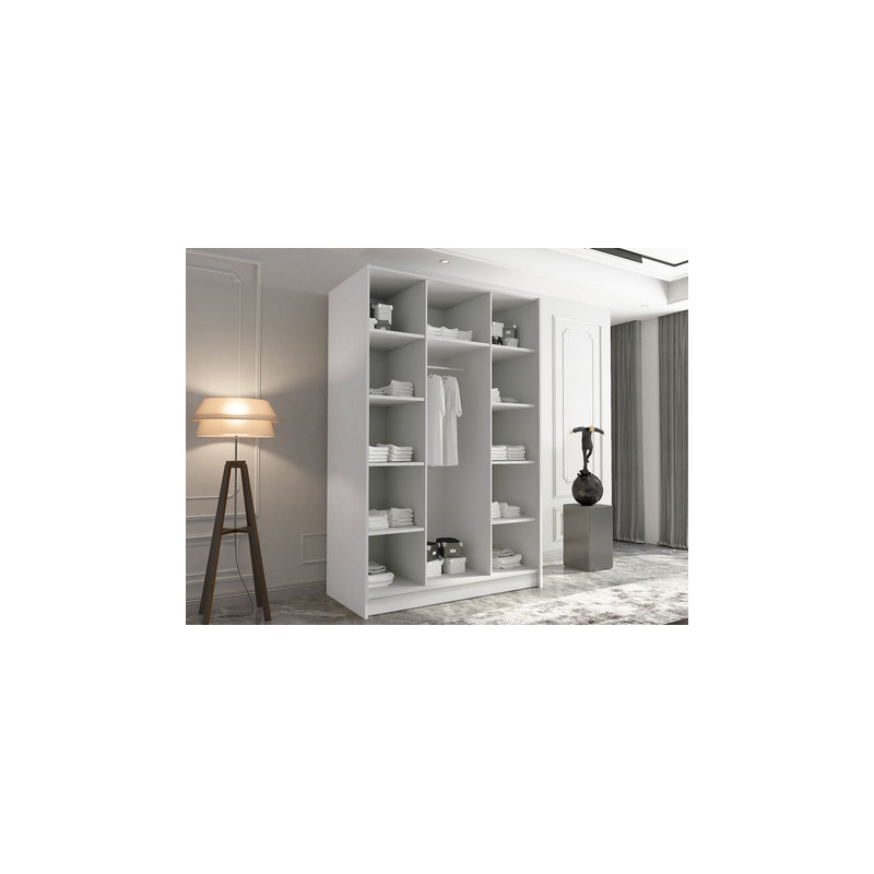 Třídveřová skříň nabízí prostorný interiér. Můžete v ní snadno uložit celou svoji kolekci oblečení. Je zde místo také na oblečení vašeho partnera. Kromě mnoha polic má skříň také tyč, která je ideální pro šaty, košile a obleky.