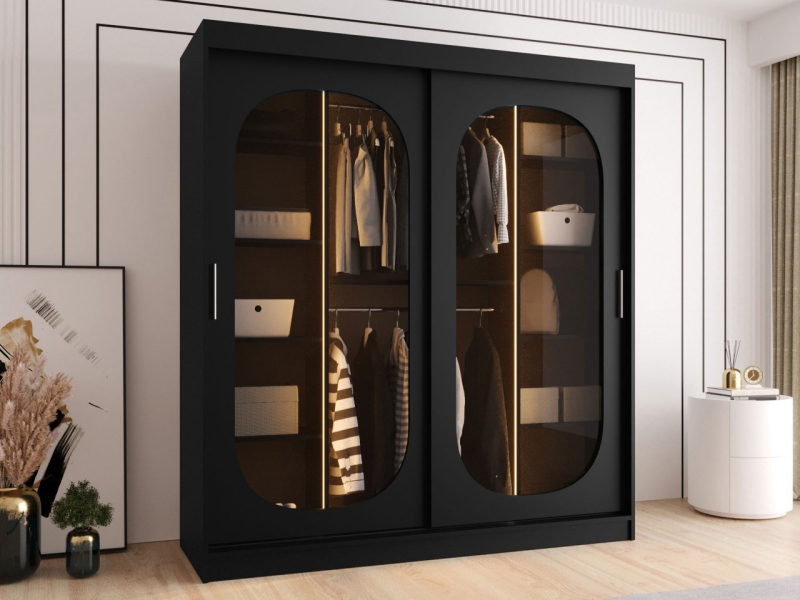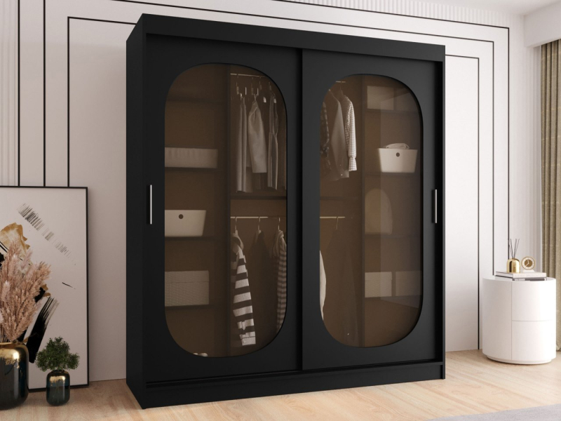 Skříň s posuvnými dveřmi Tirkon 180 cm dodá vašemu domovu nádech modernosti. Skleněné přední strany jsou zajímavým designovým prvkem, který zdůrazňuje soulad nábytku s nejnovějšími trendy v interiérovém designu. Kouřové sklo dokonale doplňuje barevné schéma skříně a dále umocňuje stylový vzhled vašeho šatníku.