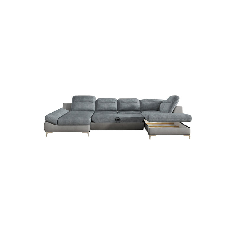 Rohová sedačka Mango XL s nastavitelnými opěrkami hlavy je model, který má moderní vzhled a zaručuje spoustu sezení díky tvaru U. Tento formát navíc nabízí dvě pohovky, které zpříjemní váš večerní relax. Rohová sedačka je vybavená funkcí na spaní a úložný prostor na ložní prádlo.