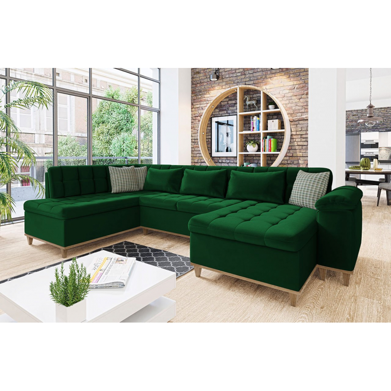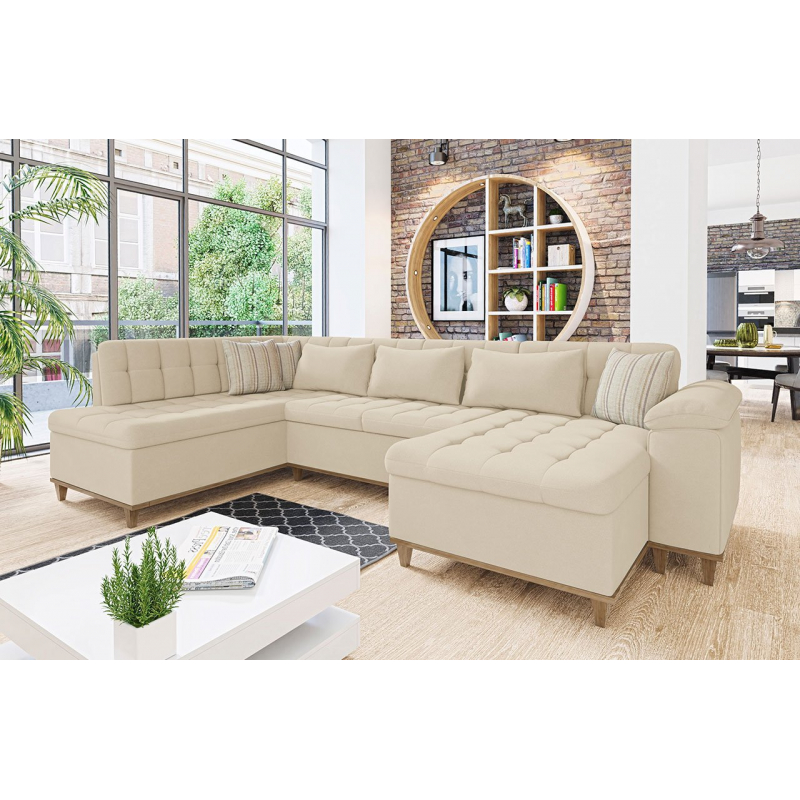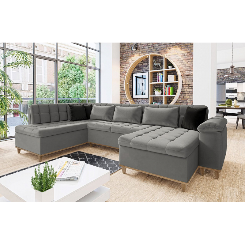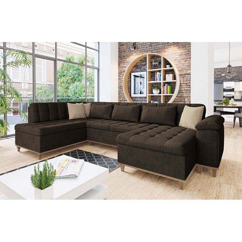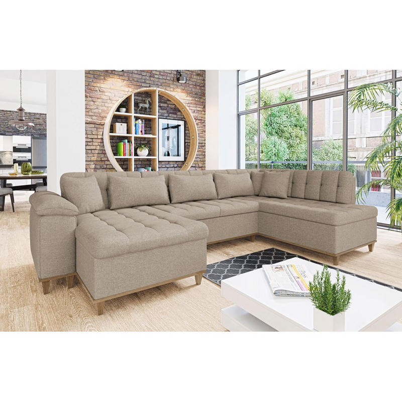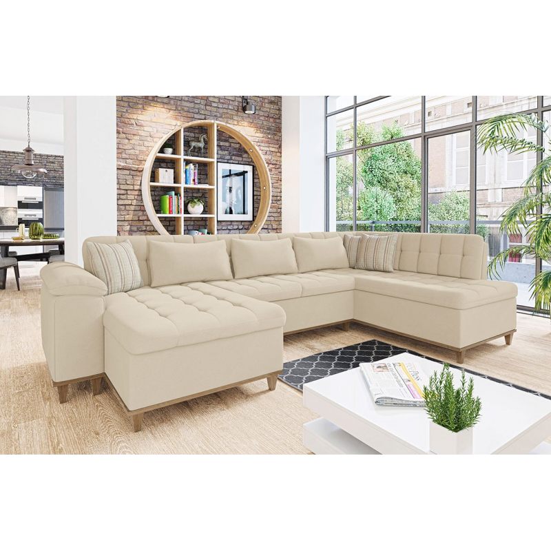 Je umístěn na stabilním, dřevěném rámu, který je nejen vizuálně atraktivní, ale také funkční – pomáhá udržovat nábytek čistý. Decentní detaily jako prošívaný sedák a opěrka dodají celku netradiční a jedinečný charakter a vnesou do vašeho obývacího pokoje závan svěžesti. Rohová sedačka „U“ navíc zaručí pocit pohodlí a relaxu jak během rodinné dovolené, tak i při společných setkáních s přáteli.