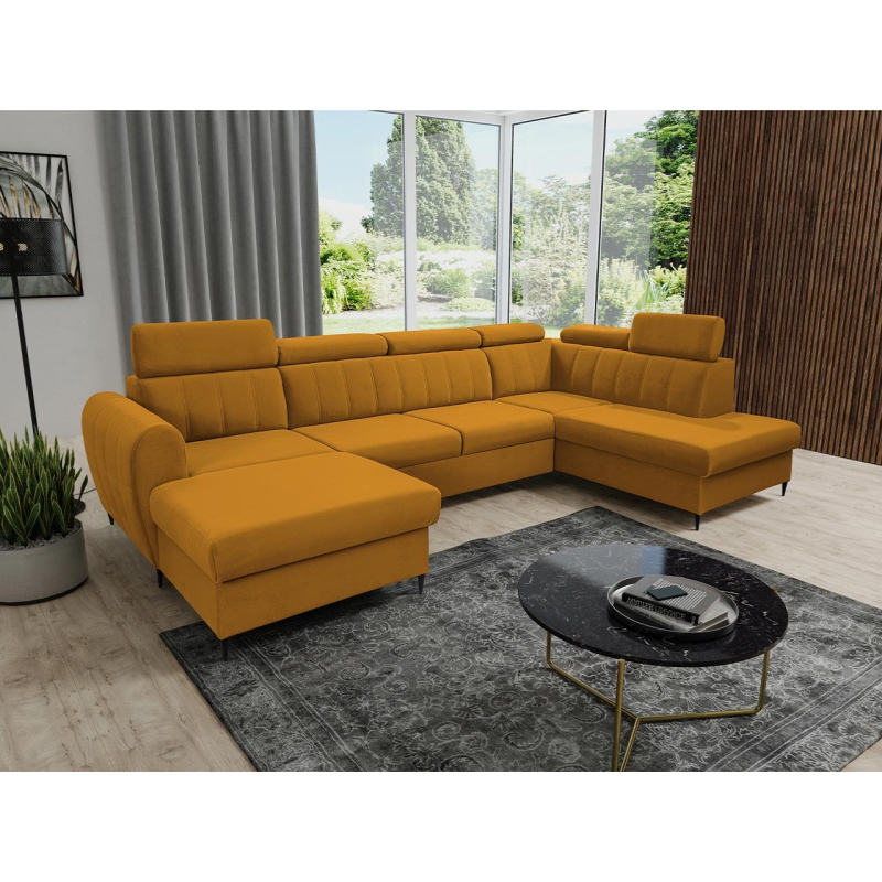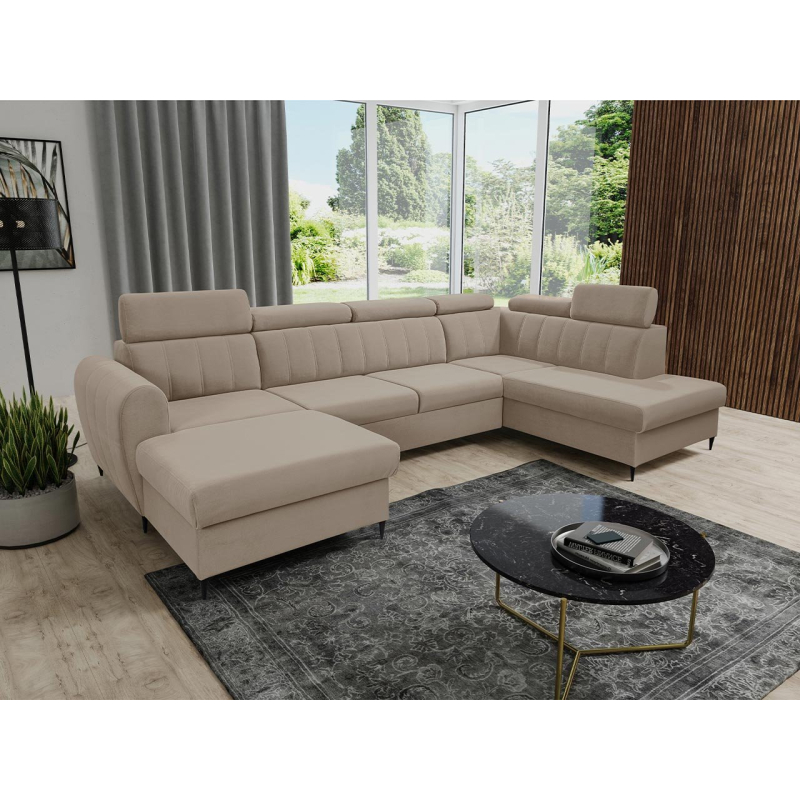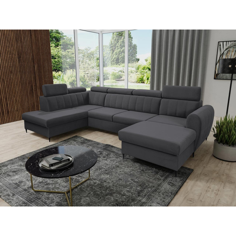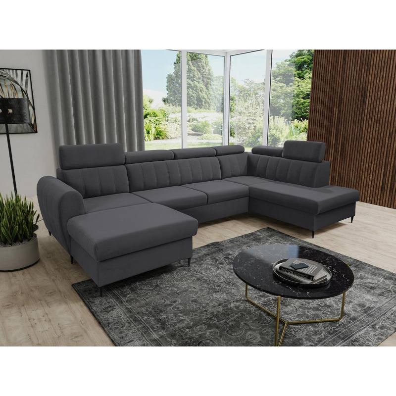 Velkou výhodou jsou polohovatelné opěrky hlavy, které umožňují pohodlné polohování hlavy při sledování filmu v obývacím pokoji. Rozkládací rohová sedací souprava je také perfektní pro noční odpočinek díky funkci spaní. Je vybavena dvěma úložnými prostormi a podporuje uspořádaný a úhledný obývací pokoj. Do přihrádek lze umístit další textilie, peřinu nebo polštáře.