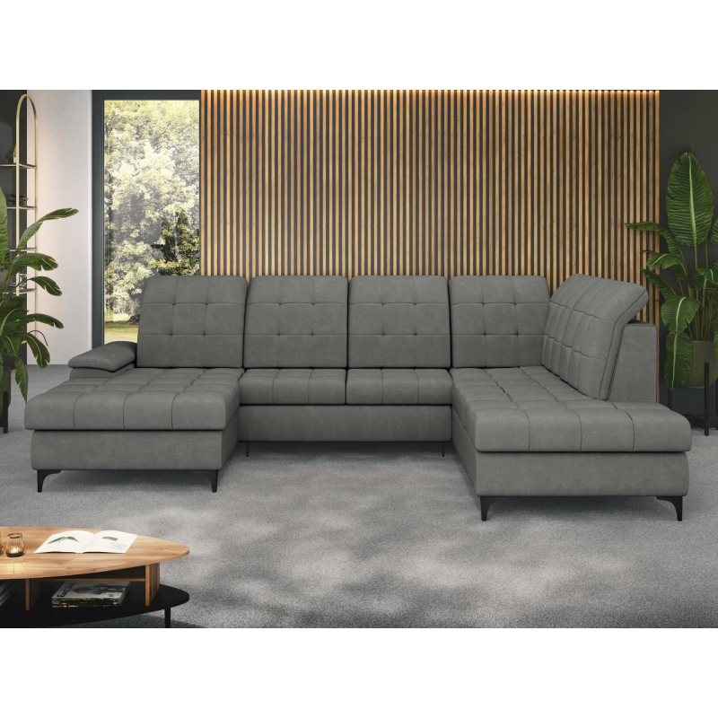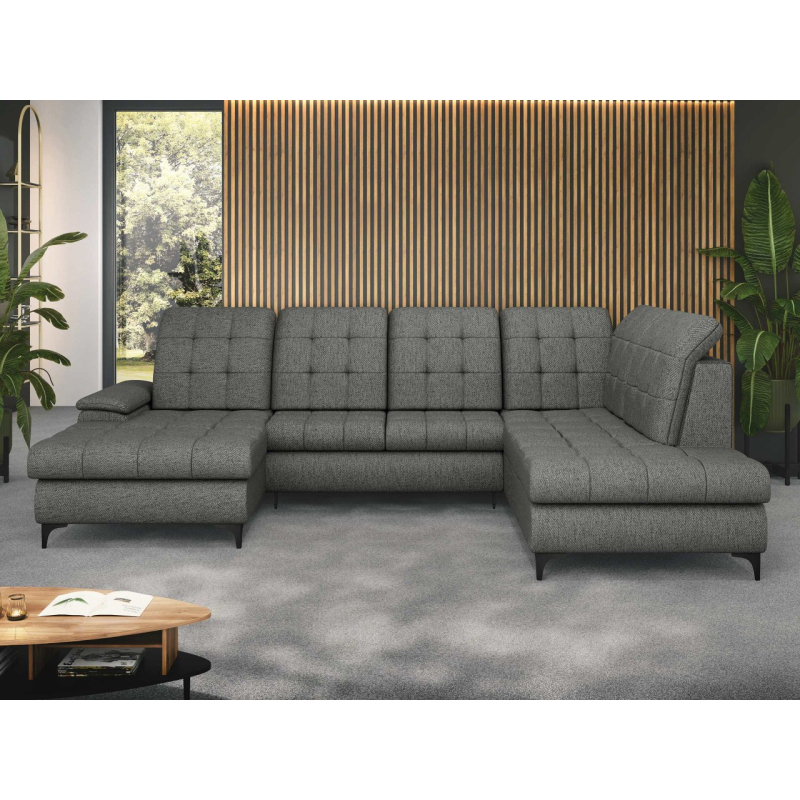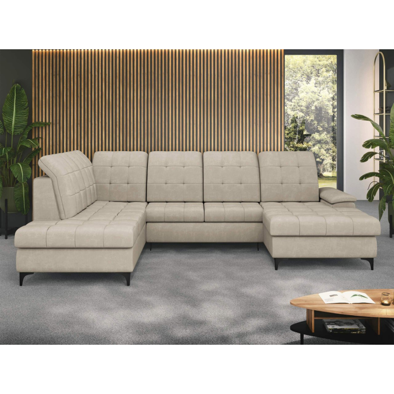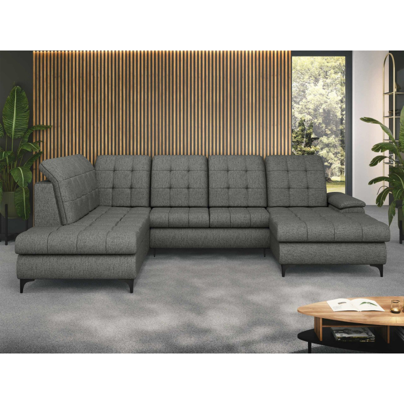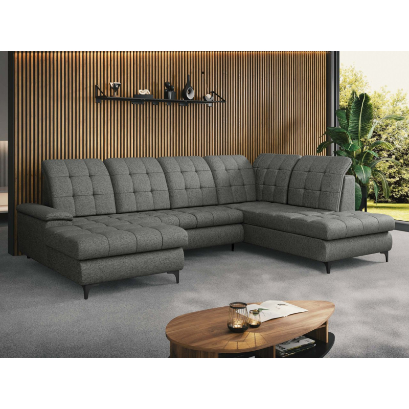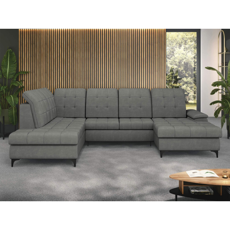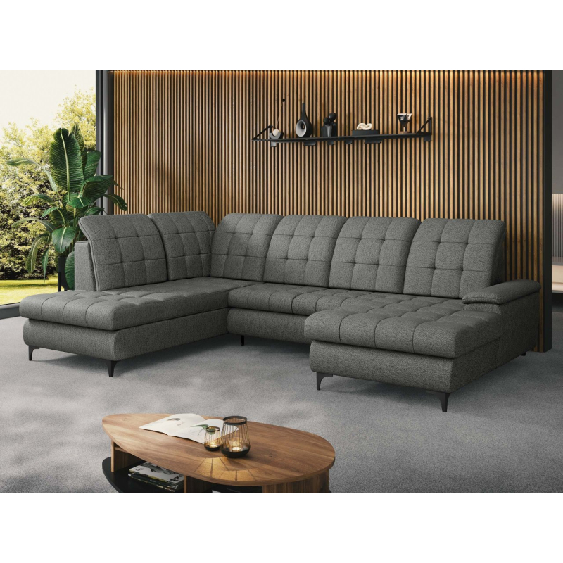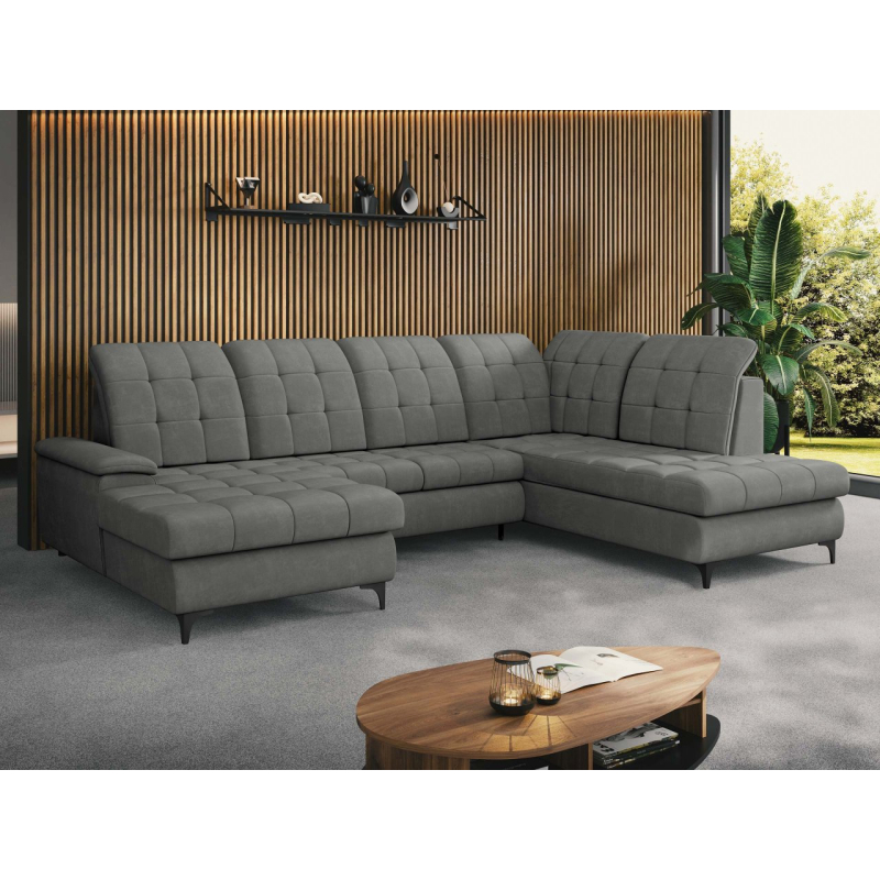 Velká rohová sedačka Veirana s funkcí na spaní se doporučuje do obýváků! Vytvoří jedinečné rekreační centrum. Módní design, velký prostor a neskutečná funkčnost jistě povzbudí mnohé z vás. Model má nastavitelné opěrky hlavy. Nabízí spoustu úložného prostoru – je vybavena dvěma prostornými přihrádkami, které se skvěle hodí pro uložení přikrývek, polštářů či jiných předmětů. Moderní rohová sedačka dokonale zapadá do nejnovějších trendů interiérového designu. Prošívání na sedadle a opěradlech dodává jedinečný charakter. Tělo je vyvýšeno na nohou, což dodává celku lehkost a eleganci.