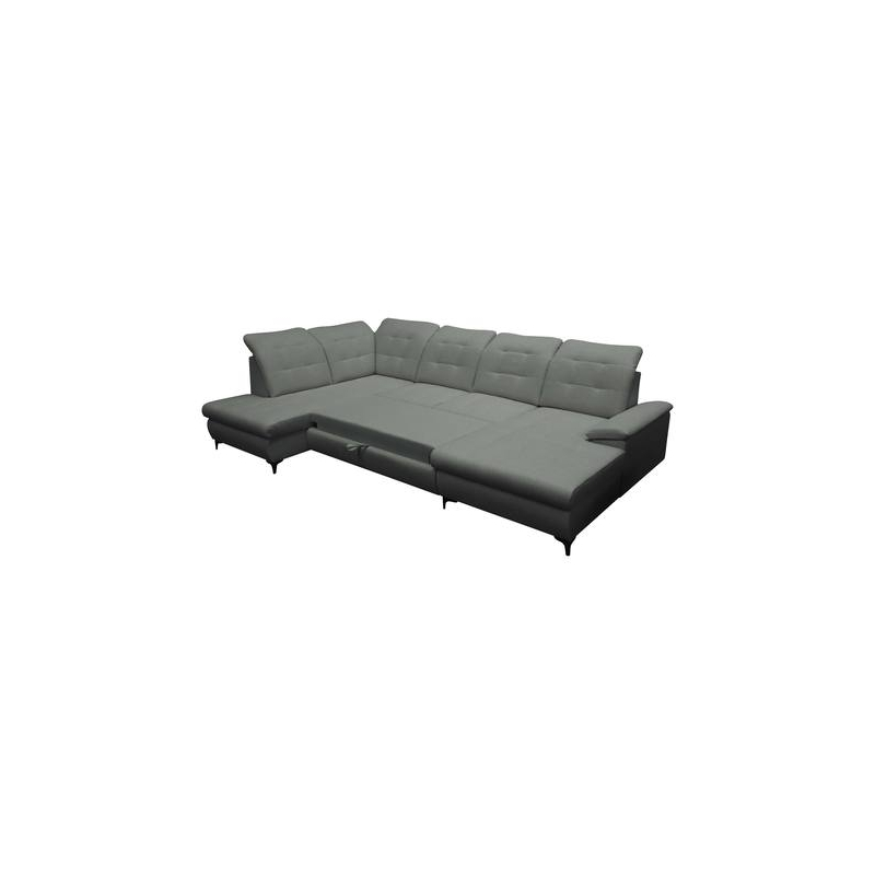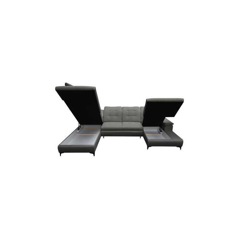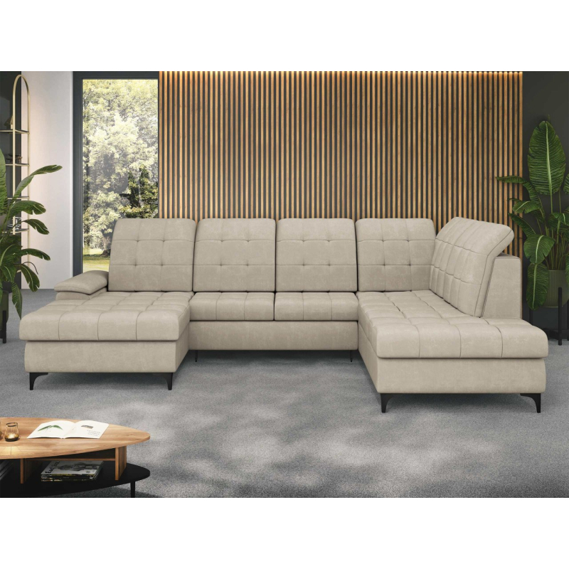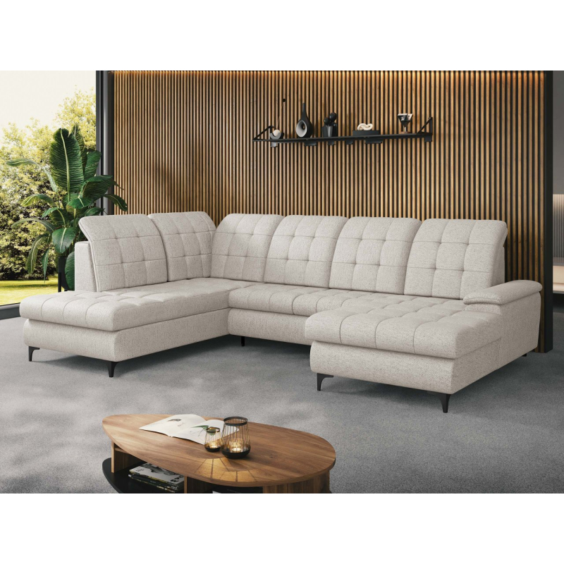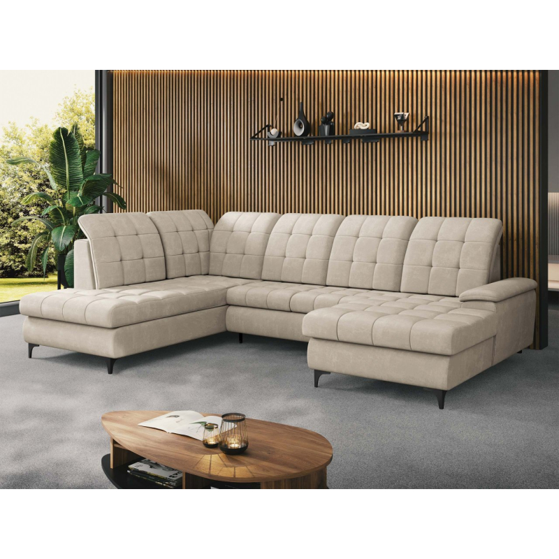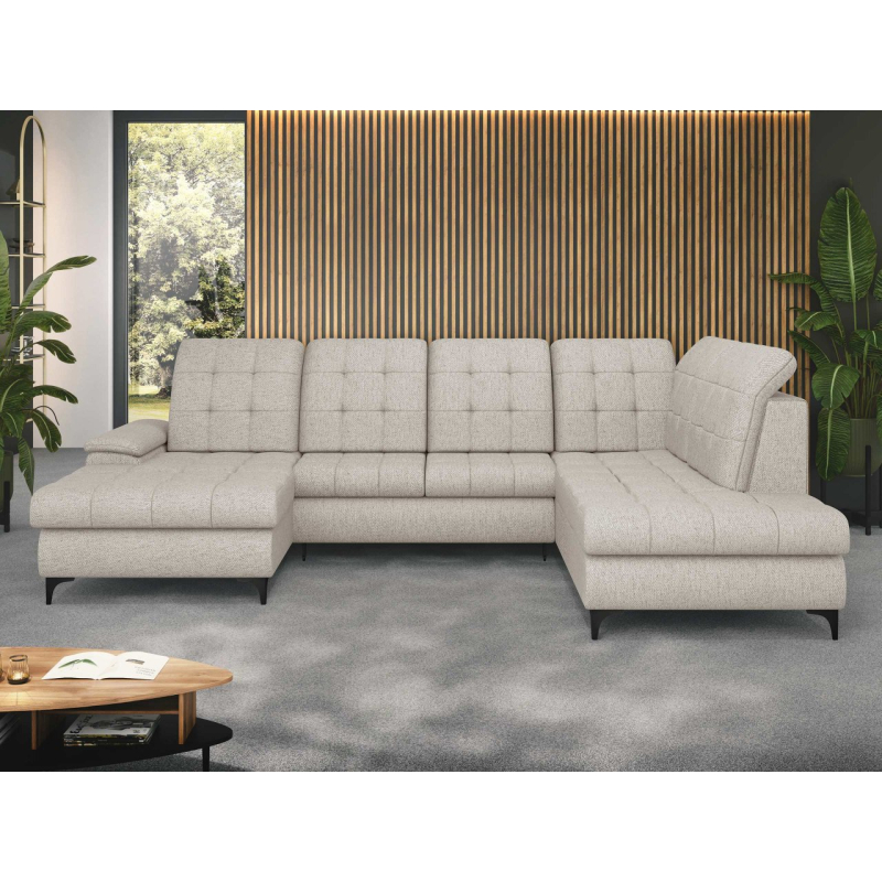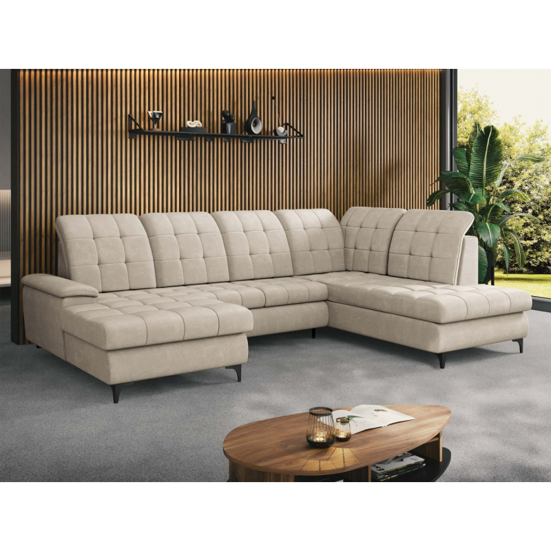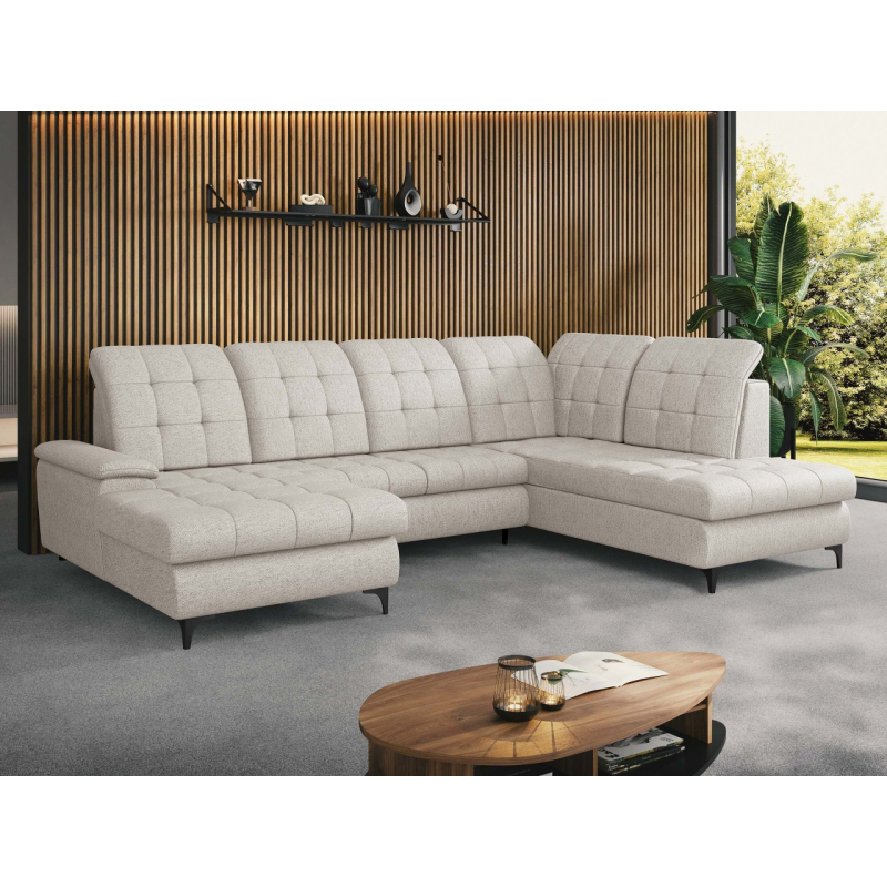 Velká rohová sedačka Veirana s funkcí na spaní se doporučuje do obýváků! Vytvoří jedinečné rekreační centrum. Módní design, velký prostor a neskutečná funkčnost jistě povzbudí mnohé z vás. Model má nastavitelné opěrky hlavy. Nabízí spoustu úložného prostoru – je vybavena dvěma prostornými přihrádkami, které se skvěle hodí pro uložení přikrývek, polštářů či jiných předmětů. Moderní rohová sedačka dokonale zapadá do nejnovějších trendů interiérového designu. Prošívání na sedadle a opěradlech dodává jedinečný charakter. Tělo je vyvýšeno na nohou, což dodává celku lehkost a eleganci.