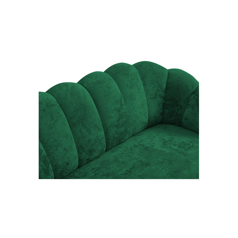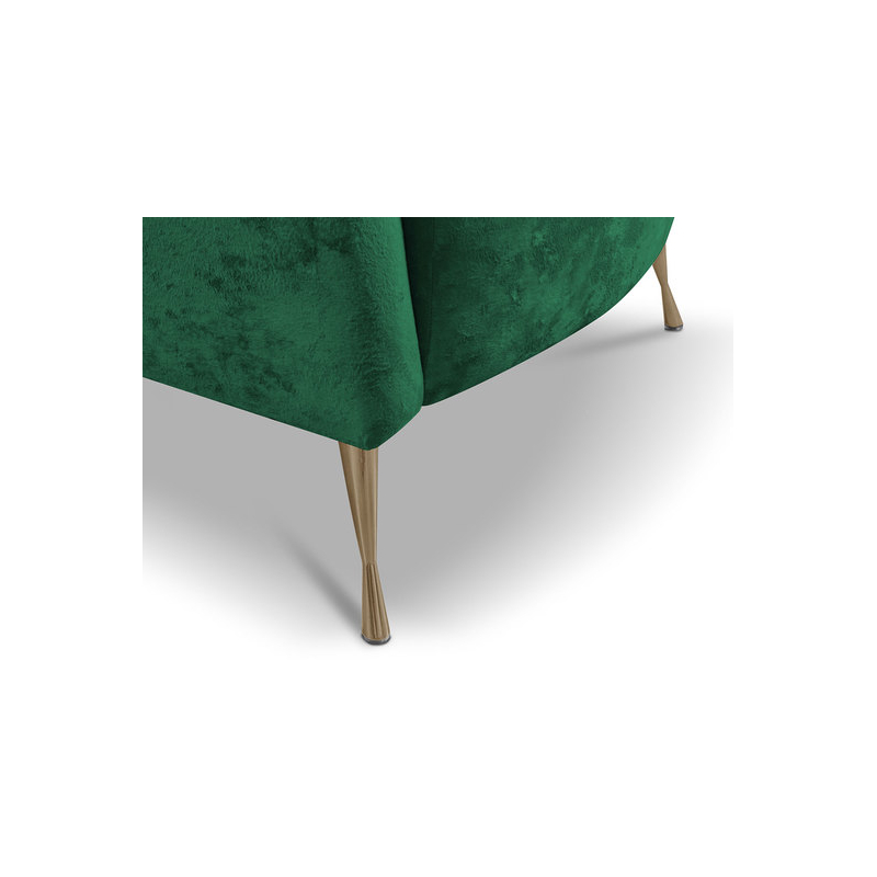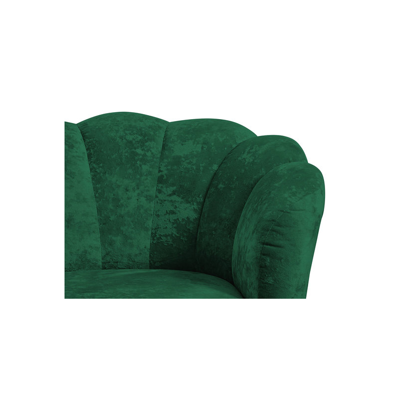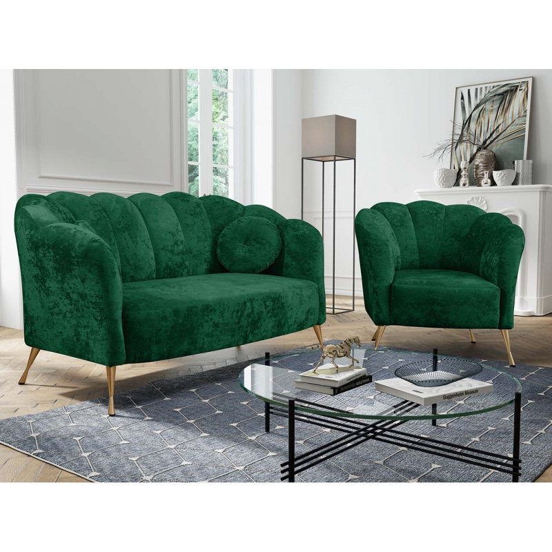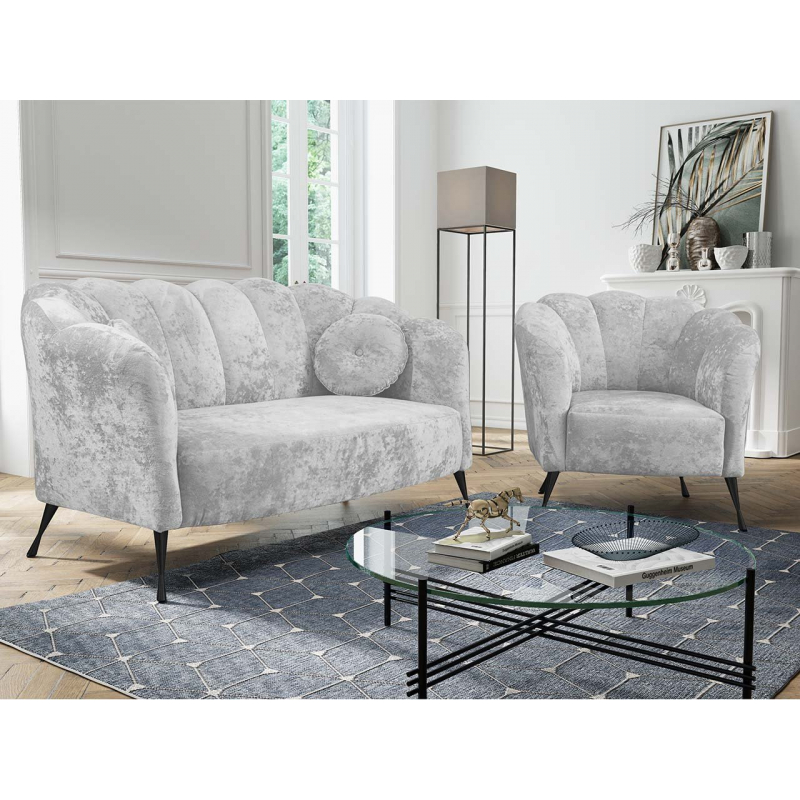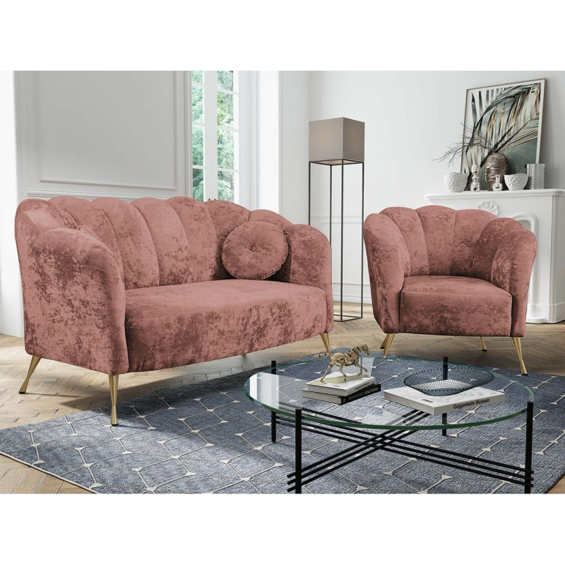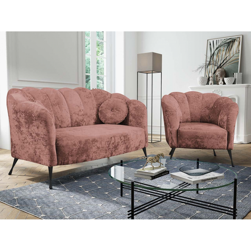 Odpočinková souprava Terkaz je nábytek v elegantním stylu Glamour. Souprava obsahuje 155 cm dlouhou pohovku a křeslo pro jednu osobu. Charakteristickým prvkem sestavy je opěrka, vyrobená ve vlnovém vzoru, která krásně obepíná pohovku a křeslo. Na druhé straně je čalouněný nábytek potažen na dotek příjemnou měkkou plyšovou látkou. Dokonale zvýrazňuje prošívání, které se táhne podél opěradla. Celek doplňují vysoké nohy vyrobené z kovu. Dodávají nábytku půvab a styl. Prezentovaná pohovka a křeslo jsou volně stojící.