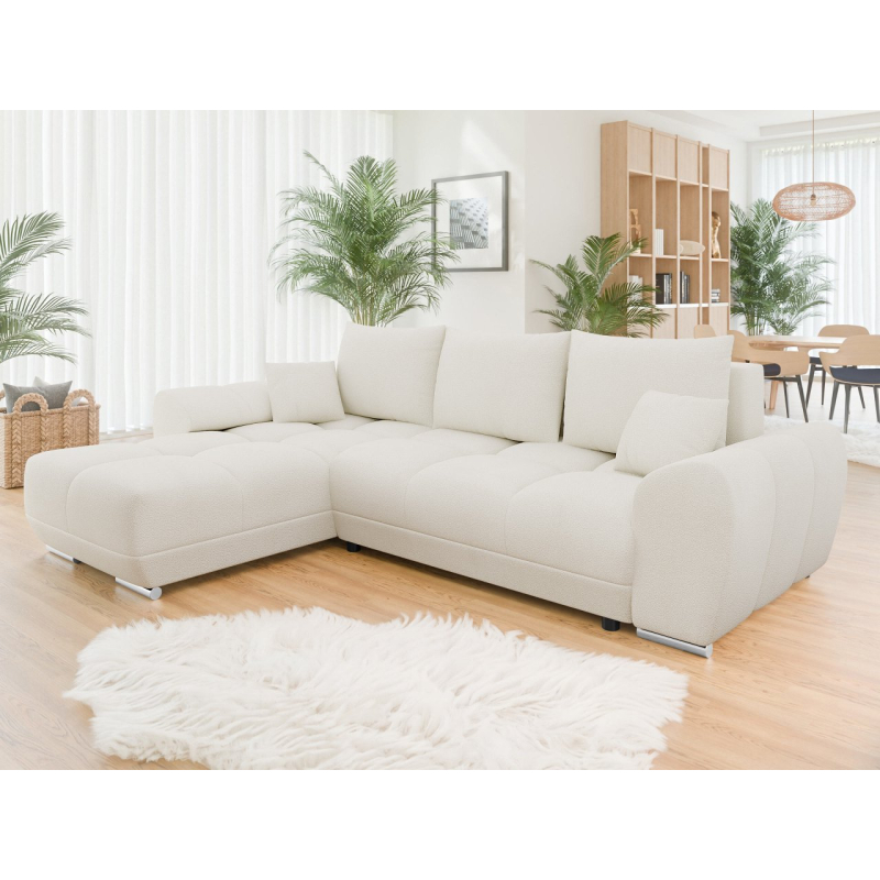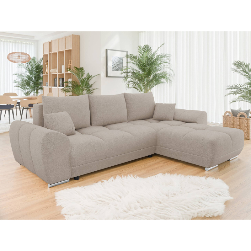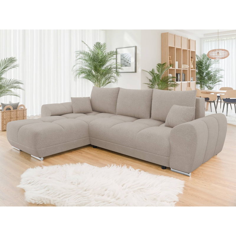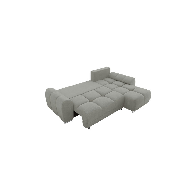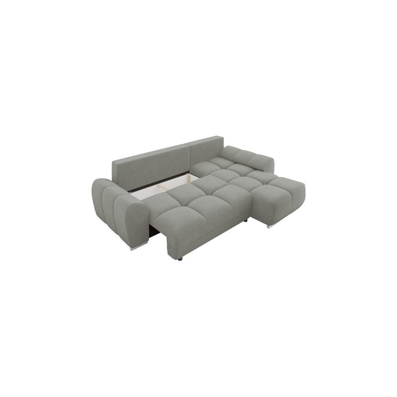 Stylovou rohovou sedačku s funkcí na spaní lze také rozložit. Posunutím sedačky dopředu odkryjeme i nádobu na podestýlku. Tato diskrétní přihrádka je ideální pro uložení ložního prádla, teplých přikrývek nebo sezónního oblečení.