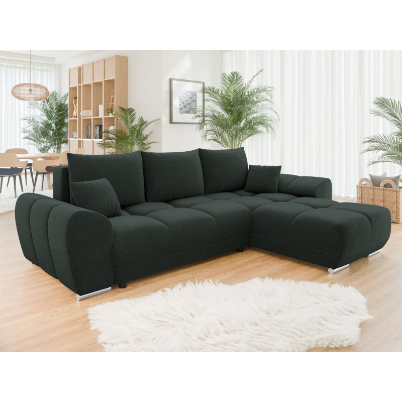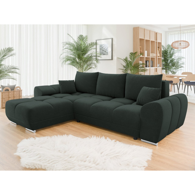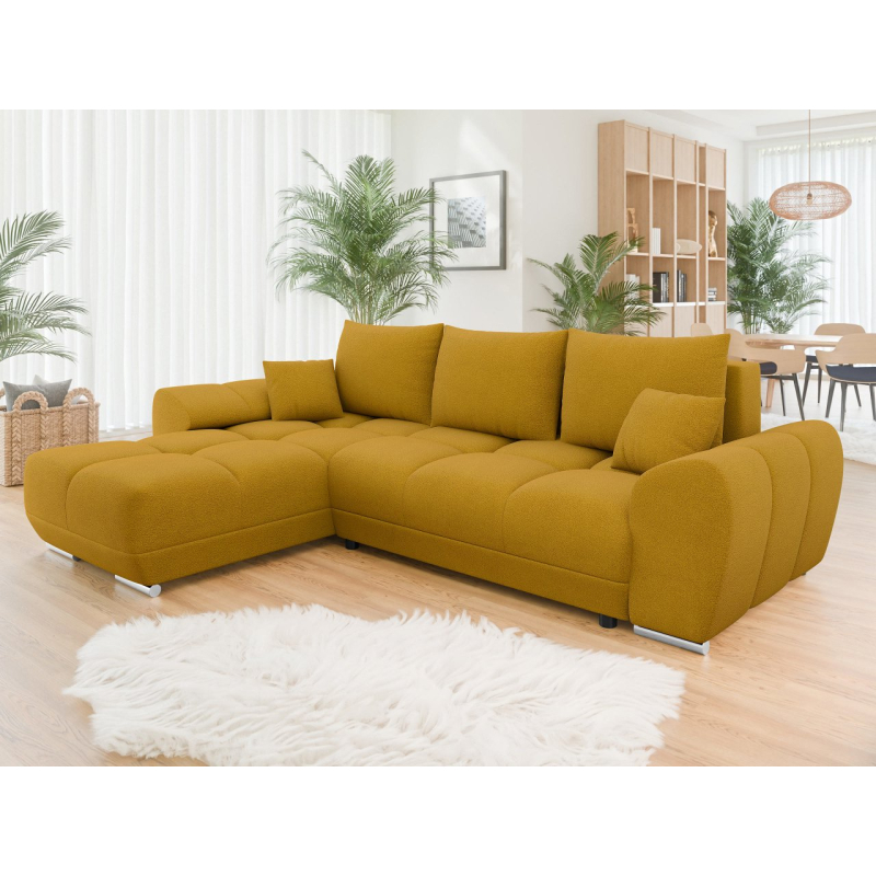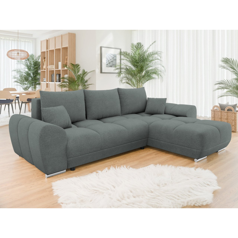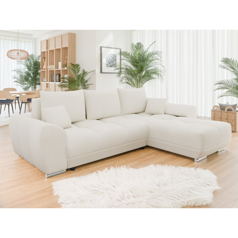 Stylovou rohovou sedačku s funkcí na spaní lze také rozložit. Posunutím sedačky dopředu odkryjeme i nádobu na podestýlku. Tato diskrétní přihrádka je ideální pro uložení ložního prádla, teplých přikrývek nebo sezónního oblečení.