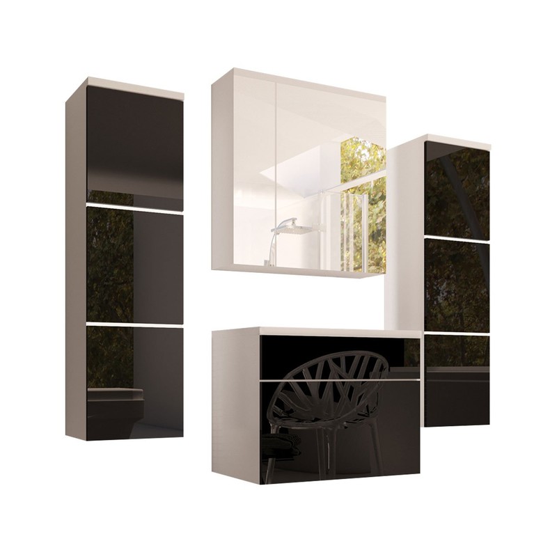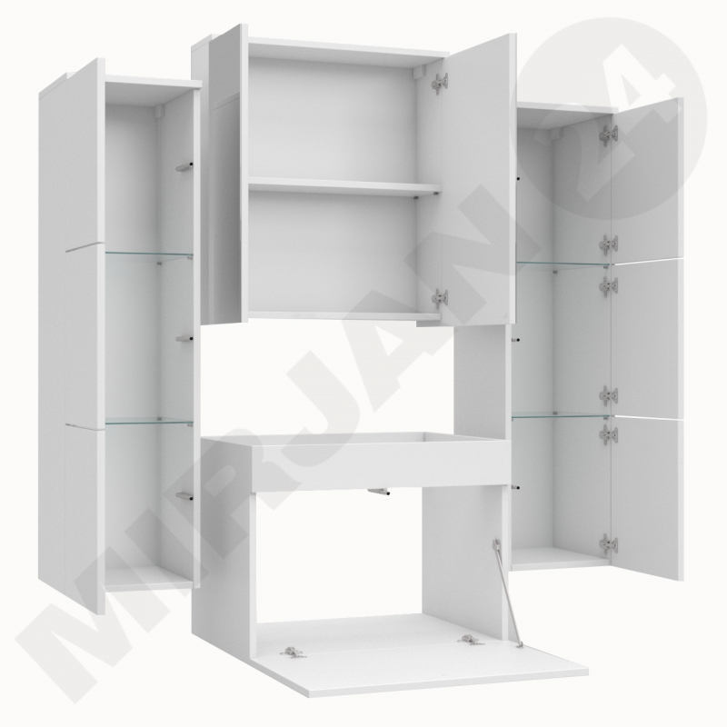 Základem soupravy je závěsná skříň. Systém polic uvnitř prostorné skříňky usnadňuje uložení potřebného příslušenství nebo ručníků. Ozdobou koupelnového nábytku je působivá skříň se zrcadlem, díky které získáte diskrétní úložný prostor pro malé předměty. Velké zrcadlo koupelnové skříňky odráží světlo a interiér působí útulnější. Komplet je doplněn umyvadlovou skříňkou s výsuvnými dvířky.
