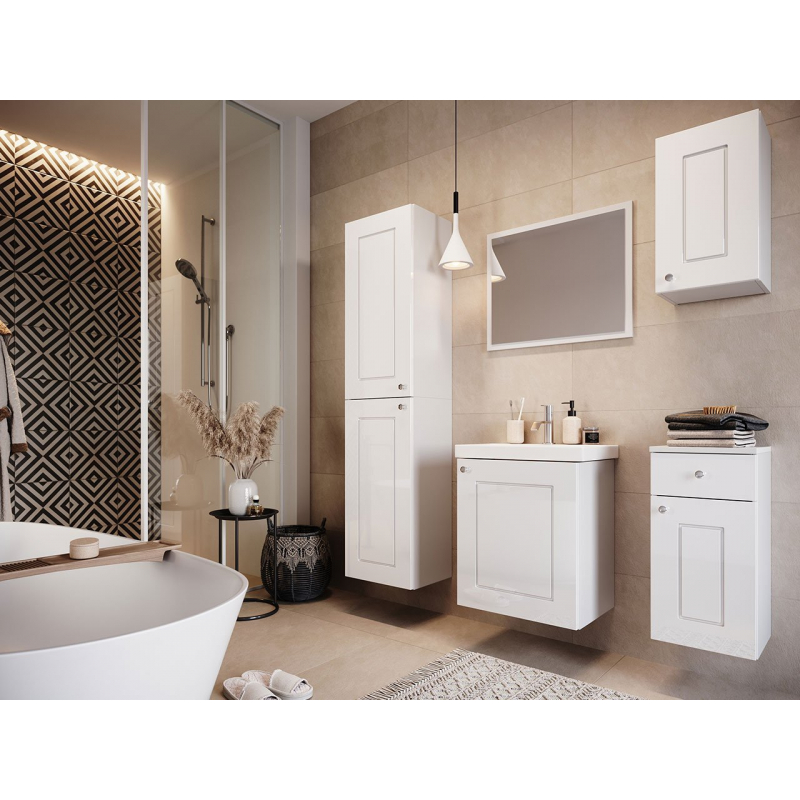 Koupelnový nábytek má univerzální velikosti, takže se vejde do mnoha interiérů různých velikostí. Světlé barvy sestavy v kombinaci s velkým zrcadlem menší místnosti opticky zvětší. Koupelnový nábytek s umyvadlem Wiryd II je navržen tak, aby se nedotýkal podlahy. Díky tomuto řešení se případné povrchové nečistoty na podlaze snadno odstraní. Elegantním detailem skříněk jsou úchyty dvířek v podobě knoflíků v barvě chromu. Koupelnový nábytek se skládá z keramického umyvadla Durable, obdélníkového zrcadla a závěsných skříněk.