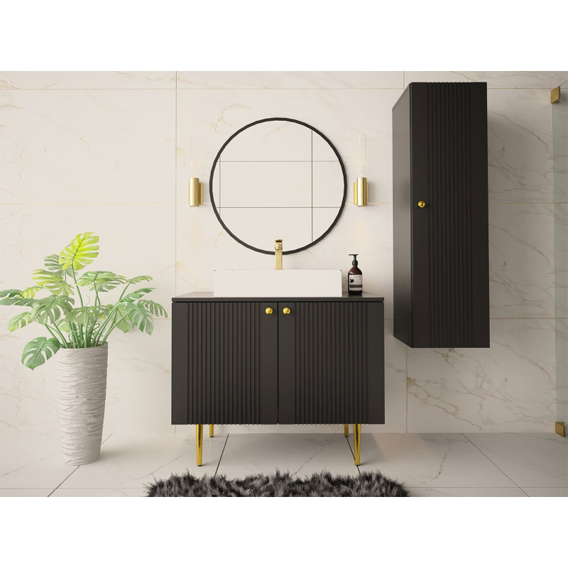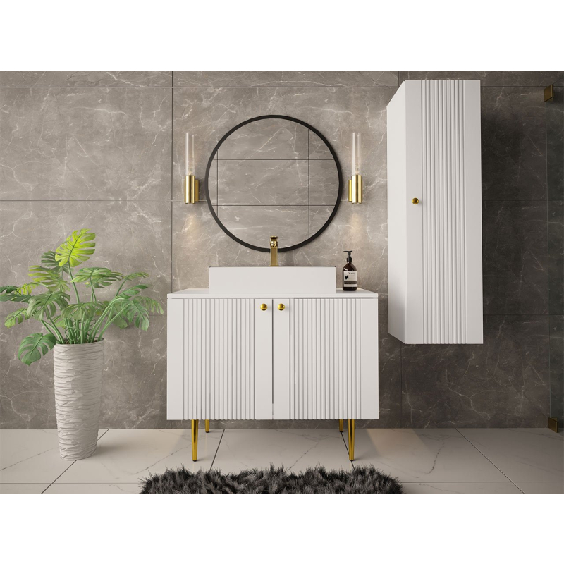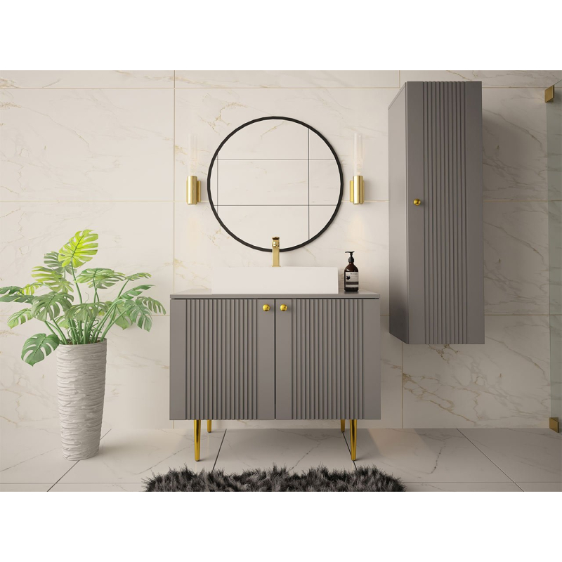 Zaobalte svůj interiér úžasným aranžmá. Koupelnový nábytek Cintori III je jedinečnou kombinací stylu a funkčnosti. Kombinace frézovaných čel se zlatými doplňky připomíná glamour atmosféru. Takový vzhled potěší. Díky praktickým řešením usnadňuje každodenní používání.