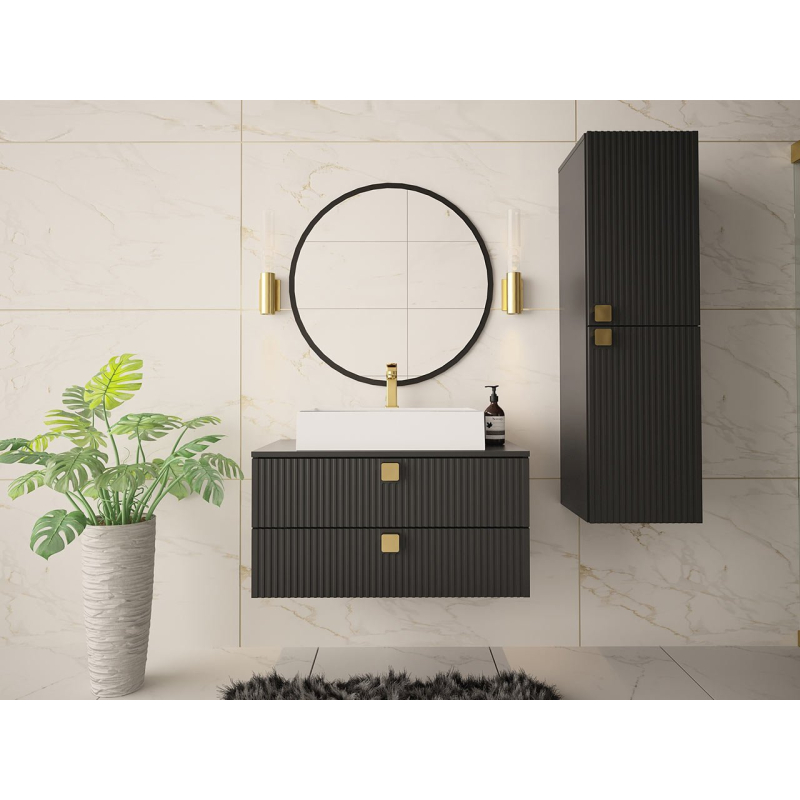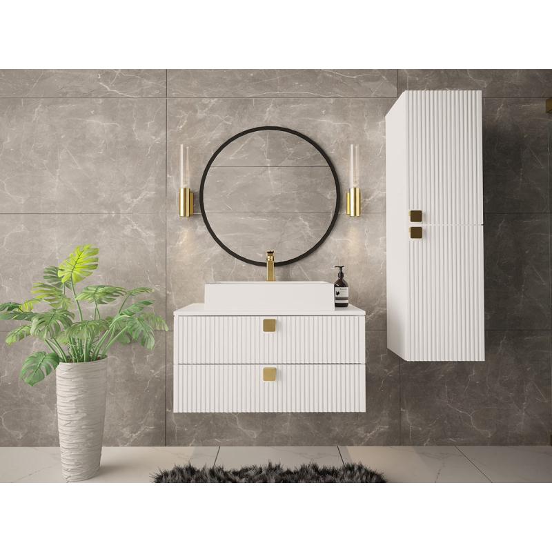 Kombinace úchytek ve zlaté barvě s ozdobným frézováním na přední straně působí úžasně vizuálně. Jak závěsná skříňka, tak skříňka pod umyvadlem mají dostatek úložného prostoru. Do soupravy můžete dokoupit sifon a umyvadlo. Představený koupelnový nábytek promění vaše zařízení a dodá mu exkluzivní nádech.
