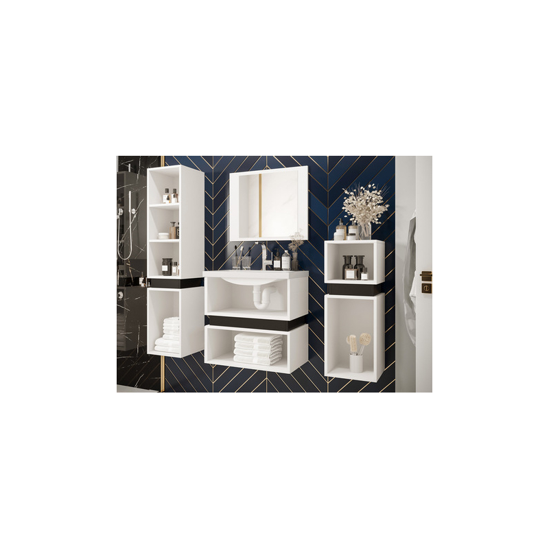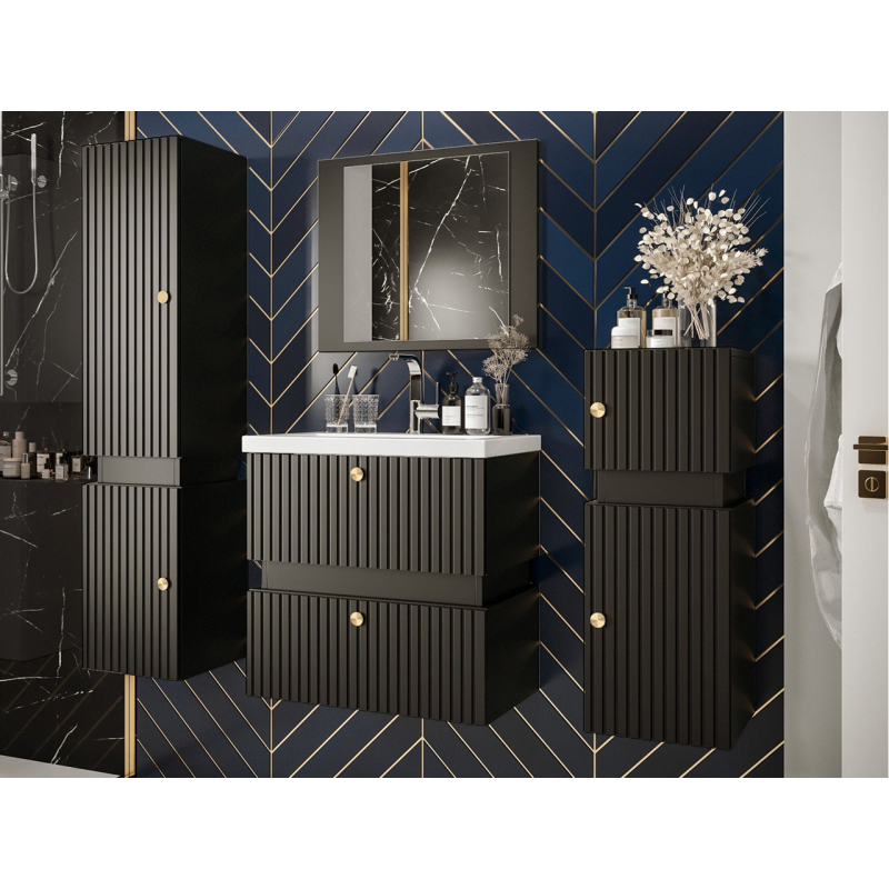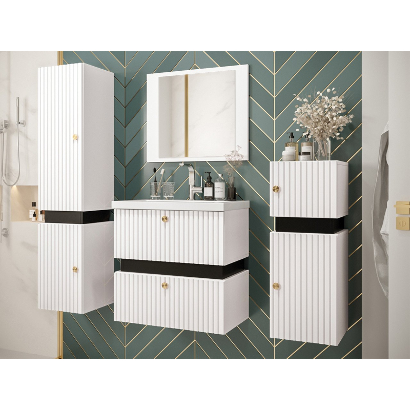 Sestava obsahuje: dva elegantní sloupkové skříňky, skříňku pod umyvadlo, panel se zrcadlem a umyvadlo (k dispozici za příplatek). Jedinečné ozdobné frézování na čelech dodává nábytku osobitý charakter a jemná zlatá barva úchytek podtrhuje jejich propracovanost. Každý kus koupelnového nábytku byl pečlivě navržen tak, aby vytvořil moderní a luxusní interiér. Sloupkové skříňky nabízejí dostatek úložného prostoru, takže doplňky a toaletní potřeby zde najdou dokonalou skrýš. Připravte se na zážitek, který vaši koupelnu posune na novou úroveň luxusu a estetiky!