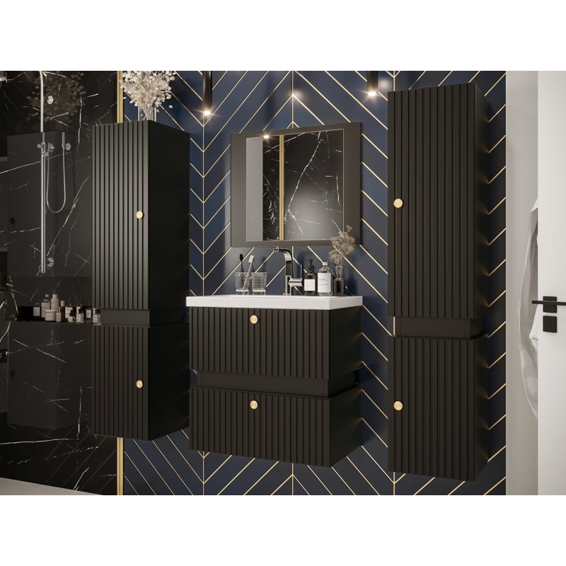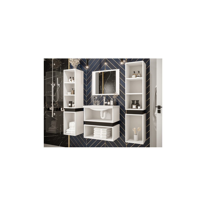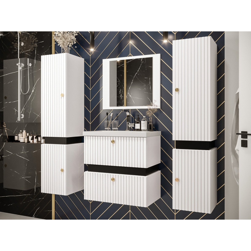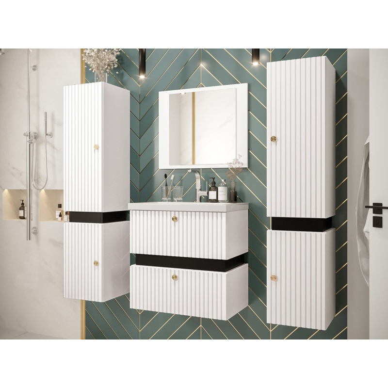 Sestava se skládá z podstavce, skříňky pod umyvadlo, panelu se zrcadlem a umyvadla (volitelně). Díky dekorativním frézovaným čelům a jemným úchytkám ve zlaté barvě je Syliko souprava ideální pro moderní interiéry s nádechem glamour. Prezentovaný koupelnový nábytek je zároveň praktickým úložným základem. Své místo v něm najdou kosmetika, čisticí prostředky i pečující doplňky. Připravte se na koupelnu, která se stane oázou krásy a elegance. Syliko - váš styl, vaše pohodlí, vaše volba.