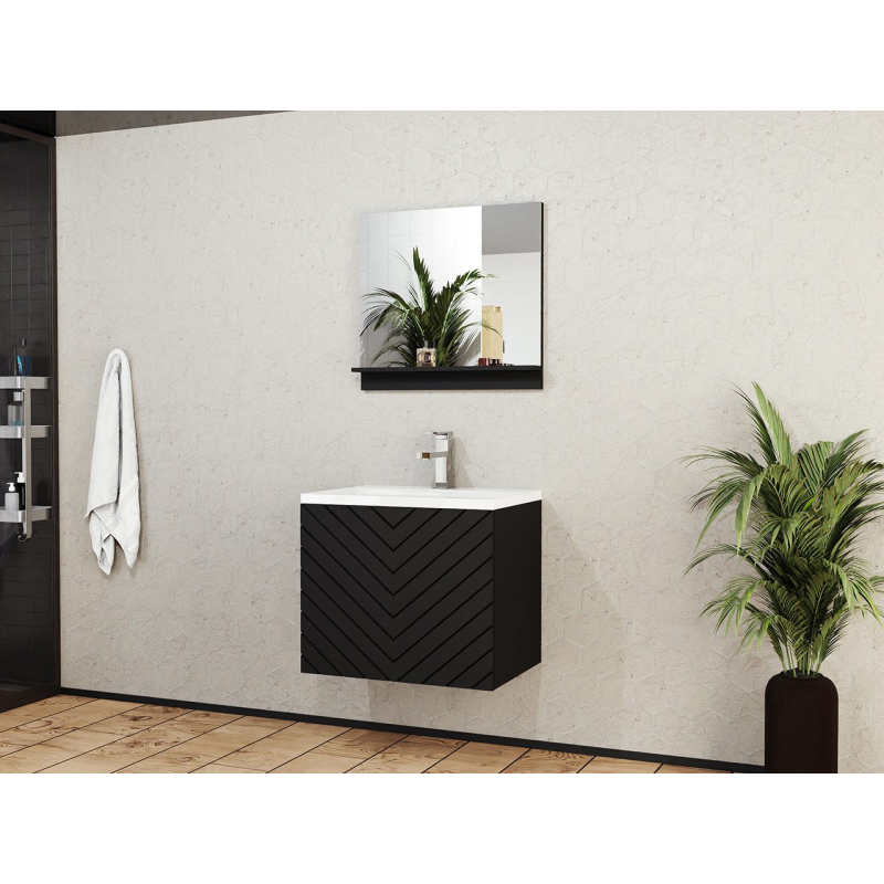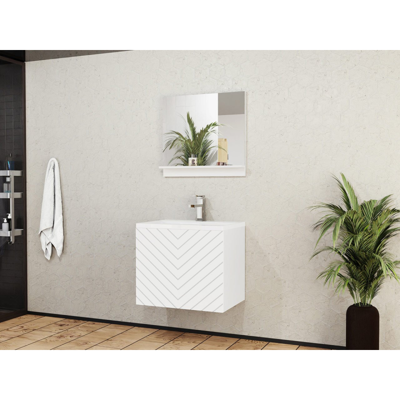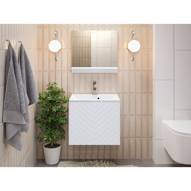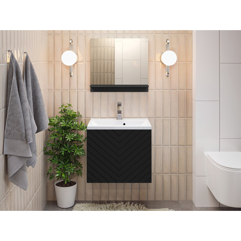 Ergonomický tvar umyvadla, které je součástí soupravy, zajišťuje pohodlí při každodenních hygienických činnostech. Závěsné zrcadlo s policí je nejen funkčním prvkem, ale také dekorativním akcentem.
