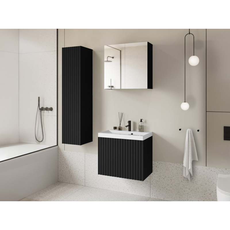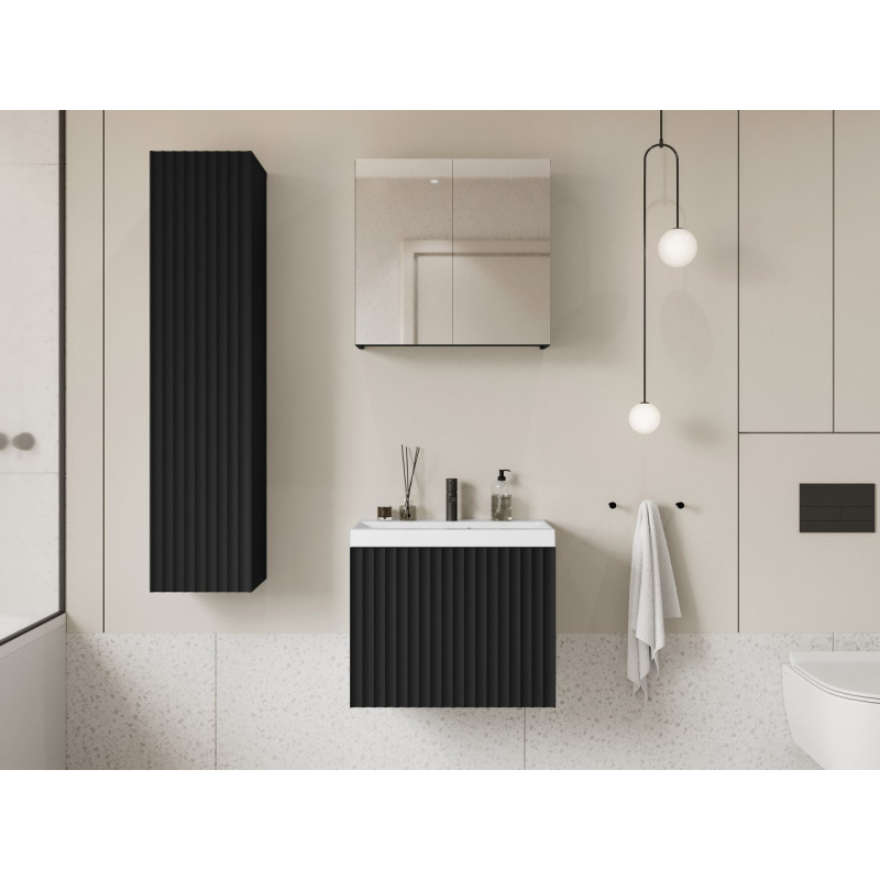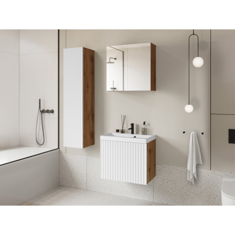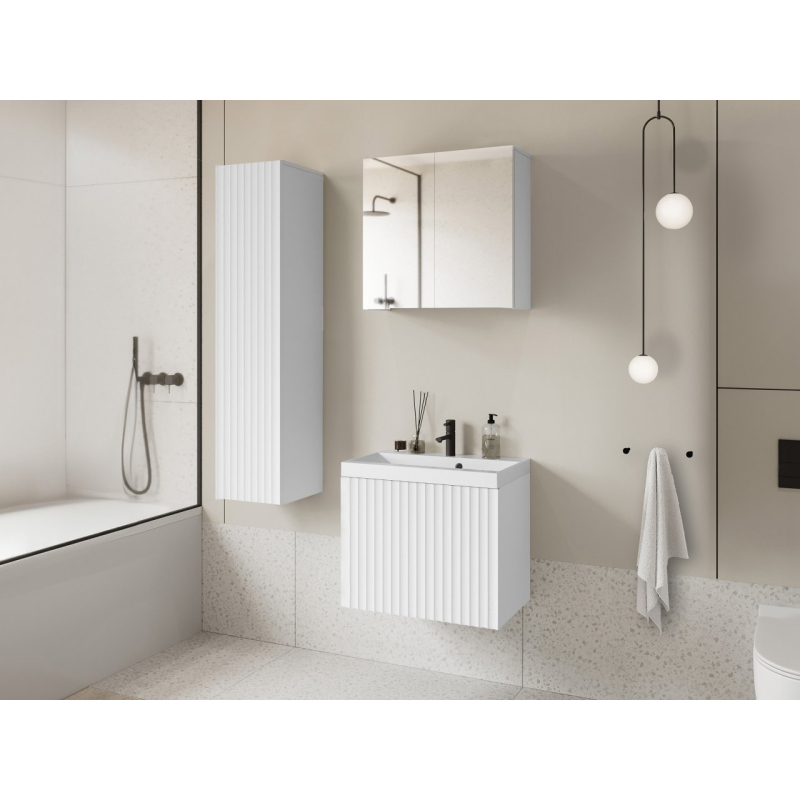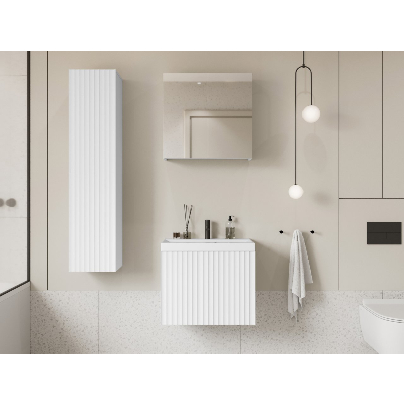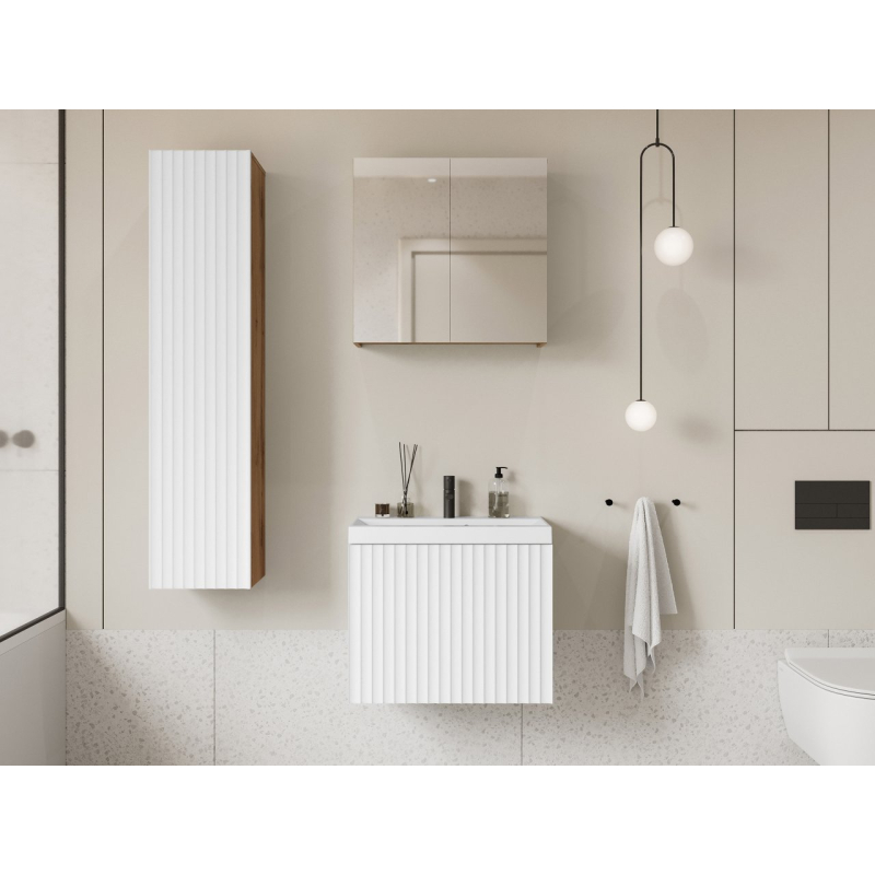 Hledáte elegantní koupelnový nábytek? Koupelnový nábytek Damysos I je spojením moderního designu, kvality a funkčnosti. Nabízejí dostatek místa pro organizaci ručníků, kosmetiky, vlasových doplňků a mnoha dalších věcí. Skvělou možností je zde závěsná skříňka se zrcadlovým čelem. Díky tomu získáte další úložný prostor a praktický dekorativní prvek. Zrcadlo podporuje vaši večerní a ranní péči.